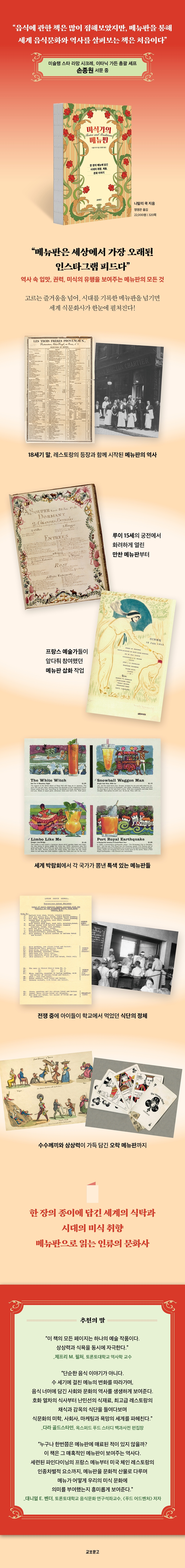 ¡¶¹Ì½Ä°¡ÀÇ ¸Þ´ºÆÇ¡·¿¡¼´Â ¿©¼¸ Àå¿¡ °ÉÃÄ ¿ì¸®°¡ °¢°¢ÀÇ Å׸¶¸¦ °¡Áø ¸Þ´ºÆÇÀ» ޱ¸ÇÑ´Ù. 1Àå ¡®´«ÀÌ Áñ°Å¿î ¸¸Âù¡¯¿¡¼´Â Àμâ¼ú°ú ¿¹¼úÀÌ °áÇÕµÈ ¸Þ´ºÆÇÀÌ ¸À»Ó¸¸ ¾Æ´Ï¶ó º¸´Â Àç¹Ìµµ ¼±»çÇÒ ¼ö ÀÖÀ½À» º¸¿©ÁØ´Ù. ´ç½Ã À¯¸íÇÑ È°¡µéÀÌ ¸Þ´ºÆÇ »ðÈ ÀÛ¾÷¿¡ Âü¿©ÇÑ À̾߱â¿Í ÇÔ²², ¸Þ´ºÆÇÀÌ ¿¹¼ú°ú ÀÏ»óÀÇ °æ°è¿¡ ³õÀÎ µ¶Æ¯ÇÑ »ç¹°À̾ú´Ù °É ¾Ë ¼ö ÀÖ°Ô µÈ´Ù. 2Àå ¡®±â³äǰÀÌ µÈ ¸Þ´ºÆÇ¡¯¿¡¼´Â À½½ÄÀ» °í¸£´Â ±â´É¿¡ ±×Ä¡Áö ¾Ê°í, ÇϳªÀÇ À¯¹°Ã³·³ ¼öÁýÇϰí, º¸Á¸ÇÏ´Â ¸Þ´ºÆÇ¿¡ ´ëÇØ ¸»ÇÑ´Ù. °³°³ÀÎÀÇ ¼ÒÀ¯°¡ µÉ ¼ö ÀÖ´Â ÇϳªÀÇ ¡®±ÂÁ¿Í °°Àº ¸Þ´ºÆÇÀÇ ¸Å·ÂÀ» ¿³º¼ ¼ö ÀÖ´Ù. 3Àå ¡®¼¼°è ¹«´ë·Î ¶°³ ¸Þ´º¡¯¿¡¼´Â ¼¼°è ¹Ú¶÷ȸÀÇ °³ÃÖ¿Í ¿©Çà »ê¾÷ÀÇ ¼ºÀå ¼Ó¿¡¼ ¸Þ´ºÆÇÀÌ ¾î¶»°Ô ±¹°¡ÀÇ Á¤Ã¼¼ºÀ» ´ã¾Æ³»°í, À½½ÄÀÇ ¼¼°èȸ¦ ½ÇÇöÇÏ°Ô µÇ¾ú´ÂÁö¸¦ ޱ¸ÇÑ´Ù. °¢±¹ÀÌ Ãß±¸ÇÏ´Â À½½Ä¹®È¿Í °³¼º ÀÖ´Â ¸Þ´ºµé±îÁö »ìÆìº¼ ¼ö ÀÖ´Ù. 4Àå ¡®¿ì¸® ¾ÈÀÇ ¾î¸° ½ÃÀýÀ» À§ÇÑ ¸Þ´º¡¯¿¡¼´Â ¾î¸°À̸¦ µ¶¸³ÀûÀÎ ¼ÒºñÀÚ·Î ÀνÄÇϱ⠽ÃÀÛÇÑ »çȸÀÇ º¯È¸¦ º¸¿©ÁØ´Ù. ¡®ÇØÇǹС¯ÀÇ ½ÃÃʶó°í º¼ ¼ö ÀÖ´Â ¾î¸°À̸¸À» À§ÇÑ ¸Þ´º¿Í ÇÔ²² »öÄ¥, ÆÛÁñ, ¼± ÀÕ±â µî ³îÀ̵µ±¸ÀÇ ¿ªÇÒ±îÁö ÇÏ´Â ¸Þ´ºÆÇµéÀ» ¼Ò°³ÇÑ´Ù. 5Àå ¡®°Ç°À» À§ÇÑ »õ·Î¿î ¹Ì½Ä¡¯Àº ½Ã´ë¿¡ µû¶ó ´Þ¶óÁö´Â ¡®°Ç°ÇÑ À½½Ä¡¯ÀÇ ±âÁذú ¹Ì½Ä°ú °Ç°ÀÌ ÀÌ¹Ì ¿À·¡ÀüºÎÅÍ ¹ÐÁ¢ÇÑ °ü°è·Î ÇÔ²² ¹ßÀüÇØ¿Â ÁöÁ¡À» ÃßÀûÇÑ´Ù. ¸¶Áö¸·À¸·Î 6Àå ¡®¿ì¸®¸¦ »ç·ÎÀâ´Â ¼ö¼ö²²³¢ ¸Þ´º¡¯¿¡¼´Â ÀϺη¯ È¥¶õÀ» ÁÖ°í, »ó»ó·ÂÀ» ÀÚ±ØÇÏ´Â ¸Þ´ºÆÇÀ» ¼Ò°³Çϸç, ¸Þ´ºÆÇÀÌ ÇϳªÀÇ ¡®¿À¶ô ÀåÄ¡¡¯·Î °Åµì³ª ¿ì¸®¿¡°Ô ¾î¶² »õ·Î¿î üÇèÀ» Á¦°øÇØÁÖ°í ÀÖ´ÂÁö¸¦ º¸¿©ÁØ´Ù.