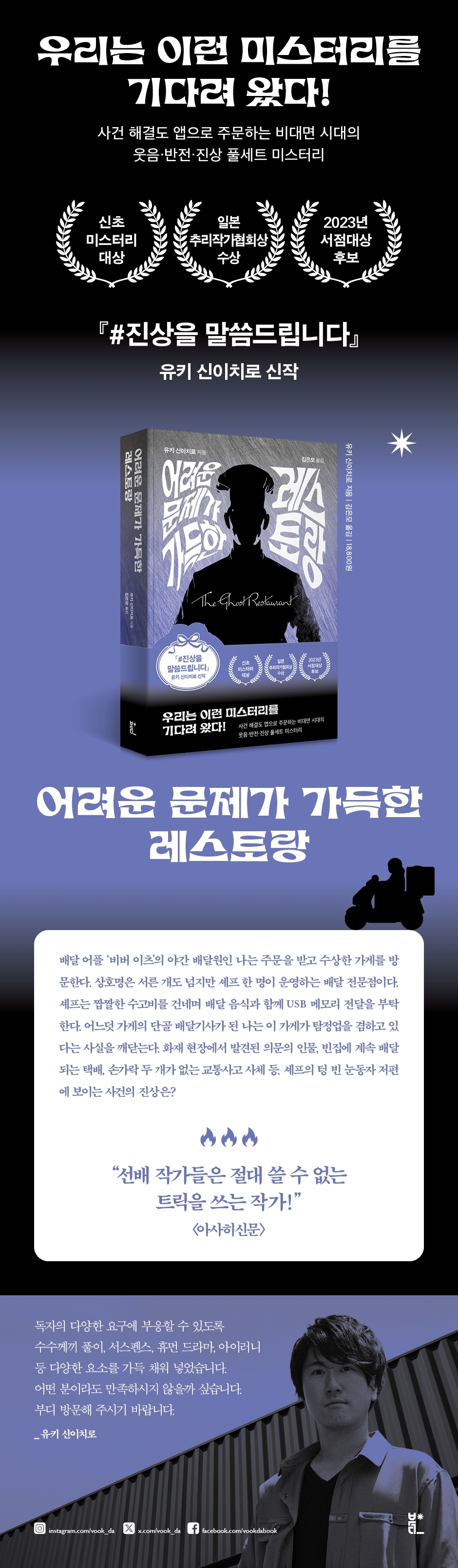 Áö±Ý ÀϺ»¿¡¼ °¡Àå ÁÖ¸ñ¹Þ´Â ¹Ì½ºÅ͸® ÀÛ°¡ À¯Å° ½ÅÀÌÄ¡·Î°¡ ¡º¾î·Á¿î ¹®Á¦°¡ °¡µæÇÑ ·¹½ºÅä¶û¡»À¸·Î µ¹¾Æ¿Ô´Ù. ±×´Â ¿¡µµ°¡¿Í ¶õÆ÷³ª ¾ÆÀ¯Ä«¿Í µ¥¾²¾ß µî ¿Õ³âÀÇ ¹Ì½ºÅ͸® ÀÛ°¡´Â ¾µ ¼ö ¾ø´Â À̾߱⸦ ¾²°í ½Í¾ú°í, À̸¦ À§ÇØ °¢Á¾ ¾îÇÃ, À¯Æ©ºê, SNS °°Àº Çö´ë ¹®¹°À» ¼ÒÀç·Î »ïÀÚ´Â »ý°¢¿¡ À̸£·¶´Ù°í ÇÑ´Ù. ÀÌ ¾ÆÀ̵ð¾î´Â ÀûÁßÇß´Ù. 2018³â ¡ºÀ̸§ ¾ø´Â º°ÀÇ ºñ°¡¡»·Î ½ÅÃÊ ¹Ì½ºÅ͸® ´ë»óÀ» ¼ö»óÇϸç È·ÁÇÏ°Ô µ¥ºßÇÑ ÀÌÈÄ ¡¸#È®»êÈñ¸Á¡¹(±¹³» ¹ßÇ¥¸íÀº ¡¸#ÆÛ¶ß·ÁÁÖ¼¼¿ä¡¹)À¸·Î ÀϺ»Ã߸®ÀÛ°¡Çùȸ»ó ´ÜÆí ºÎ¹®À» ¼ö»óÇß´Ù. ÀÌ ÀÛǰÀÌ ¼ö·ÏµÈ ¡º#Áø»óÀ» ¸»¾¸µå¸³´Ï´Ù¡»´Â ¹Ì½ºÅ͸® ¼Ò¼³·Î´Â µå¹°°Ô 2023 ÀϺ»¼Á¡´ë»ó Èĺ¸¿¡ ¿Ã¶ú°í, ¸¸È ¹× ¿µÈ·Îµµ ¸¸µé¾îÁ³´Ù.