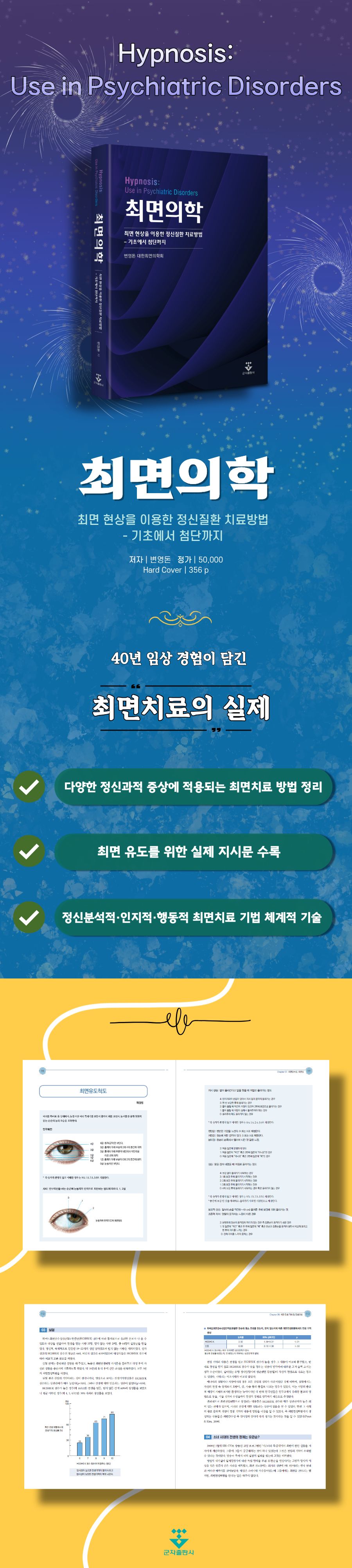 ÃâÆÇ»ç ¼ÆòÁö³ 40³â°£ÀÇ ¿¬±¸¿Í ÀÓ»ó °æÇèÀ» ¹ÙÅÁÀ¸·Î ÃÖ¸éÀÇ ±âº» °³³äºÎÅÍ ±¸Ã¼ÀûÀÎ À¯µµ ¹æ¹ý, ½ÇÁ¦ »ç¿ëµÇ´Â ¾Ï½Ã¹®°ú ´Ù¾çÇÑ Á¤½Å°úÀû Áõ»ó¿¡ ´ëÇÑ ÃÖ¸éÄ¡·á ¹æ¹ýÀ» ü°èÀûÀ¸·Î Á¤¸®ÇÑ Ã¥ÀÌ´Ù. ºÒ¾È, °øÆ÷, ¿ì¿ï, PTSD µî ¿©·¯ Áõ»ó¿¡ Àû¿ëµÇ´Â ½ÇÁ¦ ÃÖ¸éÄ¡·á °úÁ¤À» ±¸Ã¼ÀûÀ¸·Î Á¦½ÃÇϸç, Á¤½Å°Ç°ÀÇÇаú ÀÇ»ç¿Í ½É¸®Çеµ, Ãָ鿡 °ü½É ÀÖ´Â ÀϹÝÀο¡°Ô µµ¿òÀÌ µÇ´Â ³»¿ëÀ» ´ã°í ÀÖ´Ù. |