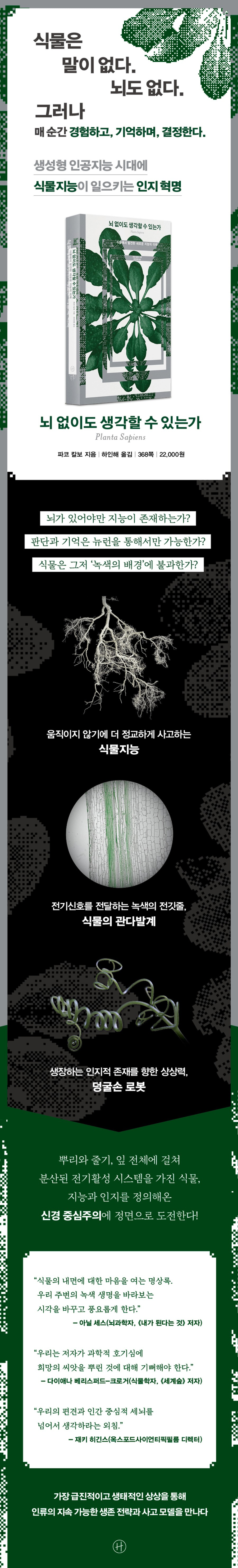 ¡°´õ´Â ½Ä¹° ¿¬±¸¸¦ ¿À·§µ¿¾È Áö¹èÇØ¿Â ºÐ·ùÇаú ¸í¸í¹ý¿¡¸¸ ¸Å´Þ·Á¼´Â ¾È µÈ´Ù. ½Äº°Ç¥¿Í Ãß»óÀûÀÎ ¹üÁÖ´Â °íÀ¯ÇÑ °³Ã¼·Î¼ ½Ä¹°ÀÌ Áö´Ï´Â Áö´É¿¡ ´ëÇØ ±×´ÙÁö ¸¹Àº °ÍÀ» ¾Ë·ÁÁÖÁö ¸øÇÑ´Ù.¡± - 2Àå ¡´½Ä¹°ÀÇ °üÁ¡ µû¶ó°¡±â¡µ ¡°Å丶Åä´Â ³ú¿¡ È¥¶õÀ» ÀÏÀ¸Å°´Â ÈÇй°ÁúÀ» ºÐºñÇØ Ãʽĵ¿¹°À» À°½Äµ¿¹°·Î º¯È½ÃŲ´Ù. °ø°ÝÀ» ¹ÞÀ¸¸é ¡®°æÈ£¿ø¡¯À» ºÎ¸£´Â ½Ä¹°°ú ³ª¹«µµ ÀÖ´Ù. °¡·É °ïÃæ¿¡°Ô À§ÇùÀ» ¹ÞÀ¸¸é °ø°ÝÇÏ´Â °ïÃæÀ» ¸ÔÀÌ·Î »ï´Â ´Ù¸¥ °ïÃæÀÇ °ü½ÉÀ» ²ø ¹°ÁúÀ» °ø±â·Î ÆÛÆ®¸®´Â °ÍÀÌ´Ù.¡± - 3Àå ¡´½Ä¹°ÀÇ Áö´ÉÀû Çൿ¡µ ¡°±â¾ïÀº ÇнÀÀ» ÅëÇØ¼¸¸ °¡´ÉÇÏ¸ç »ýÁ¸¿¡ ²À ÇÊ¿äÇÑ ´É·ÂÀÌ´Ù. ½Ä¹°ÀÌ °ú°Å¿¡ ¸¶ÁÖÇÑ »óȲ°ú ºñ½ÁÇÑ »óȲ¿¡ ³õÀÌ¸é ±×Àü °æÇèÀ» ¹ÙÅÁÀ¸·Î ÃÖ¼±ÀÇ ´ëÀÀÀ» ¼±ÅÃÇÏ´Â °æ¿ì´Â ¼ö¾øÀÌ ¸¹´Ù. °¡·É ÀÌÀü¿¡ °ø°ÝÀ» ¹Þ¾Ò´ø Ãʽĵ¿¹°À̳ª ±â»ýÃæÀÌ ´Ù½Ã ´Ù°¡¿À¸é ¹æ¾î ¼Óµµ°¡ »¡¶óÁø´Ù. ¶ÇÇÑ ÁÖº¯ ȯ°æÀÇ ¿Âµµ³ª ÈÇÐ Á¶¼ºÀÇ º¯È´Â 5~12¼¼´ë¿¡±îÁö ¿µÇâÀ» ¹ÌÄ£´Ù.¡± - 3Àå ¡´½Ä¹°ÀÇ Áö´ÉÀû Çൿ¡µ ¡°À¯±âü°¡ ÇÕ¼ºÇÏ´Â ´ëÇ¥ÀûÀÎ ¹°ÁúÀÎ Å׸£Æä³ëÀ̵å(Å׸£Æä³ëÀ̵带 ÀÌ·ç´Â ¹°Áú Áß ´ëºÎºÐÀº ¾ÆÀ̼ÒÇÁ·»ÀÌ´Ù)ÀÇ Á¤±³ÇÑ Á¶ÇÕ¹°»Ó ¾Æ´Ï¶ó º¥Á¦³ëÀ̵带 ºñ·ÔÇÑ ¿©·¯ Èֹ߼º À¯±âÈÇÕ¹°Àº Áß¿äÇÑ Á¤º¸¸¦ Á¦°øÇÑ´Ù. °¢°¢ÀÇ Èֹ߼º ¹°ÁúÀÌ ½Ä¹° ¾ð¾îÀÇ ±¸¼º ¿ä¼Ò°¡ µÈ´Ù. ´Ù½Ã ¸»ÇØ ¿©·¯ ´Ù¾çÇÑ À¯±âÈÇÕ¹°ÀÌ ·¹°í ºí·Ïó·³ ½×¿© ¡®´Ü¾î¡¯¸¦ ÀÌ·é´Ù. ÀϹÝÀûÀ¸·Î ½Ä¹°Àº 1,700°¡Áö°¡ ³Ñ´Â Èֹ߼º º¹ÇÕ¹°À» »ý¼ºÇØ Ç³¼ºÇÑ ¾îÈÖ¸¦ ±¸»çÇÑ´Ù.¡± - 3Àå ¡´½Ä¹°ÀÇ Áö´ÉÀû Çൿ¡µ ¡°½Å°æÀÌ ¾ø´Â ½Ä¹°¿¡¼´Â »Ñ¸®¿¡¼ ÀÙ±îÁö À̾îÁö´Â °üÀ¸·Î ÀÌ·ç¾îÁø °ü´Ù¹ß°è°¡ ¼ö¼Û¸Á ¿ªÇÒÀ» Çϸç Àü±â½ÅÈ£¸¦ Àü´ÞÇÑ´Ù. °ü´Ù¹ß°è´Â ¹°À» ²ø¾î ¿Ã¸®´Â ¹°°üºÎ¿Í ´çó·³ ºÐÇØµÈ ¹°ÁúÀ» ³ª¸£´Â ü°üºÎ·Î ³ª´¶´Ù. °ü´Ù¹ß°è´Â Àü±â Á¤º¸°¡ À塤´Ü°Å¸®¸¦ À̵¿ÇÏ´Â Åë·ÎÀÎ ½Å°æ°è¿Í ºñ½ÁÇÏ´Ù°í ÇÒ ¼ö ÀÖ´Ù. µ¿¹°ÀÇ ½Å°æÀÌ Àü±â½ÅÈ£¸¦ Àü´ÞÇÏ´Â Àü¼±À» ¶°¿Ã¸®´Â °Íó·³, °ü´Ù¹ß°è´Â ½Ä¹° ±â´ÉÀ» ÅëÁ¦Çϰí Á¶À²ÇÒ ¸ñÀûÀ¸·Î ´Ù¾çÇÑ ¼Ò½ÄÀ» Àü±â½ÅÈ£ÀÇ ÇüÅ·ΠÀü´ÞÇÏ´Â ³ì»öÀÇ Àü¼±°ú °°´Ù.¡± - 4Àå ¡´½Ä¹° ½Å°æ°è¡µ ¡°ÀνĿ¡´Â Ææ°ú Á¾ÀÌ, ¿öµåÇÁ·Î¼¼¼, °è»ê±â, ¿¹¼úÀÇ Àç·áó·³ ³»ºÎ ¼¼°è¿Í ¿ÜºÎ ¼¼°è, ´Ù½Ã ¸»ÇØ »ç°í¿Í Çൿ »çÀÌ¿¡ ÀÚ¸®ÇÑ ¿¬¼ÓÀûÀÎ °í¸®¿¡¼ »©³õÀ» ¼ö ¾ø´Â ºÎºÐÀÎ µµ±¸µéµµ Æ÷ÇԵȴÙ. ±×µéÀº ¡®Àھơ¯¸¦ ¾ïÁ¦µÇ°Å³ª Á¦ÇÑµÈ °³³äÀÌ ¾Æ´Ï¶ó »ý¹°°ú ¹«»ý¹°À» ¾Æ¿ì¸£´Â ´ë»óµé°ú ´º·±ÀÌ ÅëÇÕµÈ º¹ÇÕÀûÀÎ ³×Æ®¿öÅ©·Î ¹¦»çÇß´Ù.¡± - 5Àå ¡´½Ä¹°Àº »ý°¢Çϴ°¡¡µ ¡°»ì¾ÆÀÖ´Â Á¸Àç¿Í ±×·¯ÇÑ Á¸ÀçµéÀÇ ¸¶À½Àº ¹°¸®Àû ÇüÅÂ»Ó ¾Æ´Ï¶ó ÁÖº¯ ¼¼°è¿Íµµ ±ä¹ÐÇÏ°Ô ¿¬°üµÈ´Ù. Àײ¿ÀÇ ³ú¸¦ Áã¿¡ À̽ÄÇϸé Àײ¿¿¡¼ ÀÛ¿ëÇÏ´ø ¹æ½ÄÀ¸·Î ÀÛ¿ëÇÏÁö ¾ÊÀ¸¸ç, ¹«´ç¹ú·¹ÀÇ ÀǽÄÀ» ÇÇÆ©´Ï¾Æ·Î À̽ÄÇÒ ¼ö ¾ø´Ù.¡± - 6Àå ¡´»ýÅÂÀû ÀÎÁö¡µ ¡°´ÙÁß ³ú¸¦ Áö´Ñ ¹®¾îÀÇ À¯Ã¼Á¤¿ªÇÐÀû ÇüÅ´ °íÀ¯ÇÑ ÀǽÄÀÌ ¸ö Àüü¿¡ ºÐ»êµÈ µ¢±¼½Ä¹°ÀÇ À¯µ¿ÀûÀÎ ±¸Á¶¿Í ±×¸® ´Ù¸£Áö ¾Ê´Ù. ¹®¾î°¡ Æ÷À¯·ù¿Í ÀüÇô ´Ù¸¥ ½Å°æ°è¸¦ ÅëÇØ ¡®ÀǽÄÀû¡¯ ±â´ÉÀ¸·Î ¿©±æ ¼ö ÀÖ´Â ¿©·¯ ±â´ÉÀ» ¼öÇàÇϵíÀÌ, ½Ä¹°Àº 4Àå¿¡¼ ¾ð±ÞÇÑ ¡®½Ä¹° ½Å°æ°è¡¯¸¦ ÅëÇØ ºñ½ÁÇÑ ÀÇ½Ä ´É·ÂµéÀ» ¼öÇàÇÏ´Â °ÍÀÏ ¼ö ÀÖ´Ù. ½Å°æÀýÀÌ ÀÚ¸®ÇÑ ¹®¾îÀÇ ´Ù¸®µéÀº °ø°£À» ¿ÁßÇØ¼ Ž»öÇÏ´Â µ¢±¼½Ä¹°ÀÇ µ¢±¼¼Õ°ú ´Ù¸£Áö ¾Ê´Ù.¡± - 7Àå ¡´½Ä¹°ÀÌ µÈ´Ù´Â °Ç ¾î¶² °É±î?¡µ ¡°ÀÌÁ¦±îÁö Áß¿äÇÑ ³ó°æ ÀÛ¹°À̾ú´ø ½Ä¹°¿¡ ¾î¶² ÀÏÀÌ ÀϾ´ÂÁö »ý°¢Çغ¸ÀÚ. ³óÀÛ¹°Àº Àΰ£ÀÌ Á¤¼º²¯ Àϱº ¶¥¿¡¼ ÀÚ¶ó¸é¼ ÇØÃæÀ¸·ÎºÎÅÍ º¸È£¹Þ°í ´Ù¾çÇÑ ºñ·á¸¦ Á¦°ø¹ÞÀ¸¸ç Àü ¼¼°è·Î ÆÛÁ®³ª°¬°í, ±×µéÀÇ °æÀïÀÚ´Â Á¦ÃÊÁ¦·Î Á¦°ÅµÇ¾ú´Ù. Áö±ÝÀÇ ¹ÐÀ̳ª ¿Á¼ö¼ö Á¾µéÀº °ú°Å °í³ ¼Ó¿¡ »ì´ø Á¾º¸´Ù ÈξÀ À±ÅÃÇÑ »îÀ» »ê´Ù. Çö½Ç¿¡ ¾ÈÁÖÇÏ¸ç µÐ°¨ÇØÁ³Áö¸¸, ÀÌ´Â ±×·¡µµ µÇ±â ¶§¹®ÀÌ´Ù. Àΰ£ º¸È£ÀÚµéÀÌ ³óÀÛ¹°ÀÇ ÀÌÀÍÀ» º¸È£ÇØÁØ´Ù. ÇÏÁö¸¸ »ç½ÇÀº ³óÀÛ¹°ÀÌ ¿ì¸®¸¦ ±æµé¿´´Ù°íµµ ÇÒ ¼ö ÀÖ´Ù.¡± - 7Àå ¡´½Ä¹°ÀÌ µÈ´Ù´Â °Ç ¾î¶² °É±î?¡µ ¡°´ÙÀ©Àº ¡®´À³¦¡¯ÀÌ Àΰ£À» ±¸ºÐ Áþ´Â Ãß»óÀûÀΠƯ¡¿¡ ±×Ä¡Áö ¾Ê°í ÁøÈ¿¡ ¸Å¿ì Áß¿äÇÑ ¿ªÇÒÀ» ÇÑ´Ù°í ó