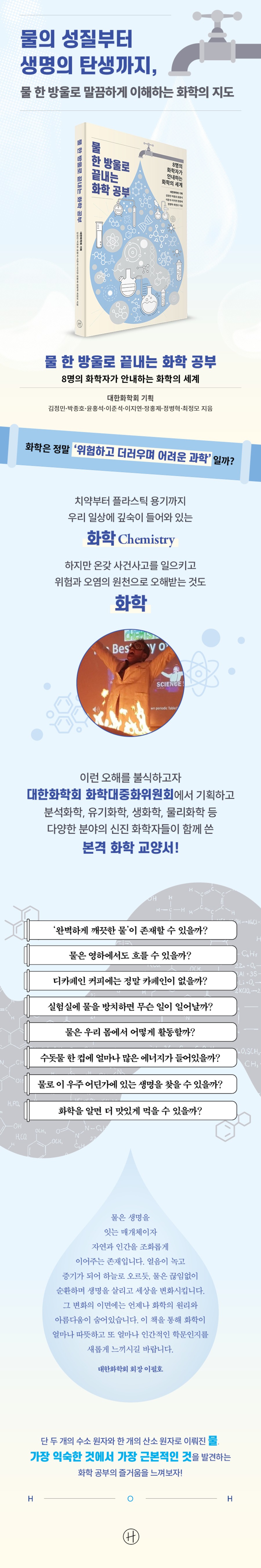 ´ëÇÑÈÇÐȸ ÈÇдëÁßÈÀ§¿øÈ¸°¡ ±âȹÇϰí ÇöÀå¿¡¼ Ȱ¹ßÇÏ°Ô ¿¬±¸Çϰí ÀÖ´Â ½ÅÁø ÈÇÐÀÚµéÀÌ ¾´ ¡¶¹° ÇÑ ¹æ¿ï·Î ³¡³»´Â ÈÇÐ °øºÎ¡·´Â ¸» ±×´ë·Î ¹° ÇÑ ¹æ¿ï·Î »î ¼ÓÀÇ ÈÇÐÀ» ÆîÃÄ º¸ÀδÙ. ÀÌ Ã¥Àº ¿ì¸®¿¡°Ô ¹«Ã´ Ä£¼÷ÇÒ »Ó¸¸ ¾Æ´Ï¶ó ¸ðµç »ý¸íÀÌ Á¸¼ÓÇÏ·Á¸é ¹Ýµå½Ã ÇÊ¿äÇÑ ¹°¿¡¼ ÈÇÐÀÇ ´Ùä·Î¿î ¸é¸ð¸¦ ÇϳªÇϳª »ìÇÉ´Ù. µ¶ÀÚµéÀº ¼ö¼Ò ¿øÀÚ µÎ °³¿Í »ê¼Ò ¿øÀÚ ÇÑ °³·Î ÀÌ·ïÁø, °£´ÜÇÑ ¹° ºÐÀÚ(H2O)°¡ µé¿©´Ùº¼¼ö·Ï ´Ü¼øÇÏÁö ¾ÊÀ½À» ¾Ë ¼ö ÀÖ´Ù.