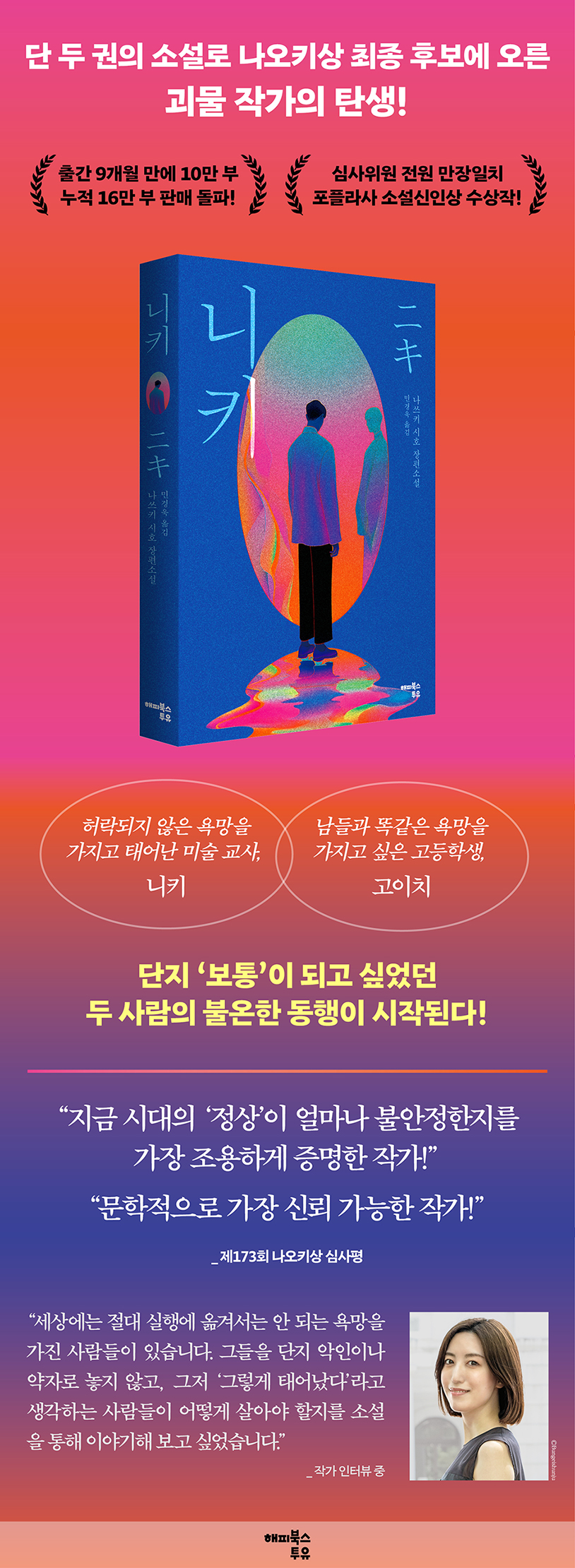 ÇöÀç ÀϺ» ¹®´Ü¿¡¼ °¡Àå ºû³ª´Â Àç´ÉÀ» Áö´Ñ ÀÛ°¡·Î Æò°¡¹Þ´Â ³ª¾²Å° ½ÃÈ£ÀÇ µ¥ºßÀÛ, ¡¶´ÏŰ¡·´Â ¡®¼Ò¾Æ¼º¾ÖÁõ¡¯À̶ó´Â ¼±ÃµÀûÀÎ ¼ºÁ¤Ã¼¼ºÀ» Áö´Ñ ³²ÀÚ°¡, ÀÚ½ÅÀÇ ¼ºÀû ¿å¸ÁÀ» °¡µÐ ä »ì¾Æ°¡´Â À̾߱⸦ ´Ù·é ÆÄ°ÝÀûÀÎ ¼³Á¤À¸·Î ¾²¿©Áø ¼Ò¼³ÀÌ´Ù. Ãâ°£ Ãʱâ, Ãæ°ÝÀû ¼ÒÀçÀÇ »ç¿ëÀ¸·Î Æò´Ü°ú µ¶ÀÚµé »çÀÌ¿¡¼ ³í¶õÀÇ Áß½ÉÀÌ µÇ¾úÁö¸¸, ¡°»çȸÀû ¹®Á¦¿¡ ´ëÇÑ ºñÆÇÀû ½Ã°¢À» Á¦°øÇÏ¿© µ¶ÀÚÀÇ ÀÎ½Ä ¼¼°è¸¦ È®ÀåÇÏ´Â ¼Ò¼³ÀÇ »çȸÀû ¼ø±â´É¡±À̶ó´Â ±àÀûÀûÀÎ Æò°¡·Î ÀüȯµÇ¸é¼, Ÿ ÃâÆÇ»ç ÆíÁýÀÚµéÀ» ½ÃÀÛÀ¸·Î, ¼Á¡ ¹× ¾÷°è Á¾»çÀÚµéÀÇ ¿¬ÀÌÀº È£Æò°ú ÃßõÀÌ À̾îÁ³´Ù. ±× °á°ú Ãâ°£ 9°³¿ù ¸¸¿¡ 10¸¸ ºÎ, ´©Àû 16¸¸ ºÎ¸¦ ±â·Ï, ±×ÇØ °¢ ¼Á¡ º£½ºÆ®¼¿·¯ ¼øÀ§¸¦ µ¶½ÄÇϸç, ÀϺ» Àü¿ª¿¡ ³ª¾²Å° ½ÃÈ£¶ó´Â ±«¹° ½ÅÀÎ ÀÛ°¡ÀÇ µîÀåÀ» ¾Ë·È´Ù.