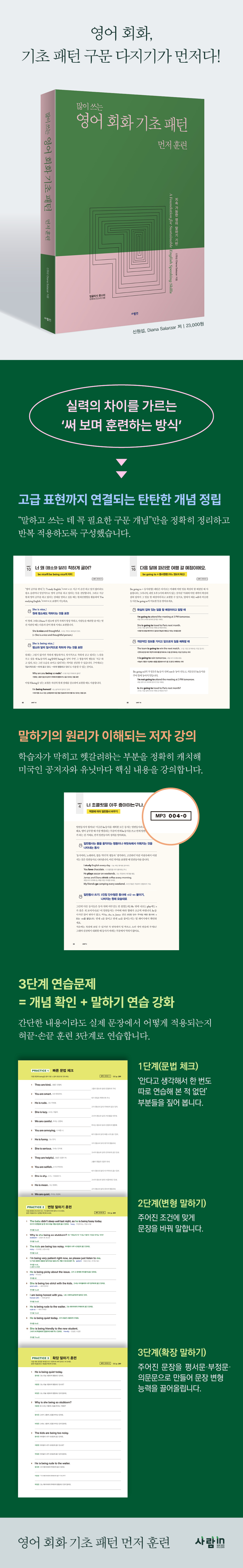 ¿µ¾î ¸»¹®À» Æ®´Â µ¥ °¡Àå ÁÁÀº ¹æ¹ý Áß Çϳª´Â ÆÐÅÏ ÈÆ·ÃÀÌ´Ù. ÇÏÁö¸¸ ÆÐÅϸ¸À¸·Î ¸»ÇÏ´Ù º¸¸é ¾î´À ¼ø°£ Ç¥ÇöÀÌ ¸·È÷°Å³ª ÀÀ¿ëÀÌ ¾î·Á¿öÁö´Â ±¸°£ÀÌ ¿Â´Ù. ÀÌ ÇѰ踦 °ÞÁö ¾ÊÀ¸·Á¸é, °á±¹ ¿µ¾î ±¸¹® ±âÃʰ¡ ÅºÅºÇØ¾ß ÇÑ´Ù. ¿µ¾î¿¡ Àڽоø´ø ÇнÀÀÚ¿¡¼ À¯Ã¢ÇÑ ¿µ¾î ±¸»çÀÚ°¡ µÈ ÀúÀÚ´Â, ÀÌ·± Á¤Ã¼ ±¸°£À» ¹þ¾î³ª±â À§ÇØ ¹«¾ùÀ» °ø·«ÇØ¾ß ÇÏ´ÂÁö ¾Ë°í ÀÖÀ¸¸ç, ±× ÇÙ½ÉÀ» ¡´¿µ¾î È¸È ±âÃÊ ÆÐÅÏ ¸ÕÀú ÈÆ·Ã¡µ¿¡ ´ã¾Ò´Ù. ÀÌ Ã¥Àº 3´Ü°è ÈÆ·ÃÀ» ÅëÇØ ¡®¾Ë°í´Â ÀÖÁö¸¸, ¸»·Î´Â ¸ø ÇÏ´ø¡¯ ±¸¹® ±âÃʸ¦ ±ÙÀ° ÈÆ·Ãó·³ ÀÍÈ÷°Ô ÇÑ´Ù. ´«À¸·Î¸¸ º¸¸ç Áö³ªÄ¡´ø ³»¿ëÀ» ¼ÕÀ¸·Î ½á º¸°í ÀÔÀ¸·Î ¸»ÇØ º¸´Â ¿¬½ÀÀ» ÅëÇØ ÆÐÅÏ ÇнÀÀÇ ÀüÃʱâÁö¸¦ È®½ÇÈ÷ ´ÙÁø´Ù.