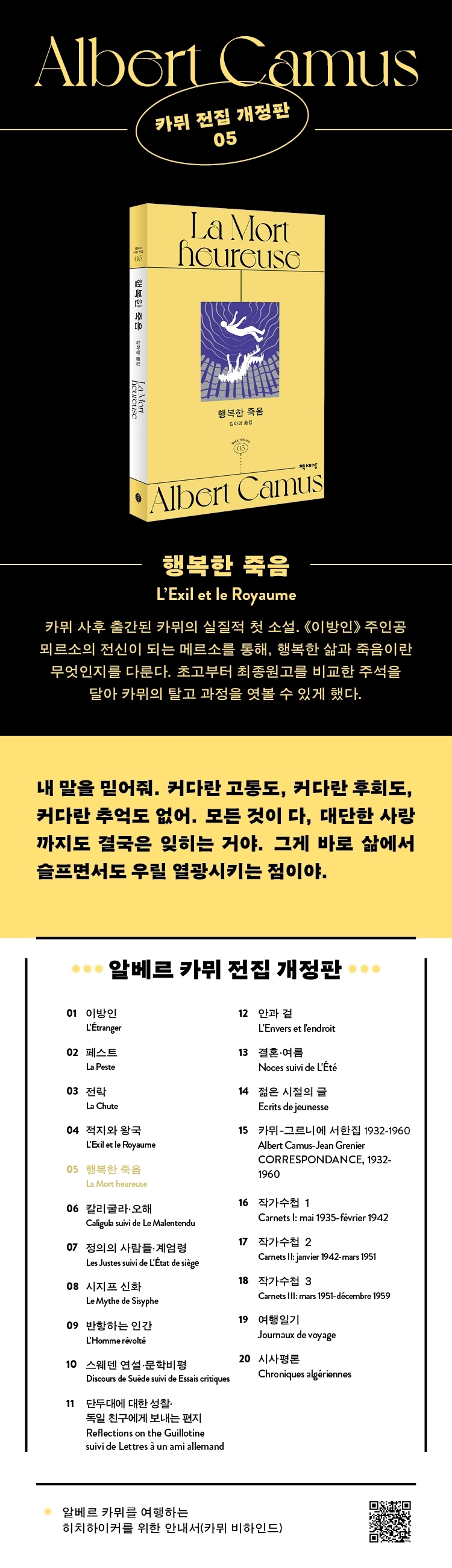 Ä«¹¿¸¦ ´Ü¼û¿¡ ÇÁ¶û½º ¹®´Ü°èÀÇ Çý¼ºÀ¸·Î ¸¸µç ¡¶À̹æÀΡ· ÀÌÀü¿¡ ¡¶ÇູÇÑ Á×À½¡·ÀÌ ÀÖ¾ú´Ù. 1936³â~1938³â¿¡ ÁýÇÊ ¹× ±¸»óµÈ ÀÌ ¼Ò¼³Àº Ä«¹¿ÀÇ ¼¶ø ¼Ó¿¡ ¹¯Çô ÀÖ´Ù°¡ Ä«¹¿°¡ ºÒÀÇÀÇ »ç°í·Î ¼¼»óÀ» ¶°³ª°í 11³â ÈÄ, Ä«¹¿ÀÇ À¯Á·°ú °¥¸®¸¶¸£ ÃâÆÇ»çÀÇ ³íÀÇ ³¡¿¡ ºûÀ» º¸°Ô µÈ´Ù. ÀÌ¿¡ °¥¸®¸¶¸£ ÆíÁýÀÚ´Â ÀÌ·¸°Ô ¹àÇû´Ù. ¡°¿ì¸®°¡ ÇÑ ÀÛ°¡¸¦ »ç¶ûÇϰųª ±×ÀÇ ¼¼°è¸¦ ±íÀÌ ÀÖ°Ô ¿¬±¸ÇÒ ¶§´Â ÈçÈ÷ ±×¿¡ °üÇÑ °ÍÀº ¹«¾ùÀÌ°Ç ´Ù ¾Ë°í ½Í¾îÇÏ´Â ¹ýÀÌ´Ù. (Áß·«) ¿¹¸¦ µé¾î ¡¶ÇູÇÑ Á×À½¡·À» ÀаíÀÚ ÇÏ´Â µ¶Àڵ鿡°Ô ±×°ÍÀ» ÀÐÀ» ¼ö ÀÖ´Â ±âȸ¸¦ ÁÖÁö ¾Ê´Â´Ù´Â °ÍÀº Áö³ªÄ£ ¿ù±ÇÀ̶ó°í ¿©°ÜÁ³´Ù.¡±