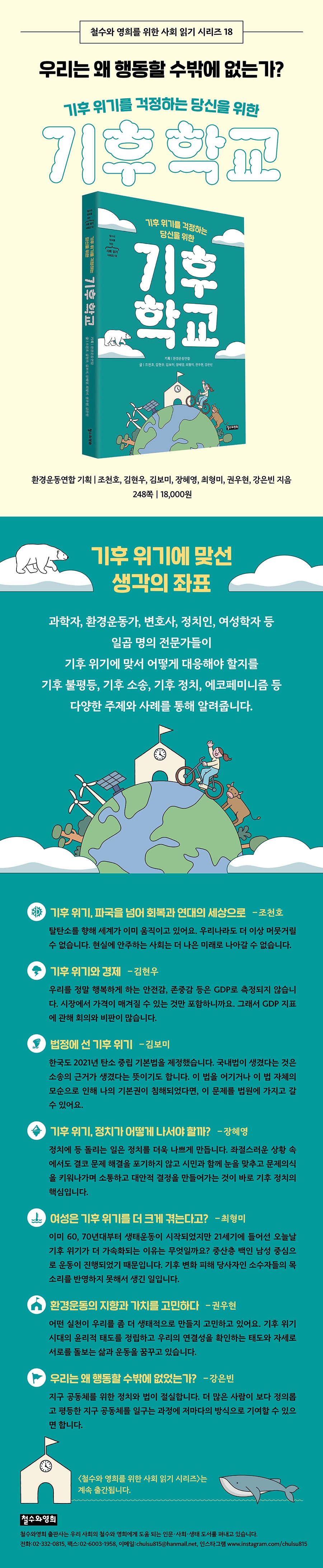 ÀÌ Ã¥Àº °úÇÐÀÚ, ȯ°æ¿îµ¿°¡, º¯È£»ç, Á¤Ä¡ÀÎ, ¿©¼ºÇÐÀÚ µî Àϰö ¸íÀÇ Àü¹®°¡µéÀÌ ±âÈÄ À§±â¿¡ ¸Â¼ ¾î¶»°Ô ´ëÀÀÇØ¾ß ÇÒÁö¸¦ ±âÈÄ ºÒÆòµî, ±âÈÄ ¼Ò¼Û, ±âÈÄ Á¤Ä¡, ¿¡ÄÚÆä¹Ì´ÏÁò µî ´Ù¾çÇÑ ÁÖÁ¦¿Í »ç·Ê¸¦ ÅëÇØ ¾Ë·ÁÁØ´Ù.