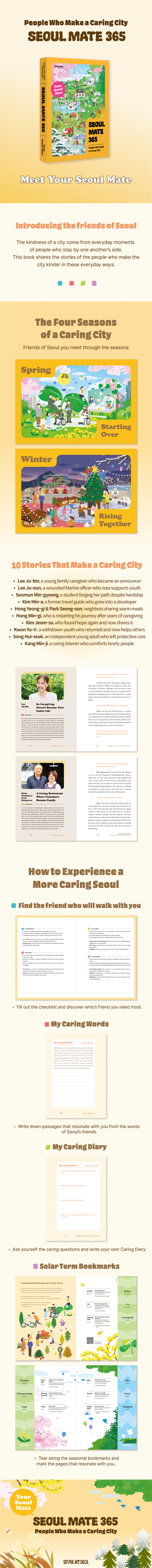 To help you experience a more caring Seoul, the book offers: My Caring Words, where you write down passages that resonate with you; My Caring Diary, where where simple questions invite reflection on your own moments of care; and Companionship Through the 24 Solar Terms, bookmarks that capture how our daily lives and Seoul¡¯s stories of companionship shift with the seasons. These pages allow the caring moments held within Seoul to gently seep into your day.