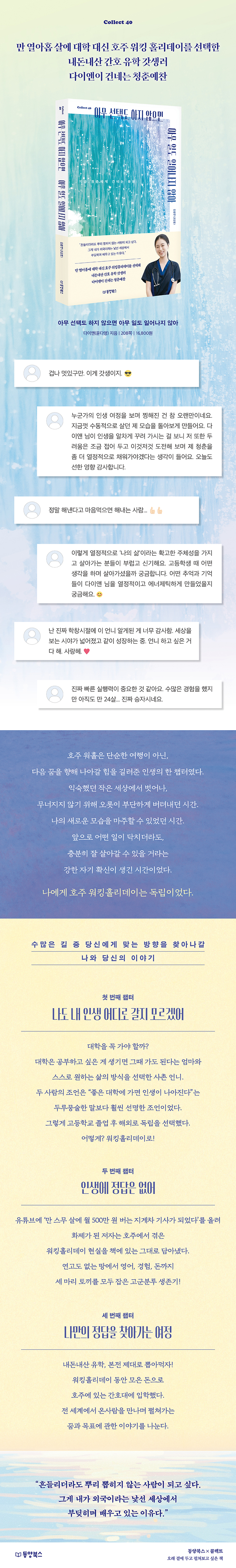 ±×·¯´Ï±î, ³»°¡ ÇÏ°í ½ÍÀº °øºÎ°¡ ÀÖ¾î¼ °ú¸¦ ¸ÕÀú Á¤ÇÏ°í ´ëÇÐÀ» Á¤ÇÏ´Â °Ô ¾Æ´Ï¶ó, ´ëÇÐÀ» Á¤ÇÏ°í °ú¸¦ Á¤Ç϶ó´Â °ÅÁÒ? --- p.015 ¡¸²À ´ëÇÐÀ» °¡¾ß ÇØ¿ä?¡¹Áß¿¡¼ ³»°¡ ÇöÀç »óȲ¿¡ ´ëÇÑ ºÒ¸¸ÀÌ À־ ¾Æ¹«°Íµµ ÇÏÁö ¾Ê´Â´Ù´Â °Ç ±×´ë·Î ±× »óȲÀ» ¹Þ¾ÆµéÀ̱â·Î ¼±ÅÃÇÑ °ÍÀÌ´Ù. ³»°¡ Áö±Ý óÇÑ È¯°æÀÌ, »óȲÀÌ, Àΰ£°ü°è°¡ ¸¶À½¿¡ µéÁö ¾Ê´Â´Ù¸ç ºÒÆòÇØµµ ¹Ù²î´Â °ÍÀº ¾ø´Ù. ±×Àú ±×·¯ÇÑ °ÍÀ» °ßµð±â·Î ¼±ÅÃÇÑ °ÍÀÌ´Ù. ¹Ù²î°í ½Í´Ù¸é ´Éµ¿ÀûÀ¸·Î ³»°¡ ¿øÇÏ´Â ¸ð½À, ȯ°æÀ» º¸¸ç ÀÛÀº ¼±ÅúÎÅÍ ¹Ù²ã ³ª°¡¸é µÈ´Ù. °á±¹ ³»°¡ ¼±ÅÃÇÏÁö ¾ÊÀ¸¸é ¾Æ¹«°Íµµ ´Þ¶óÁöÁö ¾ÊÀ» °ÍÀ̱⿡ ¿ì¸®´Â Ç×»ó ÃÖ¼±ÀÇ ¼±ÅÃÀ» ÇØ¾ß ÇÑ´Ù. --- p.055 ¡¸±¹³» 24½Ã°£ ¼¿ÇÁ ¾îÇп¬¼ö¡¹Áß¿¡¼ ÄÚÆ°Áø¿¡¼ÀÇ ÀÏÀº ³ª¿¡°Õ ´Ü¼øÇÑ ³ëµ¿, ±× ÀÌ»óÀÇ Àǹ̿´´Ù. ƯÈ÷ Àåºñ ±â»ç·Î ä¿ëµÆ´Ù´Â °Ç, ¾ðÁ¨°¡ ¡®±×·± µ¥´Â ¿©ÀÚ Àß ¾È »Ì¾Æ¿ä¡¯¶ó°í Çß´ø ¸»¿¡ ´ç´çÈ÷ ³»³õÀ» ¼ö ÀÖ´Â ´ë´äÀÇ ¿Ï¼ºÀ̾ú±â¿¡, ÀÌ °æÇèÀ» ¿µ»óÀ¸·Î ³²±â°í ½Í¾ú´Ù. ±×·¸°Ô ³» ÇϷ縦 ¿µ»óÀ¸·Î ´ã¾Æ³Â´Ù. --- p.092 ¡¸¸¸ ½º¹« »ì¿¡ ¿ù 500¸¸ ¿ø ¹ö´Â Áö°ÔÂ÷ ±â»ç°¡ µÇ¾ú´Ù¡¹Áß¿¡¼ Çѱ¹¿¡¼ÀÇ ³ª´Â Á¤ÇØÁø ±æ¿¡¼ ¹þ¾î³ »ç¶÷¾úÁö¸¸, À̰÷¿¡¼´Â ¼ö¸¹Àº ±æ Áß Çϳª¸¦ ¼±ÅÃÇÑ »ç¶÷ÀÏ »ÓÀ̾ú´Ù. ±× »ç½Ç¸¸À¸·Îµµ Å« À§¾ÈÀÌ µÇ¾ú´Ù. Àλý¿¡ Á¤ÇØÁø ´äÀÌ ¾ø¾ú´Ù. ³× Àλýµµ Á¤´äÀÌ°í ³» Àλýµµ Á¤´äÀÌ´Ù. ÇູÇϱ⸸ Çϸé, ±×°É·Î µÈ °Å´Ù. ±×°Ô Á¤´äÀÌ´Ù. --- p.109 ¡¸Àü ¼¼°è »ç¶÷µéÀÌ À̰÷¿¡ ¸ðÀÎ ÀÌÀ¯¡¹Áß¿¡¼ ³ª¸¦ ÇѰè Áþ´Â ¼± µûÀ§´Â ³ë¶¯Å¥´Ù. ¶Û ¼ö ÀÖ´Â µ¥±îÁö, ¾Æ´Ï, ¶Û ¼ö ÀÖ´Ù°í ¹Ï´Â °Í ÀÌ»ó±îÁöµµ ¶Ù¾îº¸°í ½ÍÀ¸´Ï±î. ³ªÀÇ ÇѰè´Â ³²ÀÌ ¾Æ´Ï¶ó ½º½º·Î¿¡°Ô ´Þ¸° °ÍÀÌ´Ù. --- p.121 ¡¸¹é ¸¶µð ¸»º¸´Ù ÇൿÀ¸·Î º¸¿©ÁÖ´Â °Ô ºü¸£´Ï±î¡¹Áß¿¡¼ È£ÁÖ ¿öȦÀº ´Ü¼øÇÑ ¿©ÇàÀÌ ¾Æ´Ñ, ´ÙÀ½ ²ÞÀ» ÇâÇØ ³ª¾Æ°¥ ÈûÀ» ±æ·¯ÁØ ÀλýÀÇ ÇÑ Ã©ÅÍ¿´´Ù. Àͼ÷Çß´ø ÀÛÀº ¼¼»ó¿¡¼ ¹þ¾î³ª, ¹«³ÊÁöÁö ¾Ê±â À§ÇØ ¿À·ÔÀÌ ºÎ´ÜÇÏ°Ô ¹öÅß³»´ø ½Ã°£. ³ªÀÇ »õ·Î¿î ¸ð½ÀÀ» ¸¶ÁÖÇÒ ¼ö ÀÖ¾ú´ø ½Ã°£. ¾ÕÀ¸·Î ¾î¶² ÀÏÀÌ ´ÚÄ¡´õ¶óµµ, ÃæºÐÈ÷ Àß »ì¾Æ°¥ ¼ö ÀÖÀ» °Å¶ó´Â °ÇÑ ÀÚ±â È®½ÅÀÌ »ý±ä ½Ã°£À̾ú´Ù. ³ª¿¡°Ô È£ÁÖ ¿öŷȦ¸®µ¥ÀÌ´Â µ¶¸³À̾ú´Ù. --- p.135 ¡¸È£ÁÖ ¿öȦÀÌ ³» Àλý¿¡ ³²±ä °Íµé¡¹Áß¿¡¼ ½½ÆÛÇϴ ȯÀÚÀÇ ¼ÕÀ» ²À Àâ¾ÆÁÖ°í, ÇÊ¿äÇÑ Äɾî¿Í ¼ºñ½º¸¦ ¿¬°áÇØ ÁÙ ¼ö ÀÖ´Â »ç¶÷ÀÌ µÈ´Ù´Â °Í. °£È£¸¦ ¼±ÅÃÇϱæ Á¤¸» ÀßÇß´Ù´Â »ý°¢ÀÌ µé¾ú´Ù. --- p.191 ¡¸°£È£°¡ ³» õÁ÷Àΰ¡ºÁ¡¹Áß¿¡¼ »ì´Ù º¸¸é ½º½º·Î°¡ ¹Ì·ÃÇÏ°í ¹Ùº¸ °°¾Æ ½Ç¸Á½º·¯¿î ³¯µµ ÀÖ´Ù. ±×·¡µµ ±¦Âú´Ù. ¿Ïº®ÇÒ ÇÊ¿ä´Â ¾ø´Ù. Á¶±Ý ¹Ùº¸ °°°í ¹Ì·ÃÇÑ ¼±Åà ¼Ó¿¡¼¸¸ ¾òÀ» ¼ö ÀÖ´Â ¹è¿òÀÌ ÀÖ´Ù. ±úÁ® ºÁ¾ß ´Ù½Ã ºÙÀÌ´Â ¹ýÀ» ¹è¿î´Ù. ±úÁö´Â °ÍÀÌ µÎ·Á¿ö ¾Æ¹« ¼±Åõµ ÇÏÁö ¾ÊÀ¸¸é ¾Æ¹« Àϵµ ÀϾÁö ¾Ê´Â´Ù. ±×·¯´Ï ÇÒ ¼ö ¾ø´Â ÀÌÀ¯°¡ ¾Æ´Ï¶ó ÇÒ ¼ö ÀÖ´Â ÀÌÀ¯¸¦ ¼¼¸ç ¾ÕÀ¸·Î ³ª¾Æ°¡ÀÚ --- p.207 ¡¸»îÀÇ ÃÖÁ¾ ¸ñÀûÁö ±×¸®°í ¸ñÇ¥¡¹Áß¿¡¼ ÃâÆÇ»ç ¼ÆòÀλý¿¡ Á¤´äÀº ¾ø¾î! ³ª¸¸ÀÇ Á¤´äÀ» ã¾Æ°¡´Â ¿©Á¤ÀÇ ±â·Ï!
