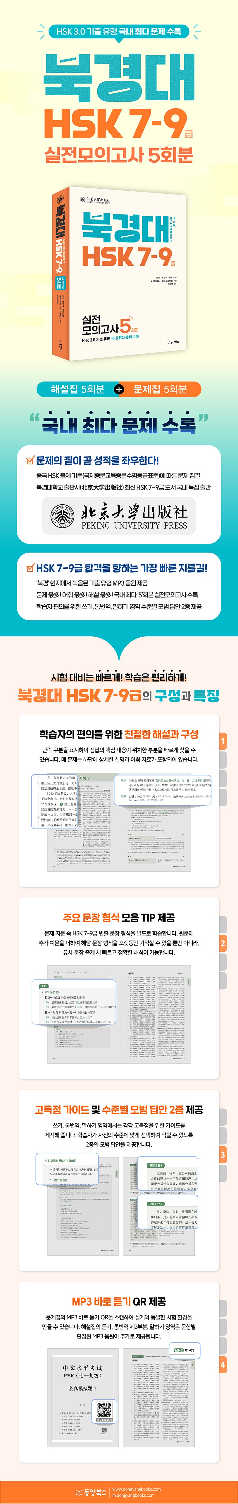 ½ÇÁ¦ Áß±¹ ±³À°ºÎ¿¡¼ Á¦½ÃÇÑ HSK µî±Þº° Ç¥ÁØ ³»¿ëÀ» ±â¹ÝÀ¸·Î ÁýÇÊµÈ ¡ººÏ°æ´ë HSK 7~9±Þ ½ÇÀü¸ðÀǰí»ç 5ȸºÐ¡»Àº ±¹³» ÃÖ´Ù ¹®Á¦, ÇØ¼³, ¾îÈÖ¸¦ ¼ö·ÏÇϰí ÀÖ½À´Ï´Ù. HSK 7-9±Þ Àü¹® °»çµéÀÌ ÀüÇÏ´Â ²Ä²ÄÇÑ ¹®Á¦ ÇØ¼³°ú °íµæÁ¡ ºñ¹ýÀ» ÅëÇØ °¡Àå ½±°í ºü¸£°Ô ÇÕ°ÝÇÒ ¼ö ÀÖµµ·Ï µµ¿ÍÁÝ´Ï´Ù. ¶ÇÇÑ ±âÃâ À¯Çü MP3 À½¿ø¿¡ ¹®Ç׺° ºÐÇÒ MP3 À½¿øÀ» Ãß°¡·Î Á¦°øÇÏ¿© ÀÀ½ÃÀÚÀÇ µµ¼ ÇнÀ ÆíÀǼºÀ» ³ô¿´½À´Ï´Ù.