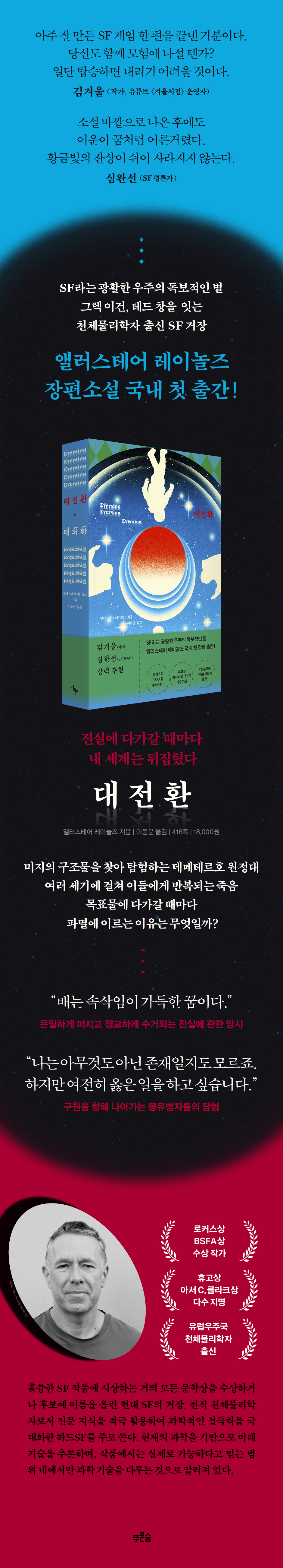 ¡®Çϵå SFÀÇ °ÅÀ塯, ¡®½ºÆäÀ̽º ¿ÀÆä¶óÀÇ ´ë°¡¡¯ ¾Ù·¯½ºÅ×¾î ·¹À̳îÁîÀÇ ½ÅÀÛ ¼Ò¼³ ¡¶´ëÀüȯ¡·ÀÌ Çª¸¥½£¿¡¼ Ãâ°£µÆ´Ù. ÀÌ Ãâ°£ÀÌ ÀÇ¹Ì ÀÖ´Â ÀÌÀ¯´Â ±×°¡ SF ÀÛ°¡·Î¼ ÀÌ·é ¼ºÃë¿¡ ºñÇØ ¾ÆÁ÷ Çѱ¹ÀÇ µ¶Àڵ鿡°Ô Á¦´ë·Î ¼Ò°³µÈ ÀûÀÌ ¾ø±â ¶§¹®ÀÌ´Ù. ±×´Â ÇØ¿Ü µ¶ÀÚµé »çÀÌ¿¡¼ ±×·º À̰Ç, Å×µå â¿¡ ¹ö±Ý°¡´Â ¸Å·ÂÀûÀÎ ÀÛ°¡·Î ÅëÇϸç, ÈÞ°í»ó?¾Æ¼ C. Ŭ¶óÅ©»ó µî À¯¸íÇÑ ¹®ÇÐ»ó¿¡ ´Ùȸ Áö¸íµÇ°Å³ª ·ÎÄ¿½º»ó?BSFA»ó µîÀ» ¼ö»óÇÏ¸ç Æò´Ü¿¡¼ °íÀ¯ÇÑ ¹®ÇмºÀ» ÀÎÁ¤¹Þ¾Æ ¿Ô´Ù. ±×°¡ ¾à 30³â µ¿¾È ¹ßÇ¥ÇØ ¿Â ´Ù¾çÇÑ ÀÛǰ Áß¿¡¼µµ ¡¶´ëÀüȯ¡·Àº ÀåÀÎÁ¤½ÅÀÌ µ¸º¸ÀÌ´Â ¼öÀÛÀÌÀÚ »õ·Î¿î ÀüȯÀÌ´Ù. ÀüÁ÷ õü¹°¸®ÇÐÀڷμÀÇ Àü¹® Áö½ÄÀº ¸»ÇÒ °Íµµ ¾ø°í, Á¤±³ÇÏ°í ¸ÅȤÀûÀÎ ¼¼°è°ü, Âü½ÅÇÑ Ç÷Ô, Àΰ£ Á¸Àç¿¡ ´ëÇÑ °úÇÐöÇÐÀûÀÎ °í³ú, ¼¼¹ÐÇÏÁö¸¸ ³¶ºñ ¾ø´Â ¹¦»ç°¡ ÇÑ ÀÛǰ¿¡ ÃÑÁýÇÕÇß´Ù. ¿©±â¿¡ SF Æò·Ð°¡ ½É¿Ï¼±ÀÇ Ç³ºÎÇϰí ÀÔüÀûÀÎ ÇØ¼³ÀÌ ´õÇØÁ® ¿©¿îÀº ´õ¿í ±æ¾îÁö°í Àǹ̴ ´õ¿í ±í°Ô ´Ù°¡¿Â´Ù. ¾Ù·¯½ºÅ×¾î ·¹À̳îÁîÀÇ À̹ø ½ÅÀÛÀº SF¸¦ »ç¶ûÇÏ´Â Çѱ¹ µ¶Àڵ鿡°Ô »õ·Î¿î SF °ÅÀåÀÇ ÀÛǰ ¼¼°è¸¦ °æÇèÇÒ ¼ö ÀÖ´Â ¸ÅȤÀûÀÎ ±âȸ´Ù.