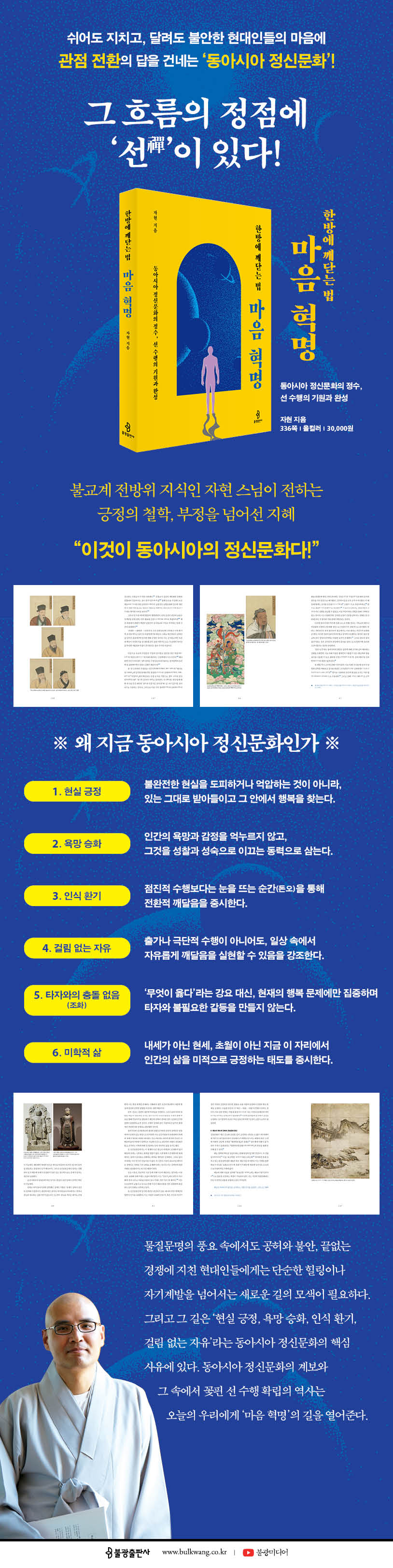 ºÒ±³°è Àü¹æÀ§ Áö½ÄÀÎ ÀÚÇö ½º´ÔÀÌ ÃÖ±Ù ¹ßÇ¥ÇÑ ¿©´ü ¹øÂ° ÇÐÀ§³í¹®(¹Ú»ç)À» ¹ÙÅÁÀ¸·Î ½Å°£ ¡ºÇѹ濡 ±ú´Ý´Â ¹ý, ¸¶À½ Çõ¸í¡»À» Ãâ°£Çß´Ù. ÀÌ Ã¥Àº µ¿¾Æ½Ã¾Æ Á¤½Å¹®È¿Í ¼öÇà(¼ö·Ã)ÀÇ »Ñ¸®, ±×¸®°í ±×°ÍÀÌ Áö´Ñ Çö´ëÀû Àǹ̸¦ Á¾ÇÕÀûÀ¸·Î Á¶¸ÁÇÑ Ã¥ÀÌ´Ù.