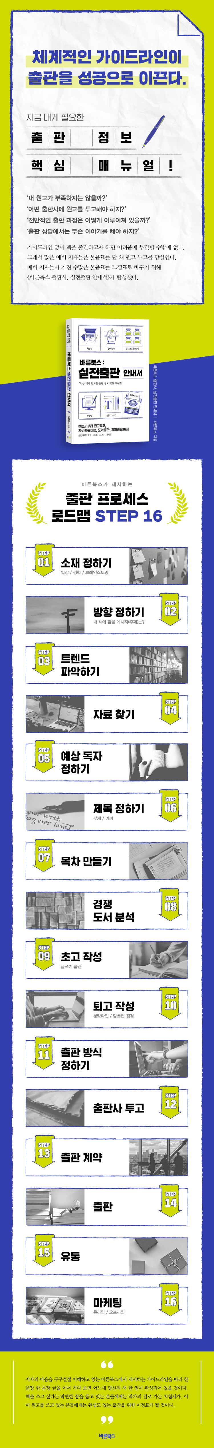 1Àå ¡´ÃâÆÇ, ÀÌÁ¤Ç¥ºÎÅÍ ¼¼¿ö º¸ÀÚ!¡µ¿¡¼´Â ³ª¿Í ¸Â´Â ÃâÆÇ»ç¸¦ ¼±ÅÃÇÏ´Â ¹æ¹ý, ´Ù¾çÇÑ Á¾·ùÀÇ ÃâÆÇ Çü½Ä, ÃâÆÇ »ó´ã ½Ã ÇʼöÀûÀ¸·Î ÇØ¾ß ÇÒ Áú¹®µéÀ» ±¸Ã¼ÀûÀ¸·Î Á¤¸®ÇÏ¿´°í, 2Àå ¡´»çÀü Áغñ, ²Ä²ÄÇÔ¸¸ÀÌ »ì±æÀÌ´Ù¡µ¿¡¼´Â ÄÜÅÙÃ÷ ã±â, ±Û¿¡ ¸Þ½ÃÁö ´ã±â, ÅåÅå Æ¢´Â Ãâ°£±âȹ¼ ÀÛ¼º¹ý µî º»°ÝÀûÀ¸·Î Ã¥À» ¾²±â À§ÇÑ Áغñ ´Ü°è¿¡ ´ëÇØ ¼³¸íÇÏ¿´´Ù. 3Àå ¡´±Û, ¾î¶»°Ô ½á¾ß Çұ´Â 2Àå¿¡¼ ´Ù·é »çÀü Áغñ ´Ü°è¸¦ °ÅÃÄ 6°³¿ù ¾È¿¡ ÃÊ°í¸¦ ¿Ï¼ºÇÏ´Â ¹ý, È¿À²ÀûÀÎ ±Û¾²±â ½À°ü, ¸¹Àº ½Ã°£À» ÇÒ¾ÖÇØ¾ß ÇÏ´Â Åð°í ÀÛ¾÷ µîÀ» ¾Ë·Á ÁØ´Ù. 4Àå ¡´Ã¥, ¾î¶»°Ô ¸¸µé¾î¾ß Çұ¿¡¼´Â Ã¥ÀÇ Ã¹ÀλóÀ» °áÁ¤ÇÏ´Â Á¦¸ñ Áþ±â, Â¥ÀÓ»õ ÀÖ´Â ¸ñÂ÷ ±¸¼º¹ý µî Ã¥À» ±¸¼ºÇÏ´Â Å« Ʋ¿¡ ´ëÇÏ¿© ü°èÀûÀ¸·Î ¼¼úÇÏ¿´´Ù. ÀÌ¿¡ ´õÇØ 5Àå ¡´¸ÂÃã¹ý, ¹«¾ùÀÌ Æ²·ÈÀ»±î¡µ¸¦ ÅëÇØ Çò°¥¸®±â ½¬¿î ¸ÂÃã¹ýÀ» ¾ö¼±ÇÏ¿© ¼Ò°³ÇÏ¿´À¸¸ç, ¡®Ã¥¾²±â¿¡ ²À ÇÊ¿äÇÑ ¸ÂÃã¹ý ÃÑÁ¤¸® TEST¡¯¸¦ ¼ö·ÏÇÏ¿© ÃÖÁ¾ Á¡°Ë±îÁö ¸¶¹«¸®ÇÒ ¼ö ÀÖ´Ù. 6Àå ¡´°è¾à¼¿Í ÀúÀÛ±Ç, ¾Ë°í ¾²ÀÚ¡µ¿¡¼´Â ÃâÆÇ ÀúÀ۱ǰú ÃâÆÇ °è¾à¿¡ ´ëÇØ »ó¼¼ÇÏ°Ô ¼³¸íÇØ ÀÌÇØÇϱ⠾î·Á¿î ³»¿ëÀ» ¾Ë±â ½±°Ô Á¤¸®ÇÏ¿´´Ù. ¶ÇÇÑ, ÃâÆÇ ÀÌÈÄ ÁøÇàµÇ´Â ¸¶ÄÉÆÃ¿¡ °üÇÏ¿© ´Ù·é 7Àå ¡´¸¶ÄÉÆÃ, ´Ù¾çÇÑ ¹æÇâÀ¸·Î Ž»öÇ϶󡵴 ÀÛ°¡¿Í ÃâÆÇ»ç°¡ ÁøÇàÇÒ ¼ö ÀÖ´Â ´Ù¹æ¸éÀÇ ¸¶ÄÉÆÃ ºñ¹ýÀ» °øÀ¯ÇÑ´Ù. ¸¶Áö¸·À¸·Î ÃâÆÇÀÇ ÀüüÀûÀÎ °úÁ¤À» È®ÀÎÇÒ ¼ö ÀÖ´Â ¡®ÃâÆÇ ÇÁ·Î¼¼½º ·Îµå¸Ê¡¯°ú º»¹®¿¡¼ ¸ø´Ù ÇÑ À̾߱⸦ ¸¶¹«¸®ÇÏ´Â Q&A¸¦ ºÎ·ÏÀ¸·Î ±¸¼ºÇÏ¿´´Ù. |