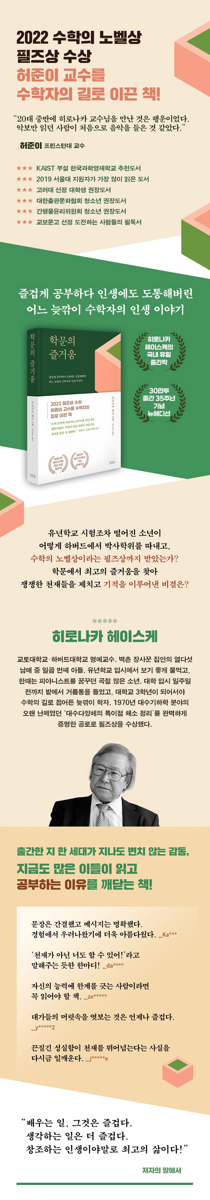 ¼öÇÐÀÇ ³Á¦ ¡®Æ¯ÀÌÁ¡ ÇØ¼Ò Á¤¸®¡¯¸¦ Áõ¸íÇØ ÇÊÁî»óÀ» ¼ö»óÇÑ ¼¼°èÀû ¼öÇÐÀÚ È÷·Î³ªÄ« ÇìÀ̽ºÄÉ´Â, ÀÌ Ã¥¿¡¼ Çй®À̶õ ¹«¾ùÀÌ¸ç ¿Ö ¹è¿ö¾ß Çϴ°¡¸¦ Æò»ýÀÇ °æÇèÀ» ÅëÇØ ޱ¸ÇÑ´Ù. ±×´Â ¡°¹è¿òÀº ÁöÇýÀÇ ³ÐÀÌ¿Í ±íÀÌ, ±×¸®°í ÈûÀ» Ű¿ì´Â °úÁ¤¡±ÀÌ¶ó ¸»Çϸç, ¹è¿î °ÍÀ» Àش´ٰí ÇØ¼ ¹è¿òÀÌ »ç¶óÁö´Â °ÍÀº ¾Æ´Ï¶ó°í ¸»ÇÑ´Ù. Áö½ÄÀº »ç¶óÁ®µµ ³²´Â °ÍÀº »ç°íÀÇ ¹æ½Ä, ¹®Á¦¸¦ ¹Ù¶óº¸´Â °üÁ¡, ±×¸®°í ´Ù½Ã ¹è¿ì·Á´Â ¸¶À½À̶ó´Â °ÍÀÌ´Ù.
