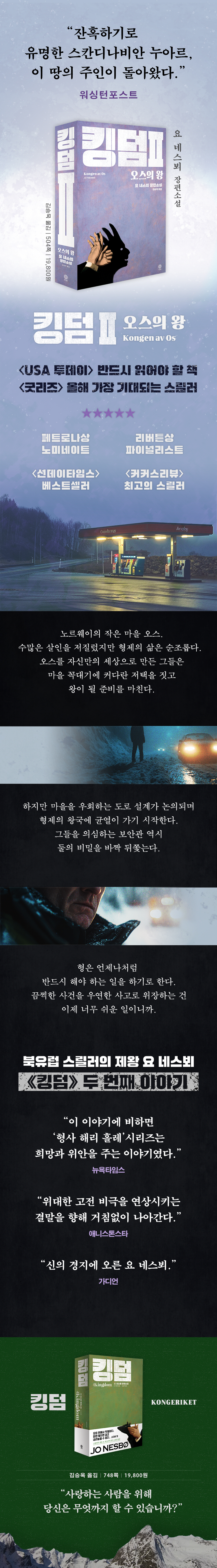 ¡¶Å·´ý ¥±: ¿À½ºÀÇ ¿Õ¡·Àº ÁÖ¹ÎÀÌ Ãµ ¸í ³²ÁþÇÑ ÀÛÀº ¸¶À» ¡®¿À½º¡¯¸¦ ¹è°æÀ¸·Î, Áö¸®Àû¡¤½É¸®Àû °í¸³ÀÌ ¸¸µé¾î³»´Â ±ØµµÀÇ ±äÀå ¼ÓÀ¸·Î µ¶ÀÚ¸¦ ²ø¾îµéÀδÙ. ¡®¼±À» À§ÇÑ ¾Ç¡¯°ú ¡®¾ÇÀ» À§ÇÑ ¼±¡¯ÀÌ Ãæµ¹ÇÏ¸ç °¥µîÀÌ ½ÉȵǴ °¡¿îµ¥, °ú°Å¸¦ µ¤±â À§ÇØ ´õ Å« Á˸¦ ÀúÁö¸£´Â ÇüÁ¦ÀÇ ¼±ÅÃÀº ÇÑÃþ ´õ Ä¡¹ÐÇϰí ÀÜÈ¤ÇØÁø´Ù. Á¦°¢±â ´Ù¸¥ ¾ÆÇÄÀ» °¡Áø ÀÔüÀûÀΠij¸¯ÅÍ, ¹üÁËÀÚ¸¦ ÈÀÚ·Î ³»¼¼¿ö µ¶ÀÚ¸¦ µµ´öÀû µô·¹¸¶¿¡ ºü¶ß¸®´Â ³ë·ÃÇÑ ¼³Á¤, À̾߱⠰÷°÷¿¡ ´Ü¼¸¦ ¹èÄ¡Çϰí ȸ¼öÇÏ´Â Á¤±³ÇÑ ±¸¼ºÀº ½º¸±·¯ Á¦¿ÕÀ¸·Î¼ ¿ä ³×½ººÆÀÇ ¿ª·®À» À¯°¨¾øÀÌ µå·¯³½´Ù. ÀÌ¿¡ ´õÇØ, ÀÛǰÀº ¡®À̼º°ú º»¼ºÀÌ ºÎµúÈú ¶§ Àΰ£Àº ¹«¾ùÀ» ¼±ÅÃÇϴ°¡¡¯¶ó´Â µµ´öÀû Áú¹®À» Áý¿äÇÏ°Ô ÆÄ°íµç´Ù. ÁúÅõ¿Í ÁËÃ¥°¨, Àý¸ÁÀ¸·Î ¾ó·èÁø Àΰ£ÀÇ ¾ó±¼À» ³Ã¼ÒÀûÀÎ ½Ã¼±À¸·Î ´ã¾Æ³»¸ç, ½º¸±·¯ÀÇ Äè°¨À» ³Ñ¾î ÈÞ¸Õ µå¶ó¸¶·Î¼ ±í°í ¹¬Á÷ÇÑ ¿©¿îÀ» ³²±ä´Ù.