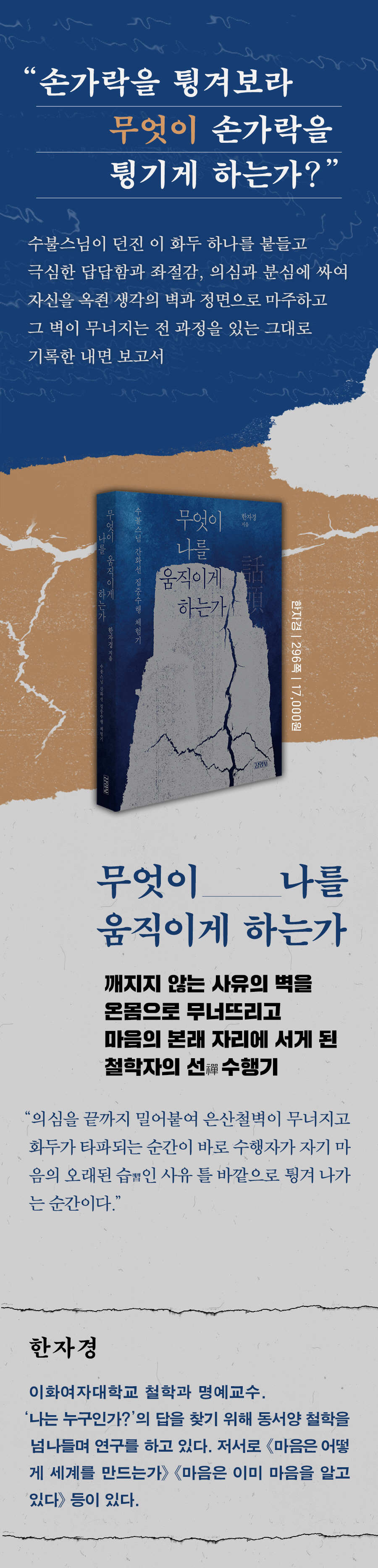 ÀúÀÚ´Â °£È¼±ÀÇ ÇÙ½ÉÀÎ ¡®ÈµÎ¡¯¸¦ ºÙÀâ°í ¾¾¸§ÇÏ´Â µ¿¾È, öÇÐÀڷμ ½×¾Æ¿Â »çÀ¯ÀÇ ½À°ü°ú ¼öÇàÀڷμ ³»·Á³õ¾Æ¾ß ÇÒ »ý°¢ÀÇ ²öÀ» µ¿½Ã¿¡ ¸¶ÁÖÇÑ´Ù. ¸Ó¸®·Î ÀÌÇØÇÏ´Â ¾Í°ú ¸öÀ¸·Î °Þ¾î³»´Â ±ú´ÞÀ½ »çÀÌÀÇ °£±Ø, ±×¸®°í ±× °£±ØÀ» ¾ø¾Ö°¡´Â °úÁ¤ÀÌ ³Ñ½Ç°Å¸®´Â °¨Á¤ÀÇ ±¸Ã¼Àû ¾ð¾î·Î ±â·ÏµÇ¾î ÀÖ¾î, ºÒ±³ ¼öÇà °æÇèÀÌ ÀüÇô ¾ø´Â µ¶ÀÚµµ ÀÚ½ÅÀÇ ¸¶À½À» ºñÃß´Â °Å¿ïó·³ ÀÐÀ» ¼ö ÀÖ´Ù.