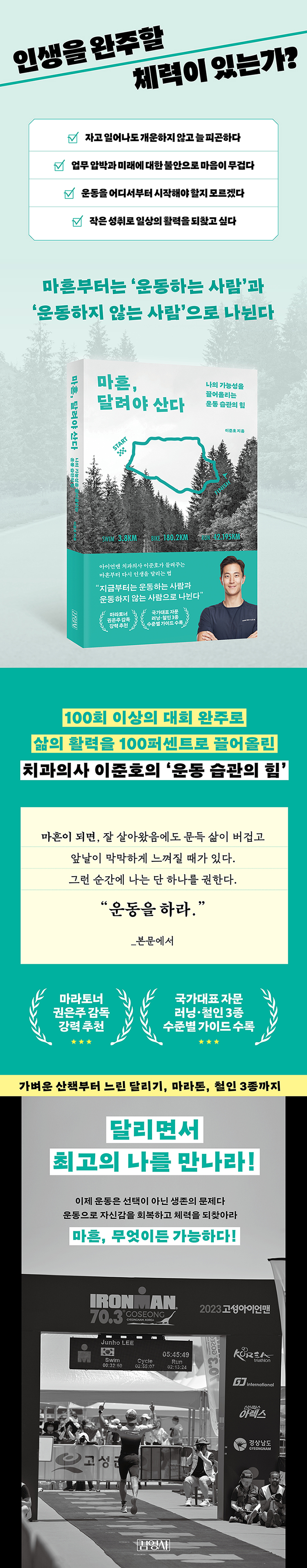 ´Þ¸®´Â µ¿¾È ½×¾Æ¿Ã¸° È£ÈíÀº ³» »îÀÇ ÆäÀ̽º±îÁö ¹Ù²Ù¾î³õ¾Ò´Ù. Àϻ󿡼 Èçµé¸± ¶§¸¶´Ù ¿îµ¿Àº ³ª¸¦ ´Ù½Ã ºÙÀâ¾ÆÁá°í, ¡®³ªµµ ÇÒ ¼ö ÀÖ´Ù¡¯¶ó´Â ¹ÏÀ½À» ´Ù½Ã ½É¾îÁá´Ù. ±× ¹ÏÀ½Àº Áø·á½Ç¿¡¼µµ, °¡Á¤¿¡¼µµ ³ª¸¦ ¹Ð¾îÁÖ´Â °¡Àå µçµçÇÑ ÈûÀÌ µÇ¾ú´Ù. _20ÂÊ ¿îµ¿Àº ´Ü±âÀûÀÎ ±âºÐ ÀüȯÀ» ³Ñ¾î¼, Àå±âÀûÀ¸·Î »ý»ê¼ºÀ» ³ôÀÌ´Â ÀÚ±â°ü¸® µµ±¸´Ù. ´Ü 20ºÐÀÇ °¡º¿î Á¶±ë¸¸À¸·Îµµ ±âºÐÀÌ ÀüȯµÇ°í, ÇÏ·çÀÇ Àϰú°¡ ´õ À¯¿¬ÇÏ°Ô Ç®¸®±âµµ ÇÑ´Ù. ¸®´õ½ÊÀ» ¹ßÈÖÇϰųª º¹ÀâÇÑ ¹®Á¦¸¦ ÇØ°áÇØ¾ß ÇÒ ¶§, ¿îµ¿À¸·Î ´ÙÁ®Áø ü·Â°ú ½É¸®Àû ¾ÈÁ¤°¨Àº ´«¿¡ º¸ÀÌÁö ¾Ê´Â °æÀï·ÂÀÌ´Ù. ¿îµ¿Àº ´ÜÁö ¡®°Ç° °ü¸®¡¯ Â÷¿øÀÌ ¾Æ´Ï¶ó, Áö¼Ó°¡´ÉÇÑ Ä¿¸®¾î¿Í »îÀÇ ÁúÀ» À§ÇÑ ÇÙ½É ·çƾÀÎ ¼ÀÀÌ´Ù. _81ÂÊ ¿ì¸® ¸öÀº °ÅÁþ¸»À» ÇÏÁö ¾Ê´Â´Ù. ¾ó¸¶³ª ³ë·ÂÇß´ÂÁö, ¾ó¸¶³ª ½Ã°£À» µé¿´´ÂÁö °á±¹ µå·¯³´Ù. ±×°ÍÀº ±ÙÀ°ÀÇ ¸ð¾çº¸´Ù, ÀǿܷΠ³»¸éÀÇ Åµµ¿¡¼ ³ªÅ¸³´Ù. _125ÂÊ ±×·¡¼ ´ëȸ Âü°¡´Â ´Ü¼øÈ÷ ½Ç·ÂÀ» Áõ¸íÇÏ´Â ÀÚ¸®°¡ ¾Æ´Ï´Ù. »ýȰüÀ°Àο¡°Ô ´ëȸ´Â ±× ÀÚü·Î ¼ºÀå°ú °¢¼ºÀÇ ¹«´ë´Ù. ÀßÇØ¼°¡ ¾Æ´Ï¶ó, ºÎÁ·Çϱ⠶§¹®¿¡ ³ª°£´Ù. ºÎÁ·ÇÑ »óÅ¿¡¼ ºÎµúÃľ߸¸ ³» ÇöÀç À§Ä¡¿Í ÁøÂ¥ °úÁ¦°¡ ¼±¸íÇØÁø´Ù. _181ÂÊ °Ü¿ï¿¡´Â ½¬¾îµµ µÈ´Ù. ´Ù¸¸, ³Ê¹« ¿À·¡´Â ½¬Áö ¸»ÀÚ. ³²µéÀÌ ½¬´Â ±× ½Ã°£¿¡ ¾î¶»°Ô º¸³»´Â°¡¿¡ µû¶ó ´ç½ÅÀÇ ´ÙÀ½ ½ÃÁðÀÌ °áÁ¤µÈ´Ù. ¿À´Ã ´ç½ÅÀÌ ¼±ÅÃÇÑ ÀÛÀº ½À°ü Çϳª°¡, ´Ù°¡¿Ã º½³¯ ´©±º°¡ÀÇ ¹Ú¼ö¸¦ ¹ÞÀ» ÇǴϽà ¶óÀÎÀÌ µÇ¾îÁÙ °ÍÀÌ´Ù. _219ÂÊ ³ª´Â ¸»ÇÏ°í ½Í´Ù. ´ÊÀº µµÀüÀ̶õ ¾ø´Ù. 40´ë´Â ¾ÆÁ÷ ÃæºÐÈ÷ º¯ÈÇÒ ¼ö ÀÖ´Â ³ªÀÌÀ̰í, »õ·Î¿î »îÀ» ¼³°èÇÒ ¼ö ÀÖ´Ù. °ÑÀ¸·Î´Â ¾ÈÁ¤µÇ¾î º¸ÀÌ´Â Áö±ÝÀÌ, ¾î¼¸é ÁøÂ¥ ³»°¡ ¿øÇÏ´Â »îÀ» ÇâÇØ ³ª¾Æ°¥ °¡Àå ÁÁÀº Ãâ¹ßÁ¡ÀÏÁöµµ ¸ð¸¥´Ù. ³ªµµ ±×·¸°Ô ¿©±â±îÁö ¿Ô´Ù. _226ÂÊ ÃâÆÇ»ç ¼Æò¡Ú¡Ú¡Ú ¸¶¶óÅä³Ê ±ÇÀºÁÖ °¨µ¶ °·Â Ãßõ