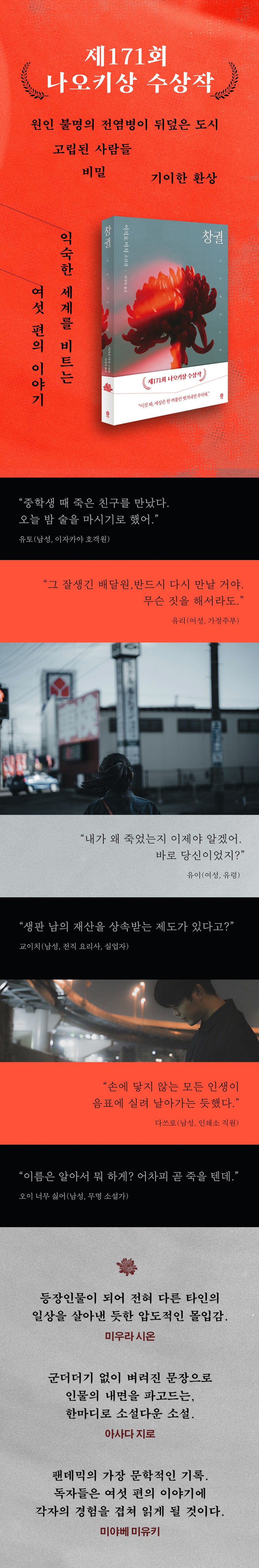 ³ª¿ÀŰ»ó ¼ö»óÀÛ ¡¶Ã¢±È¡·Àº ¿øÀÎ ºÒ¸íÀÇ Àü¿°º´ÀÌ ¹øÁø µµ½Ã¸¦ ¹è°æÀ¸·Î ¿©¼¸ ÆíÀÇ ´ÜÆí¼Ò¼³À» ¹Àº ¼Ò¼³ÁýÀÌ´Ù. ÁßÇлý ¶§ Á×Àº Ä£±¸¸¦ ½º¹« »ìÀÌ µÇ¾î ¸¶ÁÖÄ£ ³²ÀÚ, Àß»ý±ä ¹è´Þ¿øÀ» ¸¸³ª°íÀÚ ¹è´Þ ¾Û¿¡ ÁýÂøÇϱ⠽ÃÀÛÇÏ´Â °¡Á¤ÁÖºÎ, ÀÚ½ÅÀÌ ¿Ö Á×¾ú´ÂÁö ¾Ë¾Æ³»±â À§ÇØ °íÇâÀ» ¶°µµ´Â À¯·É, Àü¿°º´À¸·Î »îÀÌ ¸Á°¡Áø »ç¶÷µéÀÇ ÀÚ»ì Ŭ·´¡¦¡¦. ´Ù¾çÇÑ ¹®ÇÐÀû °æ·Î¸¦ °ÅÄ£ ÀÛ°¡ÀÇ ÀÌ·Âó·³ ¡¶Ã¢±È¡·Àº ¹Ì½ºÅ͸®, ½º¸±·¯, ¹üÁË, Ã߸®, ÆÇŸÁö, ¼ø¹®ÇÐÀÇ °æ°è¸¦ ³Ñ³ªµç´Ù. Çö´ë¼Ò¼³·Î ±¸Çö °¡´ÉÇÑ ¸ðµç Àç¹Ì¸¦ ±Ø´ëÈÇϸç Àç³ »óȲ¿¡¼ÀÇ ¿å¸Á, ÁËÀǽÄ, »çȸÀû À±¸®¿¡ ³¯Ä«·Î¿î Áú¹®À» ´øÁø´Ù.