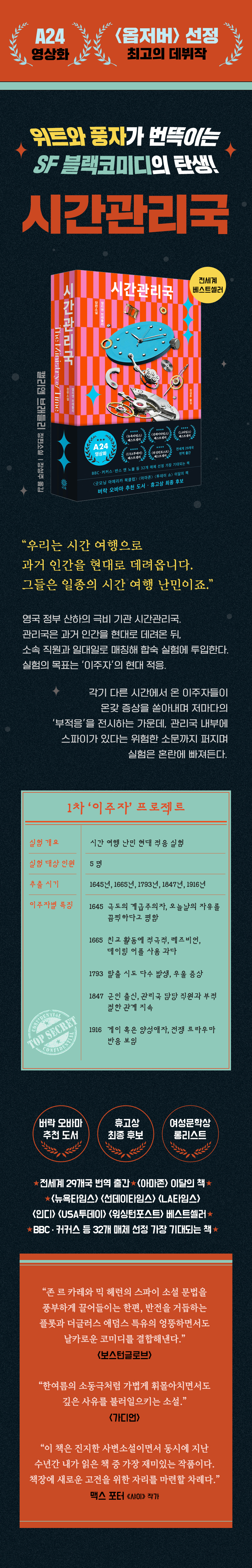 °ú°Å¿¡¼ ¿Â Àΰ£°ú 21¼¼±â Àΰ£ÀÇ ºñ¹Ð½º·´°íµµ À§ÅÂ·Î¿î °øÁ¸±â¸¦ ±×¸° ¼Ò¼³ ¡¶½Ã°£°ü¸®±¹¡·. Á¤½Ä Ãâ°£ ÀüºÎÅÍ A24 ¿µ»óÈ ÆÇ±Ç °è¾àÀ» È®Á¤ ÁöÀ¸¸ç ÈÁ¦¸¦ ¸ðÀº ÀÌ ÀÛǰÀº ¿µ±¹¿¡¼ ù Ãâ°£µÇÀÚ¸¶ÀÚ ¡´¿ÉÀú¹ö¡µ ¼±Á¤ ÃÖ°íÀÇ µ¥ºßÀÛÀ̶ó´Â ¿µ¿¹¸¦ ¾ÈÀ¸¸ç ¡´¼±µ¥ÀÌŸÀÓ½º¡µ º£½ºÆ®¼¿·¯ Â÷Æ®¸¦ ¼®±ÇÇß´Ù.