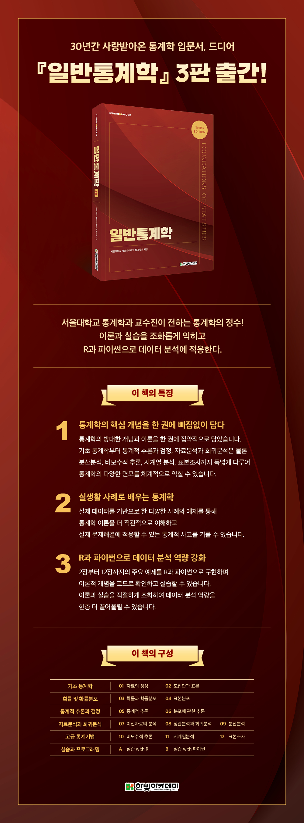 µ¥ÀÌÅÍ(ÀÚ·á)°¡ »ê¾÷°ú ¿¬±¸ÀÇ Áß½ÉÀÌ µÈ Áö±Ý, Åë°èÇÐÀº À̸¦ È¿°úÀûÀ¸·Î ºÐ¼®Çϰí Ȱ¿ëÇÏ´Â µ¥ ÇʼöÀûÀÎ Çй®ÀÌ´Ù. ¡ºÀϹÝÅë°èÇÐ(3ÆÇ)¡»Àº Åë°èÀÇ ±âº» °³³äÀ» ü°èÀûÀ¸·Î Á¤¸®Çϰí R°ú ÆÄÀ̽㠽ǽÀÀ» ÅëÇØ µ¥ÀÌÅÍ ºÐ¼® ¿ª·®À» ±â¸¦ ¼ö ÀÖµµ·Ï ±¸¼ºµÈ ÀÔ¹®¼ÀÌ´Ù. 25³â¸¸¿¡ ÀÌ·ïÁø À̹ø 3ÆÇ °³Á¤¿¡¼´Â SAS ´ë½Å R°ú ÆÄÀ̽ãÀ» Ȱ¿ëÇÑ ½Ç½ÀÀ» Ãß°¡ÇÏ¿© µ¶ÀÚµéÀÌ ÀÌ·ÐÀ» ÇÁ·Î±×·¡¹ÖÀ¸·Î ±¸ÇöÇÒ ¼ö ÀÖµµ·Ï ÇßÀ¸¸ç, ½Ç»ýȰ µ¥ÀÌÅ͸¦ ¹Ý¿µÇÑ ¿¹Á¦¸¦ º¸°Çß´Ù. Åë°èÇÐÀ» óÀ½ Á¢ÇÏ´Â ºñÀü°øÀÚºÎÅÍ µ¥ÀÌÅÍ ºÐ¼®À» ¹è¿ì·Á´Â ÀÔ¹®ÀÚ±îÁö ´©±¸³ª ü°èÀûÀ¸·Î ÇнÀÇÒ ¼ö ÀÖµµ·Ï ±¸¼ºµÈ ÀÌ Ã¥Àº °ÀÇ ±³Àç´Â ¹°·Ð µ¶ÇпëÀ¸·Îµµ ÀûÇÕÇÏ´Ù. µ¥ÀÌÅ͸¦ ¿Ã¹Ù¸£°Ô ÀÌÇØÇÏ°í ºÐ¼®ÇÏ´Â ¹ýÀ» ¹è¿ì¸ç Åë°èÀû »ç°í·ÂÀ» Ű¿öº¸ÀÚ.