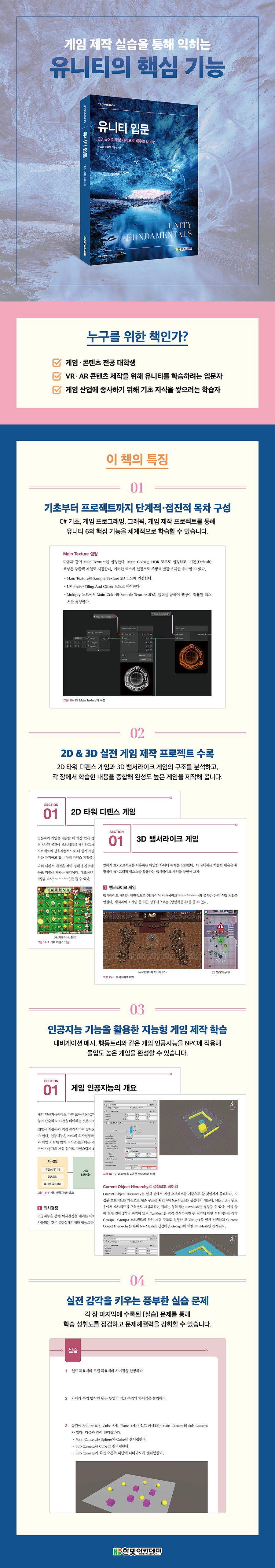¡ºÀ¯´ÏƼ ÀÔ¹®¡»Àº °ÔÀÓ °³¹ßÀ» ¹è¿ì´Â ÇлýÀ» À§ÇÑ À¯´ÏƼ ÀÔ¹® ±³ÀçÀÔ´Ï´Ù. C# ±âÃÊ ¹× ºñÁÖ¾ó ½ºÅ©¸³ÆÃºÎÅÍ °ÔÀÓ ±×·¡ÇÈ, ½ºÅ©¸³Æ®¸¦ Ȱ¿ëÇÑ ±â´É ±¸Çö±îÁö Á¡ÁøÀûÀ¸·Î ÇнÀÇÒ ¼ö ÀÖµµ·Ï ±¸¼ºÇß½À´Ï´Ù. °¢ Àå¿¡¼´Â ¿¹Á¦¸¦ ÅëÇØ °³³äÀ» ÀÍÈ÷°í, ½Ç½À ¹®Á¦·Î ÇÙ½É ³»¿ëÀ» Á¤¸®Çϸç ÀÚ¿¬½º·´°Ô ½Ç·ÂÀ» ´ÙÁý´Ï´Ù. À¯´ÏƼÀÇ ³»Àå ÀΰøÁö´É ±â´ÉÀÎ NavMesh ±æÃ£±â¿Í ÇൿƮ¸® ¿¹Á¦¸¦ ÅëÇØ, ´õ Çö½Ç°¨ ÀÖ°í Áö´ÉÀûÀÎ °ÔÀÓÀ» ¸¸µå´Â ¹æ¹ýÀ» ¹è¿ï ¼ö ÀÖ½À´Ï´Ù. ¸¶Áö¸·À¸·Î ¡®2D Ÿ¿ö µðÆæ½º °ÔÀÓ¡¯°ú ¡®3D ¹ì¼¶óÀÌÅ© °ÔÀÓ¡¯ Á¾ÇÕ ÇÁ·ÎÁ§Æ®¸¦ ¿Ï¼ºÇϸç ÇϳªÀÇ °ÔÀÓÀ» ³¡±îÁö ±¸ÇöÇÏ´Â °úÁ¤À» °æÇèÇÕ´Ï´Ù. ÀÌ Ã¥À» ÅëÇØ ÇлýµéÀº ÀڽŸ¸ÀÇ °ÔÀÓÀ» Á÷Á¢ ±âȹÇÏ°í ±â¹ßÇÒ ¼ö ÀÖ´Â ½Ç¹« °¨°¢À» ±â¸£°Ô µÉ °ÍÀÔ´Ï´Ù.