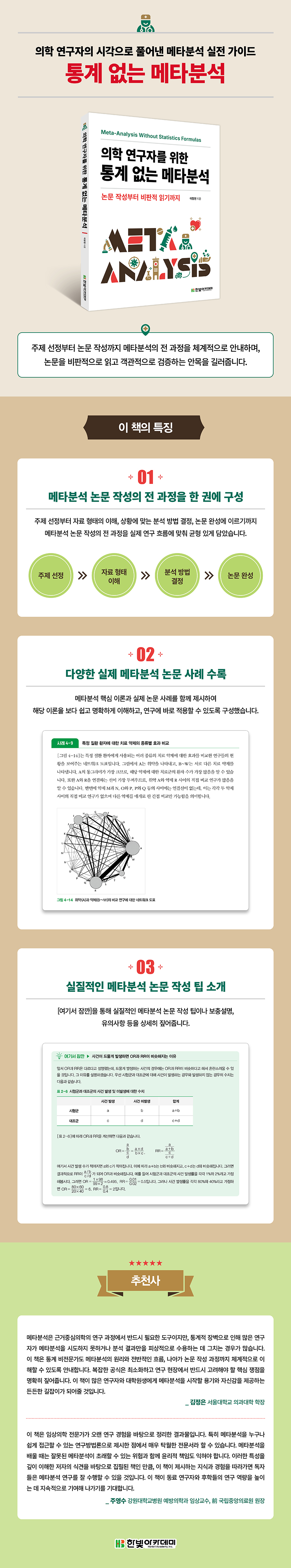 ÀÌ Ã¥Àº Åë°è¿¡ ´ëÇÑ µÎ·Á¿òÀ¸·Î ¸ÞŸºÐ¼®À» ¸Á¼³¿© ¿Â ÀÇÇÐ ¿¬±¸ÀÚ¸¦ À§ÇÑ ½ÇÀü Áöħ¼ÀÔ´Ï´Ù. Åë°è À̷аú ±â¹ý Áß½ÉÀ¸·Î ±¸¼ºµÈ ±âÁ¸ÀÇ ¸ÞŸºÐ¼® Ã¥µé°ú ´Þ¸®, º¹ÀâÇÑ ¼ö½ÄÀ» ÃÖ¼ÒÈÇÏ°í ¸ÞŸºÐ¼®ÀÇ °¢ °úÁ¤ÀÌ ¹«¾ùÀ» ÀǹÌÇÏ¸ç ¿Ö ÇÊ¿äÇÑÁö¸¦ ÀÌÇØÇϵµ·Ï µ½´Â µ¥ ÃÊÁ¡À» ¸ÂÃè½À´Ï´Ù. ÀúÀÚ´Â ¿¬±¸ÀÚÀÇ ½ÇÁ¦ ÀÛ¾÷ È帧¿¡ µû¶ó ¡®ÁÖÁ¦ ¼±Á¤ ¡æ ÀÚ·á ÇüÅ ÀÌÇØ ¡æ ºÐ¼® ¹æ¹ý °áÁ¤ ¡æ ³í¹® ¿Ï¼º¡¯¿¡ À̸£´Â Àü °úÁ¤À» ü°èÀûÀ¸·Î ¾È³»Çϸç, ¸ÞŸºÐ¼® ³í¹® ÀÛ¼ºÀ» À§ÇÑ ½ÇÁúÀûÀÎ ³ëÇϿ츦 ±¸Ã¼ÀûÀ¸·Î Á¦½ÃÇÕ´Ï´Ù. ¶ÇÇÑ ´Ù¾çÇÑ ½ÇÁ¦ ÀÇÇÐ ³í¹® »ç·Ê¿Í dzºÎÇÑ ½Ã°¢ ÀڷḦ ÇÔ²² ¼ö·ÏÇÏ¿© ¸ÞŸºÐ¼®ÀÇ ÇÙ½É ÀÌ·ÐÀ» º¸´Ù ½±°í Á÷°üÀûÀ¸·Î ÀÌÇØÇÒ ¼ö ÀÖµµ·Ï ±¸¼ºÇß½À´Ï´Ù. »Ó¸¸ ¾Æ´Ï¶ó ¸ÞŸºÐ¼® °á°ú¸¦ ¿Ã¹Ù¸£°Ô ÇØ¼®ÇÏ´Â ¹æ¹ý¿¡ ±×Ä¡Áö ¾Ê°í, ÀÌ¹Ì ÃâÆÇµÈ ¸ÞŸºÐ¼® ³í¹®À» ºñÆÇÀûÀ¸·Î ÀÐ°í ¿À·ù¸¦ °¡·Á³»´Â ¹æ¹ý±îÁö ÇÔ²² ¼Ò°³ÇÕ´Ï´Ù. Åë°èÀÇ À庮À» ³Ñ¾î ¸ÞŸºÐ¼® ³í¹® ÀÛ¼ºÀ» ½ÃÀÛÇϰíÀÚ ÇÏ´Â ¿¬±¸ÀÚ¿¡°Ô ÀÌ Ã¥ÀÌ µçµçÇÑ ±æÀâÀ̰¡ µÇ¾îÁÙ °ÍÀÔ´Ï´Ù.