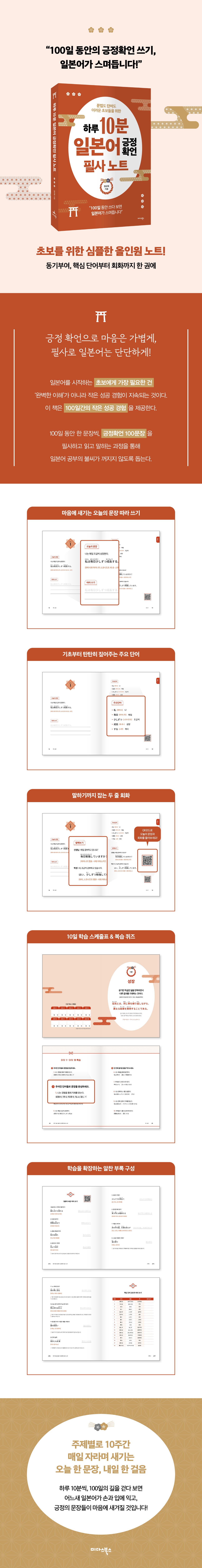 ÀÌ Ã¥Àº ÇÏ·ç 10ºÐ, ±àÁ¤ È®¾ðÀ» µû¶ó ¾²¸ç 100ÀÏ µ¿¾È ÀϺ»¾î ±âÃÊ ½Ç·Â°ú ÀڽۨÀ» µ¿½Ã¿¡ ½×°Ô ÇÏ´Â Ãʺ¸ Ä£ÈÇü ÇÊ»ç ¿öÅ©ºÏÀÌ´Ù. ÀϺ»¾î¸¦ ½ÃÀÛÇÏ´Â Ãʺ¸¿¡°Ô °¡Àå ÇÊ¿äÇÑ °Ç ¡®¿Ïº®ÇÑ ÀÌÇØ¡¯°¡ ¾Æ´Ï¶ó ÀÛÀº ¼º°ø °æÇèÀÌ Áö¼ÓµÇ´Â °ÍÀÌ´Ù. ÀÌ Ã¥Àº 100Àϰ£ÀÇ ÀÛÀº ¼º°ø °æÇèÀ» Á¦°øÇÑ´Ù.