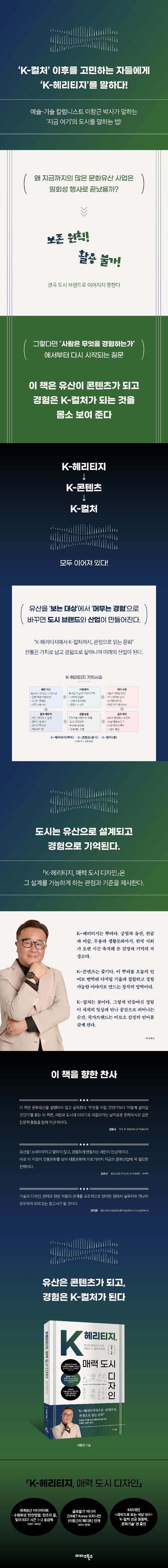 ¹®ÈÀ¯»êÀº º¸Á¸À¸·Î ÁöÄÑÁö°í °æÇèÀ¸·Î È®ÀåµÈ´Ù. »ç¶÷ÀÇ °æÇèÀÌ ¼³°èµÉ ¶§ À¯»êÀº µµ½ÃÀÇ ½ºÅ丮¿Í ºê·£µå·Î À̾îÁø´Ù. ¿¹¼ú-±â¼ú Ä®·³´Ï½ºÆ® ÀÌâ±Ù ¹Ú»ç´Â ¡ºK-Ç츮ƼÁö, ¸Å·Â µµ½Ã µðÀÚÀΡ»¿¡¼ º¸Á¸À» ÀüÁ¦·Î Çϸ鼵µ À¯»êÀ» °æÇè°ú »ê¾÷À¸·Î ¿¬°áÇÏ´Â °üÁ¡À» Á¦½ÃÇÑ´Ù. ÀÌ Ã¥Àº ¡®K-Ç츮ƼÁö¡¯¶ó´Â °³³äÀ» Àü¸é¿¡ µÎ°í ¹®ÈÀ¯»êÀ» ¡®°æÇè ¼³°è¡¯ °üÁ¡¿¡¼ Ç®¾î³½ ½ÇÀüÇü ¹®È ±³¾ç¼´Ù. º¸Á¸À» ±â¹ÝÀ¸·Î À¯»êÀÌ »ê¾÷°ú ºê·£µå·Î È®ÀåµÇ´Â °¡´É¼ºÀ» º»°ÝÀûÀ¸·Î Á¶¸íÇÑ´Ù.