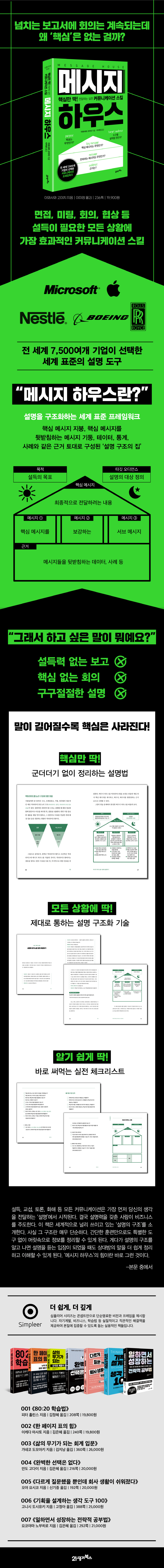ÀÌ Ã¥ÀÇ °¡Àå Å« ÀåÁ¡Àº °£´ÜÇÑ ¿ø¸®¸¦ ÀÍÈ÷´Â °Í¸¸À¸·Îµµ ¼¼°èÀû ¼öÁØÀÇ ¼³¸í·ÂÀ» °¡Áú ¼ö ÀÖ´Ù´Â °ÍÀÌ´Ù. ¸Þ½ÃÁö ÇϿ콺´Â ¼¼°èÀºÇà, À¯¿£, Àü ¼¼°è ±â¾÷µéÀÌ ÀÌ¹Ì ¿À·¡ÀüºÎÅÍ »ç¿ëÇÏ´Â °ËÁõµÈ ¸Þ½ÃÁö Àü´Þ¹ýÀÌ´Ù. ÀÌ Ã¥Àº ¸Þ½ÃÁö ÇϿ콺¸¦ ´©±¸³ª ÀÌÇØÇÒ ¼ö ÀÖµµ·Ï ÀÏ»ó ¾ð¾î·Î ÀçÇØ¼®Çϸç, µ¶ÀÚµéÀÌ ¾î·Æ°Ô¸¸ ´À²¼´ø ³í¸®Àû ¸Þ½ÃÁö ±¸¼ºÀÇ º®À» Çã¹°°í È¿°úÀûÀÎ ¼ÒÅë ¿ª·®À» Ű¿ìµµ·Ï ¾È³»ÇÑ´Ù. ¶ÇÇÑ ÀÏ»ó ¼Ó ´Ù¾çÇÑ »óȲº° ¼³¸í »ç·Ê¸¦ Á¦°øÇØ µ¶ÀÚµéÀÌ Ã¥À» Àд Áï½Ã ½º½º·ÎÀÇ ¸»°ú ±Û¿¡ Àû¿ëÇÒ ¼ö ÀÖ°Ô²û ±¸¼ºµÇ¾î ÀÖ´Ù. Á÷Àå¿¡¼ °æÀï·Â°ú ÀÏ»óÀÇ ¼ÒÅë ´É·ÂÀ» µ¿½Ã¿¡ ³ô¿©ÁÖ´Â ÃÖ°íÀÇ ¼³¸í·Â °¡À̵åÀÌ´Ù. ¶ÇÇÑ ÀÌ Ã¥Àº ¸Þ½ÃÁö ÇϿ콺ÀÇ ±¸¼º ¿ä¼Ò¸¦ °¢°¢ ÀÚ¼¼È÷ »ìÆìº¸¸ç °¢ ¿ä¼Ò°¡ ¿Ö Áß¿äÇÑÁö ¼³¸íÇϰí, ÇÙ½É ¸Þ½ÃÁöÀÇ ±¸¼º ¹æ¹ýºÎÅÍ ±Ù°ÅÀÇ ³í¸®Àû ¿¬°á, ±×¸®°í µè´Â »ç¶÷¿¡°Ô ½ÇÁúÀû ÇൿÀ» À¯µµÇÏ´Â ¹æ¹ý±îÁö ¼¼¹ÐÈ÷ ´Ù·é´Ù.