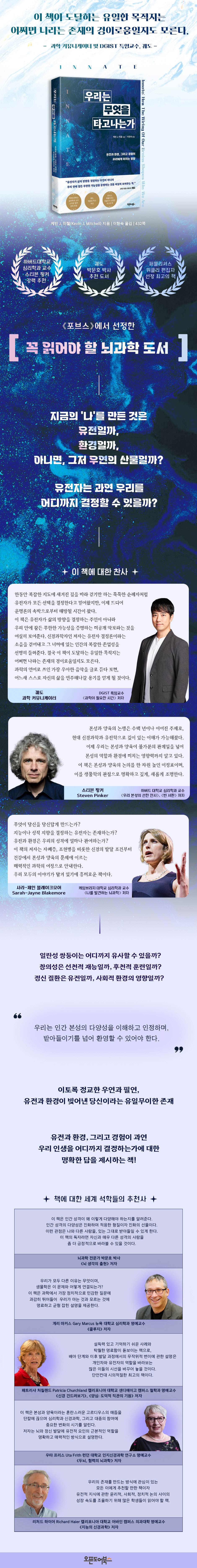 Çö´ë À¯ÀüÇÐÀÇ ±Ã±ØÀûÀÎ ¸ñÇ¥´Â À¯ÀüÀû º¯À̰¡ ÇüÁú Â÷À̸¦ ¸¸µé¾î ³»´Â ¿ø¸®¸¦ ¼³¸íÇÏ´Â µ¥ ÀÖ´Ù. 90ÂÊ ¼ö¸¹Àº ¿¬±¸¿¡¼ ÇüÁ¦Àڸа£ Â÷À̸¦ º¸À̴ ƯÁ¤ÇÑ È¯°æÀû ¿äÀÎÀ̳ª °æÇè°ú ƯÁ¤ÇÑ Çൿ °á°úÀÇ Ã¼°èÀûÀÎ ¿¬°ü¼ºÀ» Á¶»çÇØ ¿Ô´Ù. ºÎ¸ðÀÇ Â÷º°Àû ¾çÀ°, ¶Ç·¡ °ü°è, ÇüÁ¦°£ »óÈ£ ÀÛ¿ë, ±³»ç¿ÍÀÇ °ü°è, ¡®°¡Á· ±¸µµ(family constellation)¡¯ °°Àº ¿äÀÎ ¸»ÀÌ´Ù. ±×¸®°í ¿¬±¸¿¡¼ ³ªÅ¸³ °á°ú´Â ºÐ¸íÇß´Ù. ÀûÀÀ·Â, ¼º°Ý Ư¼º, ÀÎÁö ´É·Â µî ´Ù¾çÇÑ °á°ú¸¦ ½Å·ÚÇÒ ¸¸ÇÏ¸é¼ Àϰü¼ºÀ» °®Ãá ÀÇ¹Ì ÀÖ´Â È¿°ú´Â ÀüÇô È®ÀεÇÁö ¾Ê¾Ò´Ù. 98ÂÊ ¿ì¸®´Â º¸Åë ³ú¿¡ °üÇØ ¿ÀÇØÇϱ⵵ Çϴµ¥, ÀÌ´Â ÁÖ·Î ¿¹¼ú ÀÛǰÀ̳ª ¾Ö´Ï¸ÞÀ̼ǿ¡ Ç¥ÇöµÈ ¹æ½ÄÀ¸·Î È®ÀÎÇÒ ¼ö ÀÖ´Ù. ¡®´º·±¡¯À̶ó´Â ½Å°æ ¼¼Æ÷°¡ ¸ðµÎ °°À¸¸ç ¹«ÀÛÀ§·Î ¹èÄ¡µÇ¾î ÀÖ°í. ÀÎÁ¢ÇÑ ´º·±³¢¸®´Â ¼·Î ¿¬°áµÇ¾î ÀÖ¾î ¸¶Ä¡ ÇØ¸é°ú °°Àº ±¸Á¶¸¦ ÃëÇϰí ÀÖ´Ù´Â °ÍÀÌ´Ù. ÇÏÁö¸¸ ÀÌ´Â »ç½Ç°ú ÀüÇô ´Ù¸£´Ù. 103ÂÊ Ã¼°èÀÇ Çü¼º°ú Áõ½Ä, ºÐÈ, ¼¼Æ÷ À̵¿, Ãà»è À¯µµ, ½Ã³À½º Çü¼ºÀ» ºñ·ÔÇÑ ½Å°æ ¹ß´ÞÀÇ Á¦ °úÁ¤Àº À¯ÀüÀÚ ¹ßÇöÀÇ Â÷ÀÌ¿Í ´Ü¹éÁú °£ »óÈ£ ÀÛ¿ë¿¡ ÀÇÁ¸ÇÑ´Ù. ÀÌ´Â ½ÅÈ£¿Í ¼ö¿ëü»Ó ¾Æ´Ï¶ó ±× ½ÅÈ£¿¡ ¹ÝÀÀÇÏ´Â ¼¼Æ÷ ³» ¸ðµç ´Ü¹éÁú °æ·Î¸¦ Æ÷ÇÔÇÑ´Ù. ÀÌ´Â °ð °¢ °úÁ¤ÀÌ ¿©·¯ ¼öÁØ¿¡¼ ÀâÀ½ÀÇ ¿µÇâÀ» ¹Þ´Â´Ù´Â ÀǹÌÀÌ´Ù. µû¶ó¼ ¹ß´Þ ÁßÀÎ ¹è¾Æ¿¡¼ ¹ß»ýÇÏ´Â °úÁ¤Àº ¹«¾ù Çϳª ¹Ì¸® Á¤ÇØÁø °ÍÀÌ ¾ø´Ù°í º¼ ¼ö ÀÖ´Ù. 118¡119ÂÊ ¿ì¸®´Â ¸ðµÎ °°Àº ¹æ½ÄÀ¸·Î ¼¼»óÀ» ¹Ù¶óº¼±î? ÀÌ´Â ½±°Ô ´äÀ» ³»¸± ¼ö ¾ø´Â ¹®Á¦·Î, öÇÐÀÚµéÀÌ ¼öõ ³â µ¿¾ÈÀ» °í¹ÎÇØ ¿Â ÁÖÁ¦ÀÌ´Ù. µÎ »ç¶÷ÀÌ ÁÖ°üÀûÀ¸·Î °°Àº Áö°¢ °æÇèÀ» Çϰí ÀÖÀ½À» Áõ¸íÇϱâ´Â »ç½Ç»ó ºÒ°¡´ÉÇÏ´Ù. ¾î¼¸é ¿øÄ¢ÀûÀ¸·Îµµ ±×·¯ÇÒ °ÍÀÌ´Ù. 203ÂÊ Áö°¢Àº °ð ±â¼úÀ̶ó°í ÇÒ ¼ö ÀÖ´Ù. ¿ì¸®´Â ÀÌ ±â¼úÀ» »ýÈÄ ¸î ³â¿¡ °ÉÃÄ ÀÍÈ÷°í, ±× µÚ¿¡µµ Á¡Â÷ ´É¼÷ÇÏ°Ô ´Ù·ç¾î ³ª°£´Ù. ¿ì¸®´Â °æÇèÀ» ÅëÇØ ´Ü¼øÈ÷ ¼¼»ó¿¡ Á¸ÀçÇÏ´Â »ç¹°À» °¨ÁöÇÏ´Â °ÍÀ» ³Ñ¾î, À¯Çü¿¡ µû¶ó ºÐ·ùÇÏ´Â ¹ýÀ» ¹è¿î´Ù. »ý¹°°ú ¹«»ý¹°, µ¿¹°, »ç¶÷, °³, µ¹, °Ç¹°, µµ±¸, Àå³°¨, À½½Ä µîó·³ ¸»ÀÌ´Ù. 224ÂÊ ¶È¶ÈÇÑ ¾ÆÀÌ´Â ³¯ ¶§ºÎÅÍ ¶È¶ÈÇÏ°Ô Å¾ ½Ã°£ÀÌ Áö³ªµµ ¶È¶ÈÇÏ°Ô ÀÚ¶õ´Ù. Ç¥ÇöÀÌ ³Ê¹« ³ë°ñÀûÀ̶ó ÆòµîÁÖÀÇÀû °üÁ¡ÀÇ ¼ÒÀ¯ÀÚ¿¡°Ô´Â ºÒÆíÇÑ ¹ýÇÑ ¹ß¾ðÀÌ´Ù. Áö´ÉÀº ºÒº¯ÀÇ Æ¯¼ºÀÌÀÚ ±³À° µîÀÇ °æÇèÀ¸·Î ¹Ù²Ü ¼ö ¾ø´Ù´Â °áÁ¤·ÐÀû, ½ÉÁö¾î ¿î¸í·ÐÀû ¾Ï½Ã¶ó°í ¹Þ¾ÆµéÀÏ ¼öµµ ÀÖ°Ú´Ù. ¾ÕÀ¸·Î »ìÆìº¸°ÚÁö¸¸, ½ÇÁ¦·Î´Â ÀüÇô ±×·¸Áö ¾Ê´Ù. 249ÂÊ ¼ö¼¼±â µ¿¾È Á¤½Å ÁúȯÀÇ ¿øÀÎÀ» µÎ°í ¼ö¸¹Àº ÀÌ·ÐÀÌ Á¦±âµÇ¾î ¿Ô´Ù. ±×Áß¿¡¼ ƯÈ÷ Á¤½Åº´Àû Áõ»óÀ̳ª ¹ßÀÛó·³ °£ÇæÀûÀ¸·Î ³ªÅ¸³ª´Â Áõ»óÀº ¾Ç·É¿¡ ¾» °ÍÀ̶ó´Â ÁÖÀåÀÌ ³Î¸® ÆÛÁ® ÀÖ¾ú´Ù. ¹Ï±â Èûµé°ÚÁö¸¸, ÀÌ·¯ÇÑ ¹ÏÀ½Àº ¿À´Ã³¯¿¡µµ ¿©ÀüÈ÷ Á¸ÀçÇÑ´Ù. 335ÂÊ ÁøÈ´Â ¹Ì·¡¸¦ ´ëºñÇÑ ½Ã½ºÅÛÀ» ¼³°èÇÒ ¼ö ¾ø´Ù. ÁøÈ´Â ºÐÀÚ ¹× ¼¼Æ÷ ¼öÁØ¿¡¼´Â ÀâÀ½À» °ßµð´Â °°Ç¼ºÀ» ±¸ÃàÇÒ ¼ö ÀÖÀ¸¸ç, ½ÇÁ¦·Îµµ ±×·¡¾ß ÇÑ´Ù. ¶ÇÇÑ °°Ç¼ºÀº ÀÛÀº ºÐÀÚ ¼öÁØÀÇ À¯ÀüÀû º¯ÀÌ¿¡ °£Á¢ÀûÀÎ ÀúÇ×·ÂÀ» ºÎ¿©ÇÒ ¼ö ÀÖ´Ù. ±×·±µ¥µµ ÁøÈ´Â ¹Ì·¡¿¡ ³ªÅ¸³¯ ½É°¢ÇÑ µ¹¿¬º¯À̸¦ ¸ðµÎ ¿¹ÃøÇÒ ¼ö ¾ø´Ù. 366ÂÊ ºÎ¸ð´Â Á¤¸»·Î ÀÚ³àÀÇ ÇüÁúÀ» ¼±ÅÃÇÒ ±Ç¸®°¡ Àִ°¡? ±× ¼±ÅÃÀ¸·Î ºÎ¸ð¿Í ÀÚ³à »çÀÌÀÇ °ü°è¸¦ º»ÁúÀûÀ¸·Î ¹Ù²ÙÁö´Â ¾ÊÀ»±î? ¾Æ´Ï¸é ÇüÁú ¼±Åà ¿©ºÎ¿Í »ó°ü¾øÀÌ ºÎ¸ð¿¡°Ô Ã¥ÀÓÀÌ µû¸¦ °ÍÀΰ¡? »çȸ¿¡¼´Â º¸Åë ¼±º° ´ë»óÀ̾ú´ø ÇüÁúÀ» Áö´Ï°í ÅÂ¾î³ »ç¶÷µéÀ» ¾î¶»°Ô ¹Ù¶óº¸°í ´ëÇÒ±î? ÀÌ·¸°Ô º¯ÈÇÏ´Â °üÇàÀÌ ºÎ¸ð¿¡°Ô ƯÁ¤ÇÑ °áÁ¤À» ¿ä±¸ÇÏ´Â »çȸÀû ¾Ð·ÂÀ¸·Î ÀÛ¿ëÇÏ´Â °ÍÀº ¾Æ´Ò±î? 388ÂÊ ÀÌ Ã¥¿¡¼ Á¦½ÃÇÑ ³»¿ë °¡¿îµ¥ ¹«¾ùµµ ÀÚÀ²¼ºÀ̳ª ÀÚÀ¯ÀÇÁöÀÇ °³³äÀ» À§ÇùÇÏÁö ¾Ê´Â´Ù. ¿ì¸®ÀÇ »ý°¢, °¨Á¤, ÆÇ´Ü¿¡ ¹°¸®Àû ±âÁ¦°¡ Á¸ÀçÇÑ´Ù´Â »ç½ÇÀº ¿ì¸®¿¡°Ô ÀÚÀ¯ÀÇÁö°¡ ¾øÀ½À» ÀǹÌÇÏÁö ¾Ê´Â´Ù. ¿ÀÈ÷·Á »ý°¢, °¨Á¤, ÆÇ´ÜÀ» ¹°¸®Àû ±âÁ¦ ¾øÀÌ ¼³¸íÇÒ ¼ö ÀÖ´Ù°í ±â´ëÇÏ´Â °ÍÀ̾߸»·Î ÀÌ¿ø·ÐÀÇ ¿À·ù¸¦ ³ªÅ¸³½´Ù. 401ÂÊ ³úÀÇ À¯¿¬ÇÔÀº ¹«ÇÑÇÏÁö ¾Ê´Ù. ¿©±â¿¡´Â ±×¸¸ÇÑ ÀÌÀ¯°¡ ÀÖ´Ù. ³ú´Â º¯È¿Í ´õºÒ¾î ÀϰüµÈ ÀÚ¾Æ Á¤Ã¼¼º°ú ±¸Á¶¸¦ À¯ÁöÇÒ Çʿ伺µµ Àֱ⠶§¹®ÀÌ´Ù. ³ú°¡ ²÷ÀÓ¾øÀÌ Àü¸é