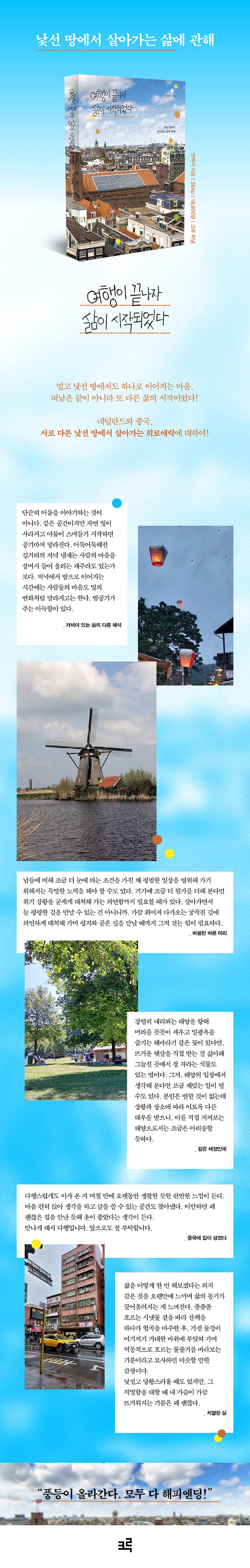ÈÞ°¡³ª ¹æÇп¡¾ß ¶°³ª´Â ¿©ÇàÁö¿¡¼ ¡®»î¡¯À» ²Ù·Á³ª°£´Ù´Â °Ç ¾î¶² ÀǹÌÀϱî. ÀÌ Ã¥Àº Àͼ÷ÇÑ ÅÍÀüÀ» ¶°³ª ³×´ú¶õµå¿Í Áß±¹À̶ó´Â ¼·Î ´Ù¸¥ dz°æ ¾Æ·¡¼ »ì¾Æ°¡´Â ¸¶À½À» Àû¾î ³»·Á°£´Ù. ´õ ³ª¾Æ°¡ ±â»Ý°ú ºÐ³ë, ±×¸®°í »ç¶û°ú ½½ÇÄÀ» »ç°èÀý¿¡ ºø´ë¾î Ç®¾î ³õ´Â´Ù. °Ü¿ï °°Àº ¿Ü·Î¿òÀÌ Áö³ª¸é ¿ì¸® ¸¶À½¿¡µµ ¾î±è¾øÀÌ º½ÀÌ Ã£¾Æ¿Àµí, ³¸¼± ¶¥¿¡¼µµ Èñ·Î¾Ö¶ôÀº À̾îÁø´Ù. Å©¸®½º¸¶½º Àú³á ÆÄƼ¸¦ ³õÄ¥ »·ÇÑ ³¹Î ¼Ò³âÀÇ ¹ß°ÉÀ½, ¦¦ÀÌ ¾ç¸»·Î ´Ù¸§À» ¹Þ¾ÆµéÀÌ´Â Çб³ÀÇ Ç³°æ, µéµéµé ¼Ò¸®¸¦ ³»¸ç µ¿³×¸¦ µµ´Â ¼ÅƲ¹ö½º±îÁö. ÀÌ·± °í¿äÇÑ Ç³°æµéÀÌ Ã¥ °÷°÷¿¡ ½º¸ç Àд Àç¹Ì¸¦ ´õÇÑ´Ù.