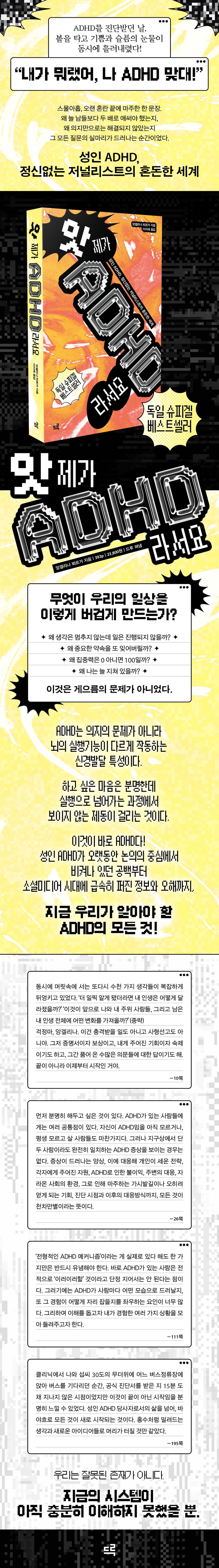 ÀÚÄ© ¡®¿Ö?¡¯¶ó´Â Áú¹®À» ´øÁú ¹ýÇÑ ÀÌ ´ë»ç·ÎºÎÅÍ ÀÌ Ã¥Àº ½ÃÀ۵ȴÙ. ÀÌ Ã¥À» ¾´ µ¶ÀÏÀÇ Àú³Î¸®½ºÆ® ¾Ó°Ö¸®³ª ºÆ¸£°Å´Â ½º¹°´Ù¼¸, ¿À·£ È¥¶õ°ú ÀÇ½É ³¡¿¡ ÀÚ½ÅÀÇ À̸§ ¿·¿¡ ºÙÀº Áø´Ü¸íÀ» ¸¶ÁÖÇÑ´Ù. ¾Èµµ¿Í ±â»Ý, µÎ·Á¿ò°ú ºÐ³ë°¡ ÇѲ¨¹ø¿¡ ¹Ð·Áµå´Â ¼ø°£À̾ú´Ù. ¿Ö ´Ã ³²µéº¸´Ù µÎ ¹è·Î ¾Ö½á¾ß Çß´ÂÁö, ¿Ö Áß¿äÇÑ ¾à¼ÓÀ» Àذí, ¿Ö »ç¼ÒÇÑ ÀÏ¿¡µµ ¿¡³ÊÁö°¡ ¹Ù´Ú³µ´ÂÁö, ¿Ö ¡®ÀÇÁöÀÇ ¹®Á¦¡¯¶ó´Â ¸»À» µé¾î¾ß Çß´ÂÁö¿¡ ´ëÇÑ ½Ç¸¶¸®°¡ ºñ·Î¼Ò ÀÌ ÂªÀº Áø´Ü¸íÀ» ÅëÇØ ³³µæµÇ¾ú´Ù. ÀÌ Ã¥Àº ÀÌ¿Í °°Àº °³ÀÎÀû °í¹é¿¡¼ Ãâ¹ßÇØ ADHDÀÇ ¿ª»ç¿Í Áø´Ü ±âÁØ, ½Å°æÇÐÀû °¡¼³°ú »çȸÀû ³«ÀαîÁö ¤¾î ³ª°£´Ù. ¡®ºÎ»ê½º·¯¿î ¾ÆÀÌ¡¯¶ó´Â ¿À·¡µÈ À̹ÌÁöºÎÅÍ ¼ºÀÎ ADHD°¡ º»°ÝÀûÀ¸·Î ³íÀǵDZâ±îÁöÀÇ °ø¹é, ±×¸®°í ¼Ò¼È¹Ìµð¾î ½Ã´ë¿¡ È®»êµÇ´Â Á¤º¸¿Í ¿ÀÇØ±îÁö Æø³Ð°Ô ´Ù·ç´Â Ã¥ÀÌ´Ù.