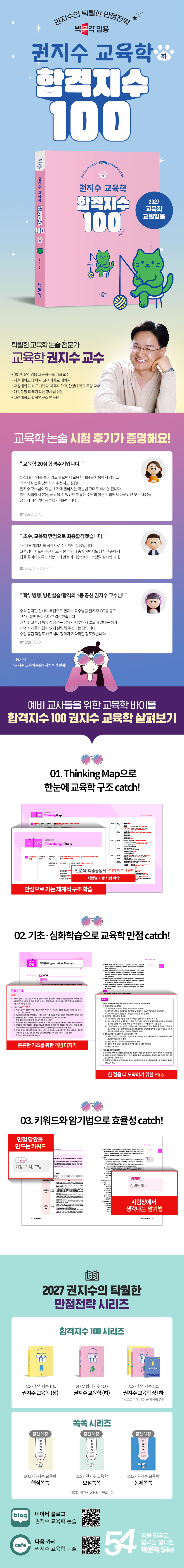 Ã¥¼Ò°³¡¶2027 ÇÕ°ÝÁö¼ö 100 ±ÇÁö¼ö ±³À°ÇÐ (ÇÏ)¡·´Â 2027Çг⵵ ±³¿ø ÀÓ¿ë ±³À°ÇÐ ³í¼ú ½ÃÇèÀ» ¿Ïº®ÇÏ°Ô ´ëºñÇÒ ¼ö ÀÖ´Â ±³À°ÇÐ ±âº»¼ÀÌ´Ù. ±³À°ÇÐÀÇ ¹æ´ëÇÑ ³»¿ë Áß ±³À°ÇÐ ³í¼ú ½ÃÇè¿¡ ÇÊ¿äÇÑ Çٽɸ¸ ¾ÐÃàÀûÀ¸·Î Á¦½ÃÇÏ¿© È¿À²¼ºÀ» ³ô¿´À¸¸ç, °¢ ºÐ°ú Çй® ¿µ¿ªº°·Î Thinking MapÀ» ¼ö·ÏÇÏ¿© ±³À°ÇÐÀÇ ±¸Á¶¸¦ źźÇÏ°Ô ÀâÀ» ¼ö ÀÖµµ·Ï ±¸¼ºÇÏ¿´´Ù. ¶ÇÇÑ ÀïÁ¡º°·Î ±âÃâ »çÇ×À» Ç¥½ÃÇØ ÃâÁ¦ ºñÁßÀ» È®ÀÎÇϸç ÇнÀÇÒ ¼ö ÀÖµµ·Ï ÇÏ¿´´Ù. ÀÌ ¹Û¿¡µµ ÀúÀÚÀÇ ³ëÇϿ찡 ´ã±ä ±â¾ï¿¡ ¿À·¡ ³²´Â ¾Ï±â¹ý°ú ³í¼ú¿¡ ÇʼöÀûÀΠŰ¿öµå´Â ¼öÇè»ýµéÀÌ ½Ã°£°ú ³ë·ÂÀ» Àý°¨ÇÏ¸é¼ ÃÖ´ëÀÇ È¿°ú¸¦ °ÅµÑ ¼ö ÀÖµµ·Ï µµ¿ï °ÍÀÌ´Ù.
