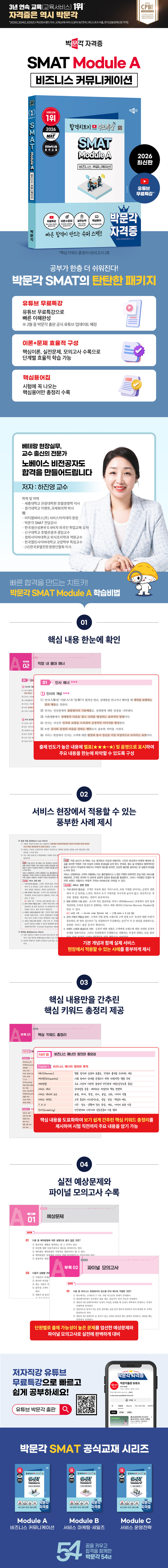 ÃâÆÇ»ç ¼Æò¹Ú¹®°¢ÃâÆÇÀÇ 2026 ¹Ú¹®°¢ SMAT Module A ºñÁî´Ï½º Ä¿¹Â´ÏÄÉÀ̼ÇÀº SMAT(¼ºñ½º°æ¿µÀÚ°Ý) ½ÃÇèÀ» ÁÖ°üÇÏ´Â Çѱ¹»ý»ê¼ºº»ºÎÀÇ ÀÎÁõÀ» ¹ÞÀº ½Å·Úµµ ³ôÀº °ø½Ä ±³Àç·Î, SMATÀÇ ÀÚ°Ý Á¾¸ñº° ÃâÁ¦ ¹üÀ§¿¡ ¸ÂÃç ¼öÇè»ýµéÀÇ ÀÌÇØ¸¦ ³ôÀÏ ¼ö ÀÖµµ·Ï °¡Àå ÀûÇÕÇÑ ³»¿ëÀ» ¼ö·ÏÇÏ¿´½À´Ï´Ù. ¶ÇÇÑ Ã¼°èÀûÀÎ ¼ºñ½º Àü¹®°¡ÀÇ ¾ç¼ºÀ̶ó´Â ¸ñÀûÀ» ´Þ¼ºÇϱâ À§ÇÏ¿© ¼ºñ½ºÀÇ À̷Рü°è¿Í ½Ç¹«¸¦ ÇÔ²² ±¸¼ºÇÏ¿´°í, ¡´ÇÙ½ÉÀÌ·Ð+½ÇÀü¹®Á¦+¸ðÀǰí»ç¡µ¸¦ ¼ö·ÏÇÏ¿© ÇÑ ±ÇÀ¸·Îµµ ÀÚ°ÝÁõÀ» ÃëµæÇÒ ¼ö ÀÖµµ·Ï ÇÏ¿´½À´Ï´Ù.