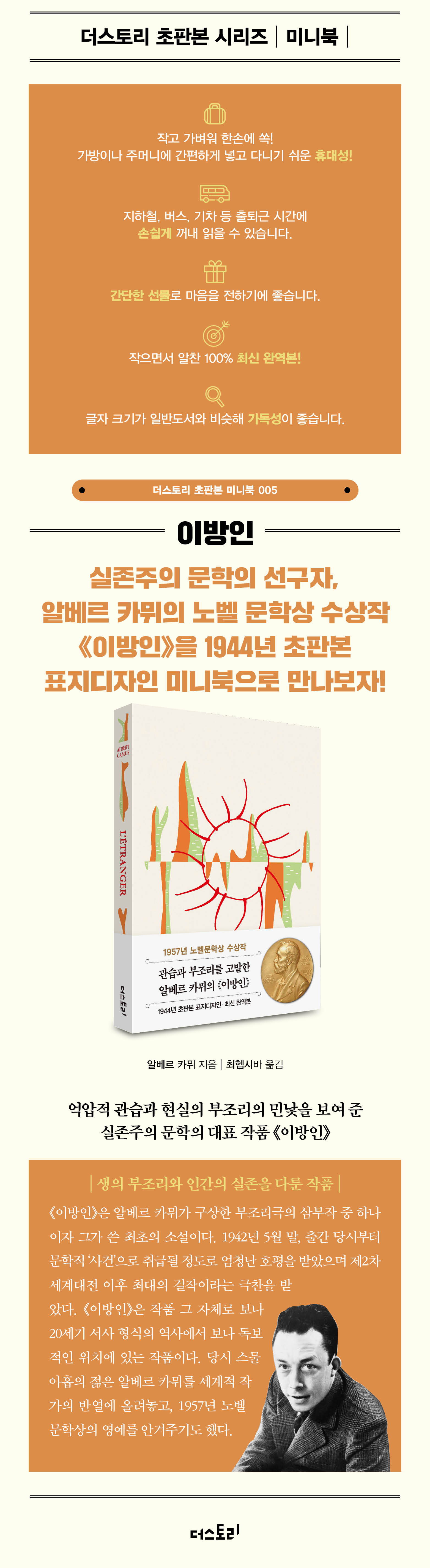 Ã¥Àº 1ºÎ¿Í 2ºÎ·Î ³ª´µ¾î ÁøÇàµÈ´Ù. Á¦1ºÎ´Â 18ÀÏ µ¿¾È ¿¬¼ÓÀûÀ¸·Î Àü°³µÇ´Â ¸þ¸£¼ÒÀÇ ¿å¸Á°ú ÁïÈïÀûÀÎ ÇൿÀ» ¼¼úÇϸç Á¦2ºÎ´Â ÀÌ ÁïÈïÀûÀÎ ¿å¸Á°ú Çൿ¿¡ ´ëÇÑ ÀçÆÇ °úÁ¤ÀÌ ´ã°Ü ÀÖ´Ù. Ä«¹¿´Â ÀÚ½ÅÀ» µÑ·¯½Ñ ¸ðµç °Íµé¿¡¼ öÀúÇÏ°Ô ¼Ò¿ÜµÈ ÀÛÁß ÈÀÚÀÎ ¸þ¸£¼ÒÀÇ »î, Á×À½¿¡ À̸£·¯¼¾ß ÀÚ±â ÀڽŰú ¼¼°è¸¦ ¸¶ÁÖÇÏ°Ô µÇ´Â ÈÀÚÀÇ ¸ð½ÀÀ» ÅëÇØ ¾ï¾ÐÀûÀÎ °ü½À°ú ºÎÁ¶¸® ¼Ó¿¡¼ »ì¾Æ°¡´Â °íµ¶ÇÑ Çö´ëÀÎÀÇ ÃÊ»óÀ» µå·¯³Â´Ù. ¿ì¸® »çȸ¿¡¼ ´ç¿¬ÇÏ°Ô ¿©±â´Â µµ´ö°ú °ü½ÀÀ» µû¸£Áö ¾Ê´Â ÁÖÀΰø ¸þ¸£¼ÒÀÇ Çൿ ¶§¹®¿¡ ³ÇØÇÑ ÀÛǰÀ̶ó´Â Æò°¡¸¦ ¹Þ±âµµ Çß´ø ¼Ò¼³ ¡¶À̹æÀΡ·À» ´õ½ºÅ丮ÀÇ 1944³â ¿À¸®Áö³Î ÃÊÆÇº» Ç¥ÁöµðÀÚÀÎ ¹Ì´ÏºÏÀ¸·Î ¸¸³ªº¸ÀÚ. ÇÑ ¼Õ¿¡ ÈÞ´ëÇϱ⠰£ÆíÇÑ ¹Ì´ÏºÏ »çÀÌÁî·Î ´©±¸³ª ¼Õ½±°Ô ÀÐÀ» ¼ö ÀÖ´Ù.