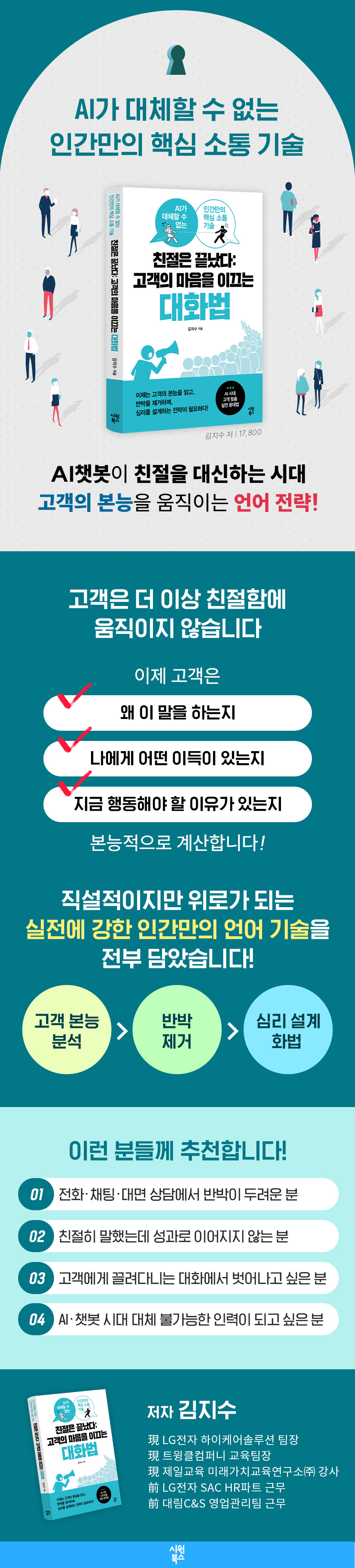 ÀÌ Ã¥Àº °í°´ ÀÀ´ë¿Í CS ¾÷¹«¸¦ ´ã´çÇÏ´Â ¼ºñ½º¡¤¼¼ÀÏÁî Á¾»çÀÚ¸¦ Áß½ÉÀ¸·Î, °í°´ÀÇ ÇൿÀ» ºÐ¼®ÇÏ°í ¿øÇÏ´Â ÇൿÀ» À̲ø¸ç Ãæ¼ºÀ» ¸¸µé¾î³»´Â ȹý ±â¼úÀ» Á¦½ÃÇÕ´Ï´Ù.