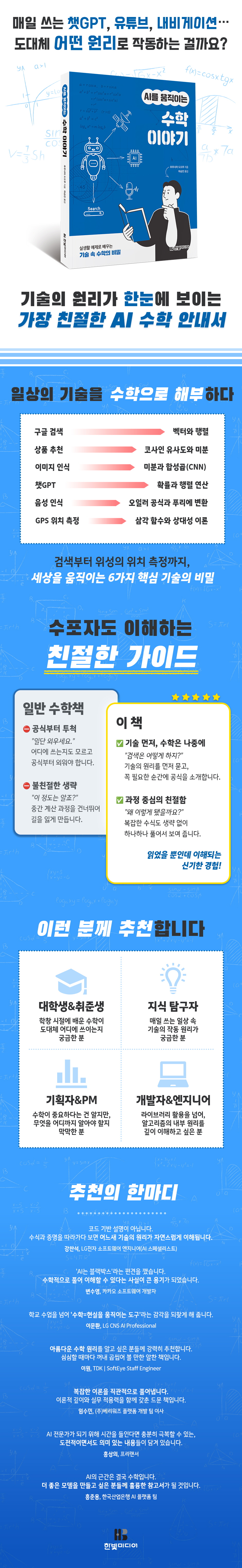 ¼öÇÐÀº ¾î·Æ°í ¸Ö¸® ÀÖ´Â °ÍÀÌ ¾Æ´Õ´Ï´Ù. °Ë»ö, Ãßõ, À̹ÌÁö ÀνÄ, À½¼º ºÐ¼®, À§Ä¡ ¼ºñ½º±îÁö ¿ì¸®°¡ ¸ÅÀÏ »ç¿ëÇÏ´Â ±â¼úÀº ¸ðµÎ ¼öÇÐÀÇ ÈûÀ¸·Î ¿òÁ÷ÀÔ´Ï´Ù. ÀÌ Ã¥Àº »ýȰ ¼Ó Ä£¼÷ÇÑ »ç·Ê·Î AI ½Ã´ë¿¡ ÇÊ¿äÇÑ ¼öÇÐÀû »ç°í·ÂÀ» ÀÚ¿¬½º·´°Ô ±æ·¯ ÁÝ´Ï´Ù. AI ¼¼»óÀ» ÀÌÇØÇÏ´Â ¿¼è¸¦ ÅëÇØ ÀÏ»ó ¼Ó ½º¸çµç ¼öÇÐÀÇ ÈûÀ» ¹ß°ßÇØ º¸¼¼¿ä. ÀÌÁ¦ ¼öÇÐÀº µÎ·Á¿òÀÌ ¾Æ´Ï¶ó »õ·Î¿î °¡´É¼ºÀÇ ¾ð¾î°¡ µÉ °ÍÀÔ´Ï´Ù.