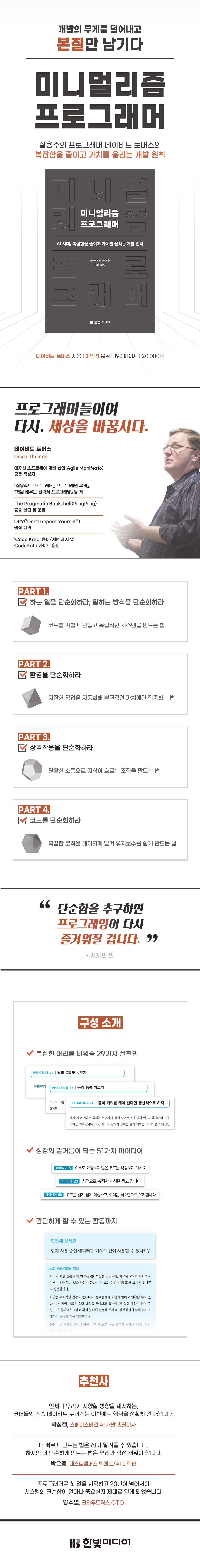 AI°¡ Äڵ带 ´ë½Å ÀÛ¼ºÇÏ´Â ½Ã´ëÀÔ´Ï´Ù. ÇÏÁö¸¸ ¾ÆÀÌ·¯´ÏÇϰԵµ ¼ÒÇÁÆ®¿þ¾î´Â ±× ¾î´À ¶§º¸´Ù ºñ´ëÇÏ°í º¹ÀâÇØÁ³½À´Ï´Ù. ¡®´õ ºü¸£°Ô, ´õ ¸¹ÀÌ¡¯¸¦ ¿ÜÄ¡´Â ¼¼»ó¿¡¼, Àü¼³ÀûÀÎ ¸íÀú ¡º½Ç¿ëÁÖÀÇ ÇÁ·Î±×·¡¸Ó¡»ÀÇ ÀúÀÚ µ¥À̺ñµå Åä¸Ó½º´Â ½ÅÀÛ ¡º¹Ì´Ï¸Ö¸®Áò ÇÁ·Î±×·¡¸Ó¡»¸¦ ÅëÇØ °³¹ßÀÚ°¡ ³ª¾Æ°¡¾ß ÇÒ Á¤¹Ý´ëÀÇ ±æ, '´Ü¼øÇÔ'À» Á¦½ÃÇÕ´Ï´Ù.