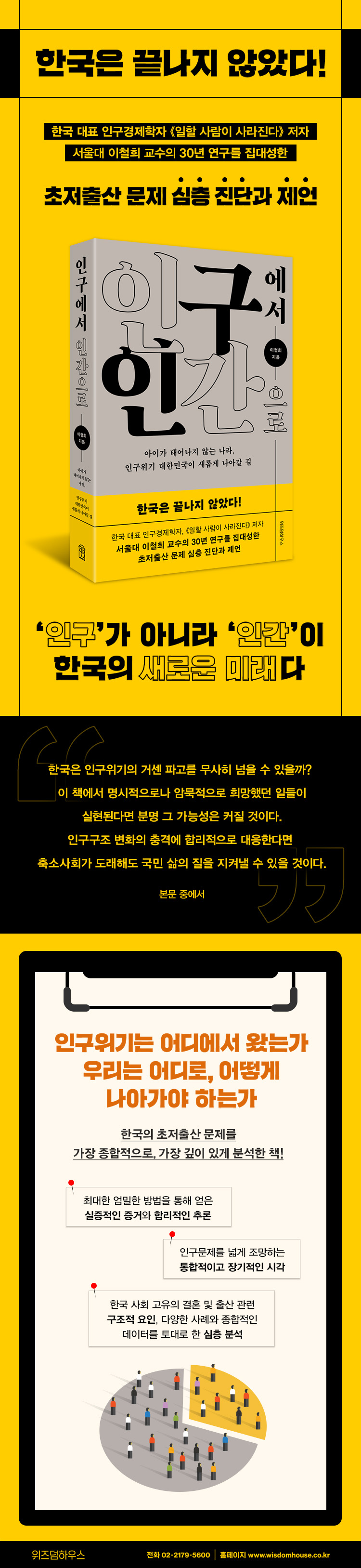¡¶Àα¸¿¡¼ Àΰ£À¸·Î¡·´Â 30³â ÀÌ»ó Àα¸°æÁ¦ÇÐÀ» ¿¬±¸ÇØ¿Â, ƯÈ÷ Áö³ 16³â°£ Çѱ¹ÀÇ °áÈ¥°ú Ãâ»êÀ» µÑ·¯½Ñ Àα¸¹®Á¦¸¦ ±íÀÌ µé¿©´Ùº¸¸ç µ¶ÀÚÀûÀÎ µ¥ÀÌÅ͸¦ ±¸ÃàÇÏ°í ¿¬±¸¿¡ ÃµÂøÇØ¿Â ÀÌöÈñ ±³¼öÀÇ ½ÉÃþ Áø´Ü°ú Á¦¾ðÀ» ÃѸÁ¶óÇÑ Ã¥ÀÌ´Ù. Àα¸ ¹× ÀúÃâ»ê À̽´¿Í °ü·ÃµÈ ¼ö¸¹Àº Ã¥, º¸°í¼, ¿µ»ó µîÀÌ ÀÖÁö¸¸ ¡¶Àα¸¿¡¼ Àΰ£À¸·Î¡·¿¡´Â ±×°Íµé°ú´Â ´Ù¸¥, °íÀ¯ÇÑ ÀåÁ¡ÀÌ ÀÖ´Ù. ù°, Àα¸¹®Á¦¸¦ ±íÀÌ ÀÌÇØÇϱâ À§ÇØ ÃÖ´ëÇÑ ¾ö¹ÐÇÑ ¹æ¹ýÀ» ÅëÇØ ¾òÀº ½ÇÁõÀûÀÎ Áõ°Å¿Í ÇÕ¸®ÀûÀÎ Ã߷п¡ ±âÃÊÇß´Ù. µÑ°, Àα¸¹®Á¦¸¦ ³Ð°Ô Á¶¸ÁÇϱâ À§ÇØ °¡´ÉÇÑ ÇÑ ÅëÇÕÀû¡¤Àå±âÀû ½Ã°¢À» °®°íÀÚ ³ë·ÂÇß´Ù. ¼Â°, Çѱ¹ÀÇ ÀϹݼº°ú Ư¼ö¼ºÀ» ±ÕÇü ÀÖ°Ô °í·ÁÇϰíÀÚ ½ÃµµÇß°í, °ÅÀÇ ¸ðµç ±Ù°Å¸¦ Çѱ¹ÀÇ °íÀ¯ÇÑ »ç·Ê¿Í µ¥ÀÌÅÍ¿¡¼ ¾ò¾ú´Ù. À̸¦ ÅëÇØ µ¶ÀÚµéÀÌ Àü¿¡ µèÁö ¸øÇß´ø »õ·Î¿î »ç½ÇÀ» ¾Ë°Ô µÇ°í, ¶Ç ¸·¿¬ÇÏ°Ô ¾Ë°í ÀÖ¾ú´ø ³»¿ëÀ» ´õ ÀÚ¼¼Çϰí È®½ÇÇÏ°Ô ÀÌÇØÇÒ ¼ö ÀÖÀ¸¸®¶ó ±â´ëÇÑ´Ù.