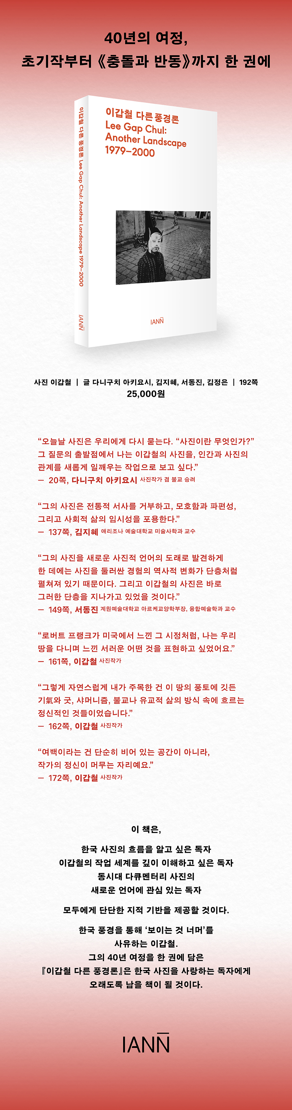 ¡ºÀ̰©Ã¶ ´Ù¸¥ dz°æ·Ð 1979-2000¡»Àº »çÁø°¡ À̰©Ã¶ÀÌ Çѱ¹ÀÇ Ç³°æÀ» ¹Ù¶ó¿Â ¹æ½ÄÀ» Á¶¿ëÈ÷ µÇ¤´Â Ã¥ÀÌ´Ù. °³ÀÎÀÇ ±â¾ï°ú ½Ã´ëÀÇ ÈçÀûÀÌ ¸¸³ª´Â ÁöÁ¡¿¡¼ ±×´Â ƯÀ¯ÀÇ °¨°¢À¸·Î Çö½ÇÀÇ ¿©·¯ ÃþÀ§¸¦ Æ÷ÂøÇØ ¿Ô´Ù. À̹ø Ã¥Àº ´Ü¼øÇÑ ÀÛǰÁýÀ» ³Ñ¾î, ÇÑ »çÁø°¡°¡ ¾î¶»°Ô ÀÚ½ÅÀÇ ¼¼°è¸¦ ±¸ÃàÇϰí Çѱ¹ »çÁøÀÇ °¨°¢À» È®ÀåÇØ ¿Ô´ÂÁö¸¦ º¸¿©ÁÖ´Â ÀÏÁ¾ÀÇ ¡®»çÀ¯ÀÇ ±â·Ï¡¯ÀÌÀÚ ¡®Ç³°æÀÇ À̷С¯À¸·Î ÀÐÈù´Ù.