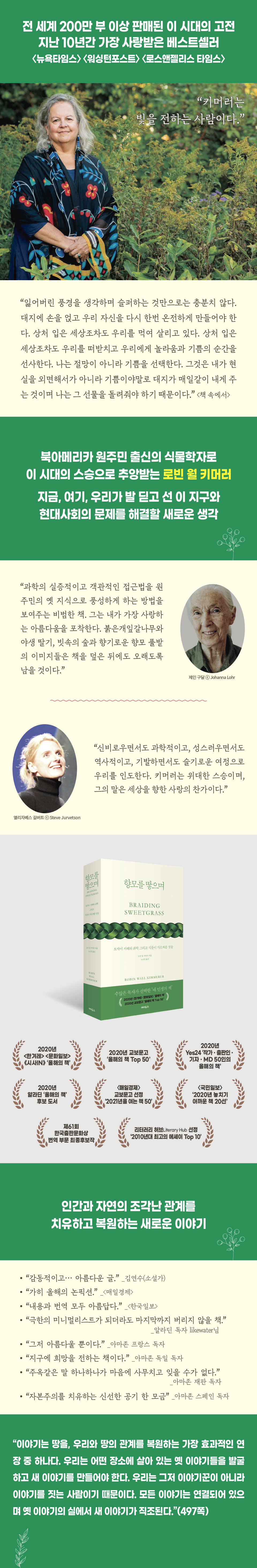 ¾ö¸¶, ½Ä¹°»ýÅÂÇÐÀÚ, ÀÛ°¡ÀÌÀÚ ´º¿åÁÖ¸³´ëÇб³ ȯ°æ»ý¹°ÇаúÀÇ Àú¸í °ÀDZ³¼öÀÌ¸ç ½ÃÆ¼Áð Æ÷Ÿ¿ÍÅä¹Ì ³×À̼ÇÀÇ ¼º¿øÀÌ´Ù. ¾Æ¸Þ¸®Ä« ¿øÁÖ¹ÎÀÎ Æ÷Ÿ¿ÍÅä¹ÌÁ· Ãâ½ÅÀ¸·Î ÀÚ½ÅÀ» Ű¿î °ÍÀº ¡®µþ±â¡¯¶ó°í ¸»ÇÑ´Ù. ÁöÀºÀÌ´Â ¹Ì±¹ ¿ª»ç¿¡¼ Áö¿öÁø Àεð¾ð ºÎÁ·ÀÇ ÀüÅë°ú ÅäÂøÀû Áö½ÄÀ» µÇ»ì·Á³» °úÇаú ¾î¶»°Ô ¿¬°áµÉ ¼ö ÀÖ´ÂÁö, Àΰ£°ú ´ëÁöÀÇ Á¶°¢³ª°í ºÎ¼Áø °ü°è¸¦ ȸº¹ÇÒ ¼ö ÀÖ´Â »õ·Î¿î Áö½ÄÀº ¾î¶² °ÍÀÎÁö¸¦ ¸ð»öÇÑ´Ù. ´º¿åÁÖ¸³´ëÇб³¿¡¼ ½Ä¹°ÇÐÀ» °øºÎÇßÀ¸¸ç, À§½ºÄܽŠ´ëÇб³¿¡¼ ½Ä¹°»ýÅÂÇÐÀ¸·Î ¹Ú»çÇÐÀ§¸¦ ¹Þ¾Ò´Ù. ù Ã¥ ¡ºÀ̳¢¸¦ ¸ðÀ¸´ÙGathering Moss¡»·Î »©¾î³ ÀÚ¿¬¹®Çп¡ ÁÖ´Â Á¸ ¹ö·Î½º ¸Þ´ÞÀ» ¼ö»óÇß´Ù. ¡¶¿À¶óÀ̾ð¡·, ¡¶È¦ ÅÍ·¹ÀΡ·À» ºñ·ÔÇÑ ¿©·¯ ÇмúÁö¿¡ ±ÛÀ» ¹ßÇ¥Çß´Ù. ´º¿å ½Ã·¯Å¥½º¿¡ »ì°í ÀÖÀ¸¸ç, ¿øÁֹΡ¤È¯°æ¿¬±¸¼Ò¸¦ ⸳ÇÏ¿© ¼ÒÀåÀ» ¸Ã°í ÀÖ´Ù. |