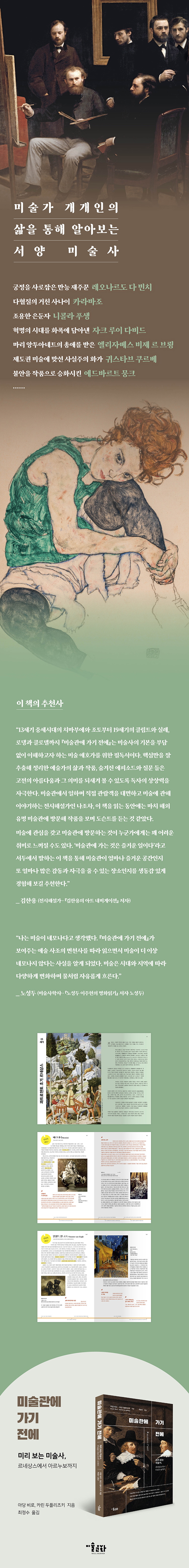¡º¹Ì¼ú°ü¿¡ °¡±â Àü¿¡¡»´Â º¸ÆíÀûÀÎ ºÐ·ù¿Í °³º°ÀûÀÎ ÁýÁßÀ» Á¦¾ÈÇÑ´Ù. ½Ã±â¿Í Àå¼Ò¿¡ µû¶ó ¼ºÇàÇÑ ¿¹¼ú »çÁ¶¸¦ ºÐ·ùÇÑ µÚ, ±×¿¡ ¼ÓÇÏ´Â ¹Ì¼ú°¡ °³°³ÀÎÀÇ »î°ú ÀÛǰ¿¡ ÃÊÁ¡À» ¸ÂÃá´Ù. ±×¸®ÇÏ¿© µ¶ÀÚ´Â ¸£³×»ó½º ¹Ì¼úÀÇ ¹ßÀü ¾ç»ó ´Ù¼¸ °¡Áö, 17¼¼±â ¹Ù·ÎÅ© ¹Ì¼úÀÇ Áö¿ªº° ¹ßÀü ¾ç»ó ¼¼ °¡Áö¸¦ ¿¬ÀÌ¾î ÆÄ¾ÇÇÒ ¼ö ÀÖ´Â °ÍÀÌ´Ù. ±× ¾È¿¡¼ µ¿½Ã´ëÀÇ ¹Ì¼ú°¡µéÀÌ ¾î¶»°Ô ¼·Î ¿µÇâÀ» ÁÖ°í¹Þ¾Ò´ÂÁöµµ ¾Ë ¼ö ÀÖ´Ù.