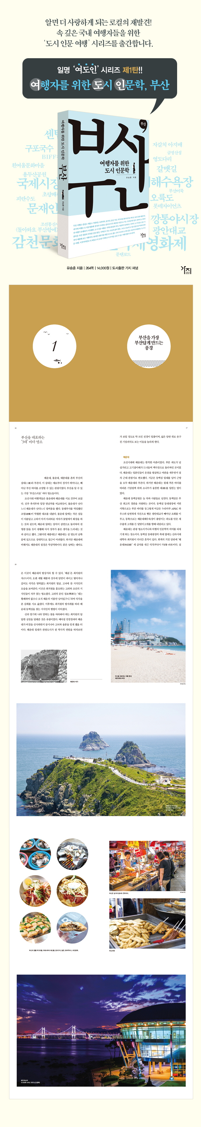 Á¶±Ý ´õ ±í¼÷ÀÌ ºÎ»ê¿¡ ´Ù°¡¼°íÀÚ ÇÏ´Â ´ç½Å¿¡°Ô ¿ì¸®¸¦ ²ø¾î´ç±â´Â ºÎ»êÀÇ Ç³°æ°ú ¸À, »ç¶÷°ú °ø°£ÀÇ ¼»ç¸¦ À̾߱âÇÏ´Ù. µµ¼ÃâÆÇ °¡Áö¿¡¼ Æì³»´Â ¡®¿©ÇàÀÚ¸¦ À§ÇÑ µµ½Ã Àι®ÇС¯, ÀÏ¸í ¡®¿©µµÀΡ¯ ½Ã¸®ÁîÀÇ Ã¹ Ã¥ÀÌ´Ù. ÀüÀÛ ¡¶ºÎ»êÀº ³Ð´Ù¡·¸¦ ÅëÇØ ºÎ»êÀÇ ¿ª»ç¿Í ¹®È¸¦ ¹Ðµµ ÀÖ°Ô ¼Ò°³Çß´ø À¯½ÂÈÆ ÀÛ°¡°¡ Àι®Àû È£±â½ÉÀÌ °ÇÑ ¿©ÇàÀÚµéÀÌ ºÎ»ê¿¡ ¿À±â Àü¿¡ Àо¾ÒÀ¸¸é ÇÏ´Â ¹ØÁö½ÄÀ» ¸ð¾Æ 55°¡Áö ½ºÅ丮ÅÚ¸µÀ¸·Î ±¸¼ºÇß´Ù. ¿ì¸®³ª¶óÀÇ ´ëÇ¥ÀûÀÎ ÇØ»ó °ü¹®À¸·Î¼ Á¶¼±½Ã´ëºÎÅÍ ÀÏÁ¦°Á¡±â, ÇØ¹æ ÈÄ Çѱ¹ÀüÀïÀ» °ÅÄ¡¸é¼ ¿ÜºÎ ¹®È¸¦ °¡Àå ¸ÕÀú Èí¼öÇϰí À¶ÇÕ, ¹ßÀü½ÃÄÑ ¿Â ºÎ»êÀÇ ¿ª»ç°¡ Ã¥ ¼Ó¿¡ ¸é¸éÈ÷ È帣´Â °¡¿îµ¥, ±×°ÍÀÌ ¿ì¸®°¡ »ç¶ûÇÏ´Â ºÎ»êÀÇ Ç³°æ°ú ¸À, Èê²ý Áö³ªÄ¡°Ô µÇ´Â °ø°£°ú ¹°°Çµé, ȤÀº °Å¼¼°í ¹«¶Ò¶ÒÇÏ´Ù°í Æò°¡¹Þ´Â ºÎ»ê »ç¶÷µéÀÇ »î¿¡ ¾î¶² ¿µÇâÀ» ¹ÌÃĿԴÂÁö¸¦ ¾Ë°Ô ÇÑ´Ù. Àͼ÷ÇÑ ÇØ¿î´ë dz°æ±îÁöµµ »ö´Ù¸¥ ½Ã¼±À¸·Î ¹Ù¶óº¸°Ô ¸¸µå´Â Ã¥, ¹Ù·Î ¡¶¿©ÇàÀÚ¸¦ À§ÇÑ µµ½Ã Àι®ÇÐ, ºÎ»ê¡·ÀÌ´Ù.