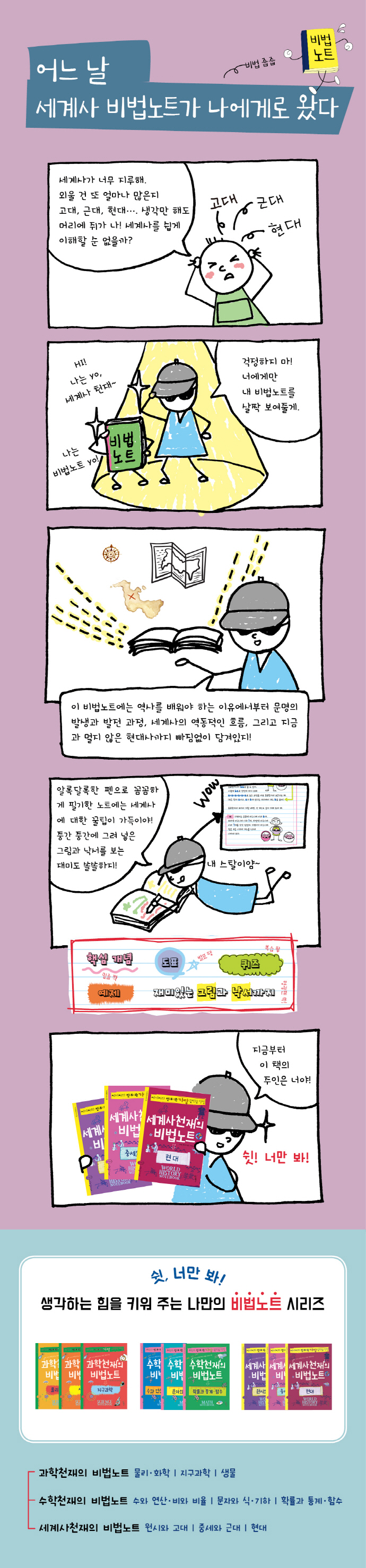 ¼¼°è»ç¿Í Ä£ÇØÁú ¼ö ÀÖ´Â ¹æ¹ýÀ» ¾Ë·ÁÁÖ´Â ¡º¼¼°è»ç õÀçÀÇ ºñ¹ý³ëÆ®: Áß¼¼¿Í ±Ù´ë¡». ¼¼°è»ç ¿µÀçµéÀÇ ³ëÆ®¸¦ Âü°íÇϰí, ¼¼°è»ç ¼±»ý´ÔÀÇ °¨¼ö¸¦ ¹Þ¾Æ ¸¸µç Ã¥À¸·Î, ¼¼°è»ç¸¦ ÀßÇϴ ģ±¸°¡ ÀÚ½ÅÀÇ ¼¼°è»ç³ëÆ®¸¦ ¾ÆÀ̵鿡°Ô ºô·ÁÁÖ´Â ÄܼÁÆ®·Î ±¸¼ºµÇ¾ú´Ù. ¿ª»çÀû »ç°ÇÀÇ ¹è°æ°ú Àǹ̸¦ ¶Ç·¡ÀÇ ¾ð¾î¿Í ´«³ôÀÌ·Î Àб⠽±°í Àç¹ÌÀÖ°Ô ¼³¸íÇϴ åÀÌ´Ù. ºñ¹ý³ëÆ® ¼Ó ÁÖ¿ä ´Ü¾î´Â Çü±¤ÆæÀ¸·Î µ¡Ä¥Çϰí, ¹Ú½º ¾È¿¡ ¼³¸íÀ» µ¡ºÙ¿© ³õ¾Æ ÀÌÇØ¸¦ µ½°í, ÁÖ¿ä Àι°°ú Àå¼Ò, ³¯Â¥, ¿ë¾î´Â ÆÄ¶õ»ö ±Û¾¾·Î Ç¥½ÃÇØ ´«¿¡ ¶çµµ·Ï Çß´Ù. Áß°£ Áß°£ ±×·Á ³ÖÀº Áöµµ, Àç¹ÌÀÖ´Â ±×¸²À̳ª ³«¼°¡ ¼¼°è»çÀÇ È帧À» ÆÄ¾ÇÇÏ´Â µ¥ µµ¿òÀ» ÁØ´Ù.