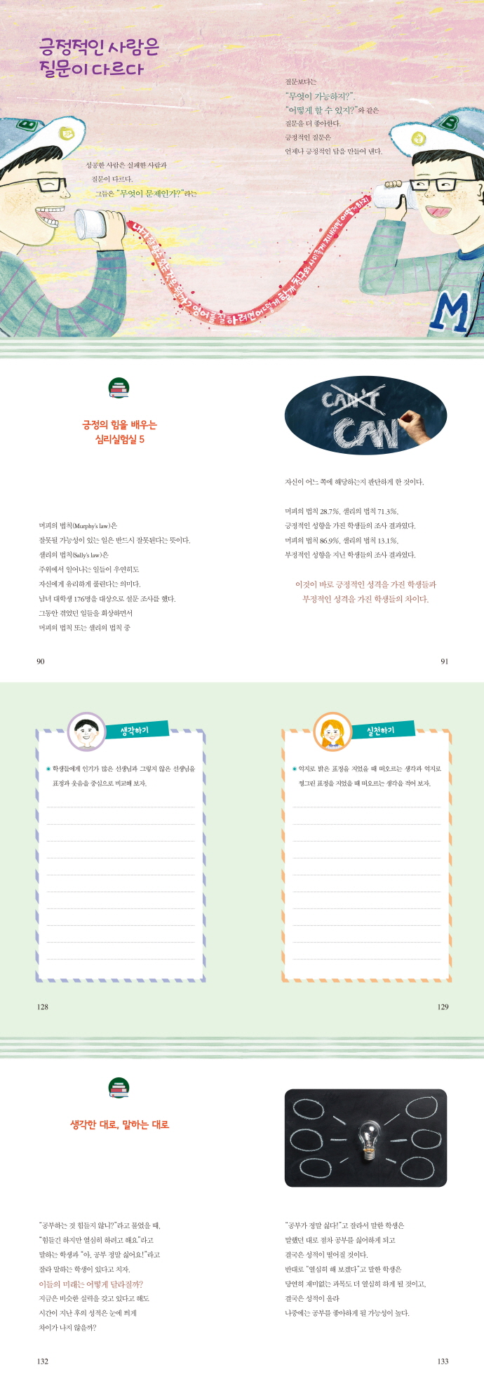 ¿¬½À ¾øÀÌ ÇÑ ¹ø¿¡ ÀߵǴ ÀÏÀº º°·Î ¾ø¾î. ¸¶Âù°¡Áö·Î ±âºÐÀ» ¸ÁÄ¡´Â »ý°¢µéµµ ¿½ÉÈ÷ ÇÏ´Ù º¸¸é ±× ¹æ¸é¿¡ µµ°¡ Æ®°Ô µÅ. Àڽſ¡°Ô ºÎÁ¤ÀûÀÎ Áú¹®À» ÇÏ¸é¼ ÀÚ½ÅÀ» ºÎÁ¤ÀûÀ¸·Î º¸´Â »ý°¢À» ÀÚ²Ù Çϸé Åõ´ú°Å¸®°í, Àý¸ÁÇϰí, Æ÷±âÇÏ´Â °Í¿¡ ´ÞÀÎÀÌ µÇ°ÚÁö._58p Çàº¹ÇØÁö°í ½Í´Ù¸é ¡®ÇູÇÒ ¼ö ÀÖ´Ù¡¯°í »ý°¢ÇØ¾ß ÇÏ°í ¼º°øÇÏ·Á¸é ¡®¼º°øÇÒ ¼ö ÀÖ´Ù¡¯°í »ý°¢ÇØ¾ß ÇØ. Çູµµ ¼º°øµµ ºÒ°¡´ÉÇÏ´Ù°í »ý°¢ÇÏ´Â »ç¶÷Àº Àý´ë·Î ³ª¾ÆÁú ¼ö ¾ø¾î._71p ´Ù¸¥ »ç¶÷ÀÌ °®Áö ¸øÇÑ °Í¿¡ ´«À» µ¹¸®¸é ³»°¡ °¡Áø °ÍÀÌ ¾ó¸¶³ª ¸¹ÀºÁö ±ú´ÞÀ» ¼ö ÀÖ¾î. ±×¸®°í ±×°ÍµéÀ» ´ç¿¬ÇÏ°Ô ¿©±âÁö ¾Ê°í °¨»çÇÏ´Â ¸¶À½ÀÌ µé°Ô µÇÁö. ¿ì¸®°¡ °®°í ÀÖ´Â °Í¿¡ °¨»çÇÏ´Â ¸¶À½ÀÌ »ý±â¸é ÀڽŰú ´Ù¸¥ »ç¶÷À» À§ÇØ ´õ ¸¹Àº ÀÏÀ» ÇÒ ¼ö ÀÖ°Ô µÅ._86p ¸ÓÇÇÀÇ ¹ýÄ¢¿¡¼ ¹þ¾î³ª·Á¸é Æò¼Ò ½À°üÀûÀ¸·Î ÇÏ´ø ºÎÁ¤ÀûÀÎ Áú¹®À» ±àÁ¤ÀûÀÎ Áú¹®À¸·Î ¹Ù²Ù¸é µÅ. ¡°¸ø¸¶¶¥ÇÑ ÀÏÀÌ ¹¹Áö?¡±¶ó°í ¹¯´Â ´ë½Å¿¡ ¡°º° ¹«¸® ¾øÀÌ Àߵǰí ÀÖ´Â ÀÏÀº ¹¹Áö?¡±¶ó°í ¹°¾îº¸¸é µÅ. ¶Ç ¡°³»°¡ °®°í ÀÖÁö ¸øÇÑ °ÍÀº ¹¹Áö?¡±¶ó´Â Áú¹®Àº ¡°³»°¡ Áö±Ý °®°í ÀÖ´Â °ÍÀº ¹»±î?¡±¶ó´Â Áú¹®À¸·Î ¹Ù²Ù¾î º¸´Â °Å¾ß._100p ¡®¾È µÈ´Ù!¡¯, ¡®½È´Ù!¡¯, ¡®¸ø ÇÑ´Ù!¡¯ µîÀÇ ºÎÁ¤ÀûÀÎ ¸»Àº ½ÇÆÐ¸¦ ºÎ¸£°í, ¡®°¡´ÉÇÏ´Ù!¡¯, ¡®ÁÁ¾ÆÇÑ´Ù!¡¯, ¡®ÇØ º¸°Ú´Ù!¡¯ µîÀÇ ±àÁ¤ÀûÀÎ ¸»Àº ¼º°øÀ» °¡Á®¿Í. ±×·¡¼ ÇൿÀ» ¹Ù²Ù·Á¸é ÀÏ´Ü ¸»ÅõºÎÅÍ ¹Ù²ã¾ß ÇØ._136p ¾çº¸°¡ ¹Ì´öÀ̶ó´Â »ç½ÇÀ» ¸ð¸£´Â »ç¶÷Àº ¾øÀ»°É? ±×·±µ¥ ¿Ö ±×·¸°Ô ¾çº¸ÇϱⰡ Èûµç °É±î? ¿Ö³ÄÇÏ¸é ¸ÕÀú ¾çº¸¸¦ ÇÏ¸é ¡®Áö´Â °Í¡¯À̶ó´Â ±×¸©µÈ »ý°¢À» Çϱ⠶§¹®À̾ß. ¡®¸ÕÀú ¾çº¸ÇÏ¸é ¼ÕÇØ¡¯¶ó´Â »ý°¢µµ ¸¶Âù°¡ÁöÁö._147p ¡®ÀÌ´ë·Îµµ ÁÁ¾ÒÀ¸´Ï±î¡¯ ¶Ç´Â ¡®Áö±Ý±îÁö º°¹®Á¦°¡ ¾ø¾úÀ¸´Ï±î¡¯¶ó´Â »ý°¢¸¸ Çϸé, »õ·Î¿î °Í¿¡ µµÀüÇÒ ¼ö ¾ø¾î. °á±¹ âÀÇÀûÀÎ »ý°¢À» ÇÒ ¼öµµ ¾øÁö. ´äÀº Çϳª°¡ ¾Æ´Ò ¼ö ÀÖ°í, ÇØ°áÃ¥µµ ´Ù¾çÇÒ °ÍÀ̶ó°í »ý°¢ÇØ º¸ÀÚ. ±×·¯¸é µüµüÇÏ°í ´Ü¼øÇÑ °íÁ¤°ü³ä¿¡¼ ¹þ¾î³ª ºÎµå·´°í ´Ù¾çÇÑ Ã¢ÀÇÀûÀÎ »ý°¢À» ÇÒ ¼ö ÀÖÀ» °Å¾ß._162p ÃâÆÇ»ç ¼Æò10´ë¸¦ À§ÇÑ ½É¸®ÇÐÀÚÀÇ ¡®±àÁ¤¡¯ ¼ö¾÷