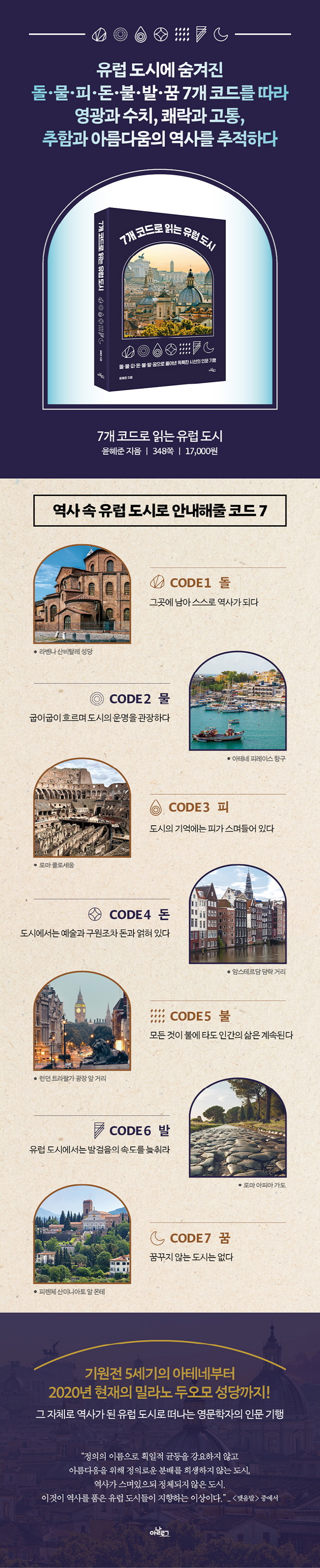 ¿©ÇàÀÇ ¹ß±æÀº ÇÑ ½Ã´ë ÇÑ °ø°£¾¿ ¸Ó¹®´Ù. ƯÁ¤ Àå¼Ò¸¦ ã¾Æ°¡ ÇöÀçÀÇ ¸ð½ÀÀ» ¹Ù¶óº¸¸ç °ú°ÅÀÇ ¸ð½ÀÀ» ¶°¿Ã¸°´Ù. ÀÌ Ã¥ÀÇ ÀúÀÚ À±ÇýÁØÀº À̰ÍÀ» ¡®À¯·´ µµ½Ã ½Ã°£¿©Ç࡯À̶ó ºÎ¸¥´Ù. µ¶ÀÚµéÀº Áö±Ý ´«¾Õ¿¡ ÀÖ´Â ¼º´ç, ±³È¸, ´Ù¸®, °¹°°ú °Å¸®¿¡¼ °ú°ÅÀÇ ¸ð½ÀÀ» º¸°Ô µÉ °ÍÀÌ´Ù. ¿ì¸®ÀÇ ¿©ÇàÀ» À̲ø¾îÁÙ ¡®°¡À̵åÀÇ ±ê¹ß¡¯Àº ºÒ¡¤ºÒ¡¤ÇÇ¡¤µ·¡¤ºÒ¡¤¹ß¡¤²ÞÀÇ 7°³ ÄÚµå´Ù. ¿µ¹®ÇÐÀÚÀÎ ÀúÀÚ´Â À¯·´ µµ½Ã ¿ª»çÀÇ °áÁ¤Àû Àå¸éµéÀ» ÇÑ Æí ÇÑ ÆíÀÇ ÂªÀº À̾߱â·Î ´ã¾Æ³Â°í, ±× À̾߱⸦ Ç®¾î³¾ ¿¼è·Î 7°³ Äڵ带 ¼³Á¤Çß´Ù. À¯·´ µµ½Ã¸¦ Àд ¹æ¹ýÀº ¼öµµ ¾øÀÌ ¸¹°ÚÁö¸¸, ÀÌó·³ µ¶Ã¢ÀûÀ̰í Èï¹Ì·Î¿î ¹æ½ÄÀº Áö±Ý²¯ ¾ø¾ú´Ù.