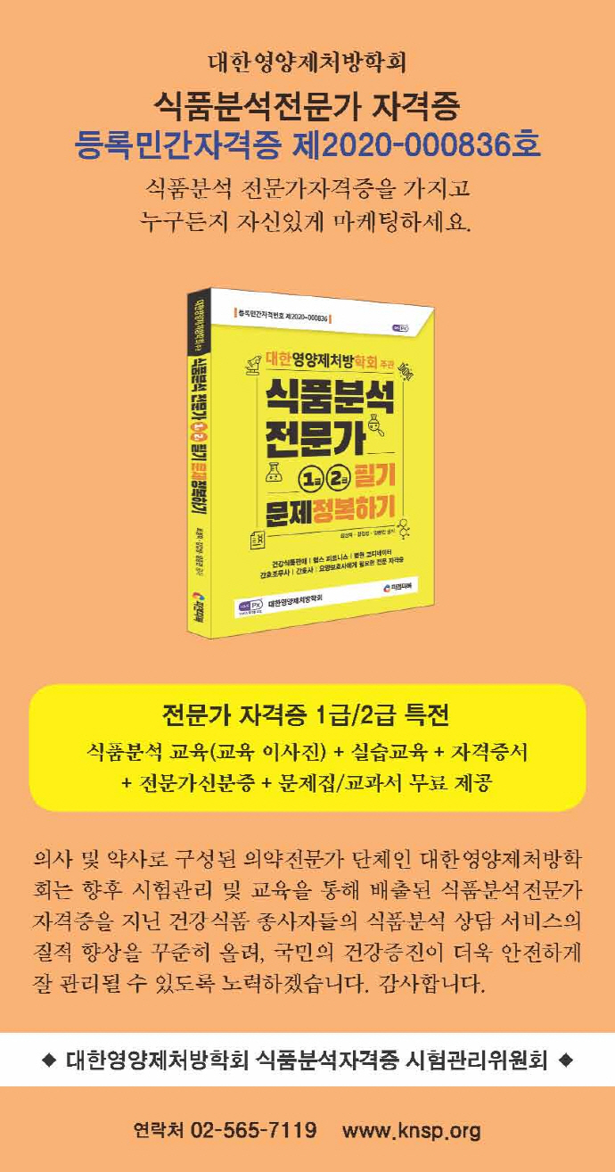 µ¿½Ã¿¡ ½ÄǰºÐ¼®Àü¹®°¡ ÀÚ°ÝÁõ(µî·Ï¹Î°£ÀڰݹøÈ£ Á¦2020-000836È£)À» °ü¸®ÇÏ´Â ÀÚ°Ý ¹ß±Þ ±â°üÀ¸·Î¼ ´ëÇÑ¿µ¾çÁ¦Ã³¹æÇÐȸ´Â ±× ¿ªÇÒ¿¡ Ãæ½ÇÇϰڽÀ´Ï´Ù.