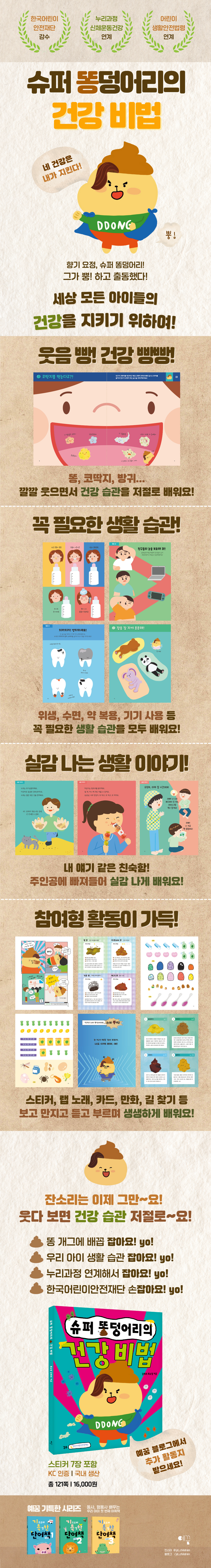 ÇÏ·çÇÏ·ç ¾ÆÀ̵éÀÇ °Ç°À» À§ÇØ °í±ººÐÅõÇÏ´Â ºÎ¸ð´ÔÀÇ ¸¶À½À» '½´ÆÛ ¶Ëµ¢¾î¸®ÀÇ °Ç° ºñ¹ý'¿¡ ´ã¾Ò½À´Ï´Ù. ¼¼»óÀÇ ¸ðµç ¾ÆÀ̵éÀ» °Ç°ÇÏ°Ô ¸¸µå´Â ¼÷¸íÀ» °¡Áö°í ÅÂ¾î³ ¿µ¿õ, ½´ÆÛ ¶Ëµ¢¾î¸®. ±×°¡ ÇØ·Î¿î ½À°üµé°ú ¼¼±Õµé·ÎºÎÅÍ ¾ÆÀ̵éÀ» ÁöÄѳ»´Â Èï¹Ì·Î¿î ½ºÅ丮´Â ¾ÆÀ̵éÀÇ ½Ã¼±À» »ç·ÎÀâ½À´Ï´Ù. ¾ïÁö·Î ½ÃŰÁö ¾Ê¾Æµµ ¾ÆÀ̵éÀÌ ¸ÕÀú ÇÏ°í ½Í¾î ÇÒ ¿ô±â°í Àç¹Õ´Â Ȱµ¿µéÀ» µû¶ó°¡´Ù º¸¸é °Ç° ¼öÄ¢À» ÀܼҸ® ¾øÀÌ Áñ°Ì°Ô ¹è¿ï ¼ö ÀÖ½À´Ï´Ù. ¸¶Ä¡ ³» À̾߱â, ¶Ç´Â ³» Ä£±¸ÀÇ À̾߱âÀÎ °Í °°Àº ½Ç»ýȰ À̾߱âµéÀ» ÀÐÀ¸¸ç, À§»ý °ü¸®, Áúº´ ¿¹¹æ, °Ç°ÇÑ ½À°ü¿¡ ´ëÇØ »ý»ýÇÏ°Ô ¹è¿ï ¼ö ÀÖ½À´Ï´Ù. ¶ÇÇÑ ½ºÆ¼Ä¿ ºÙÀ̱â, ¼± ±ß±â, ±æ ã±â µî ¿À°¨À» Ȱ¿ëÇÑ ³îÀÌ È°µ¿À» ÇÏ¸ç ¾ÈÀü ¼öÄ¢À» ¹Ýº¹Çؼ ÀÍÈ÷°í, ½Ç»ýȰ¿¡ Àû¿ëÇÏ¸ç ±ÔÄ¢À» ³»¸éÈÇÒ ¼ö ÀÖ½À´Ï´Ù. ÀÌ Ã¥Àº Çѱ¹¾î¸°ÀÌÀç´ÜÀÇ °¨¼ö¸¦ ¹ÞÀº ü°èÀûÀÎ ¾î¸°ÀÌ ¾ÈÀü ±³À° µµ¼À̸ç, ´©¸®°úÁ¤ÀÇ ½Åü °Ç° ºÎºÐ°ú ¾î¸°ÀÌ »ýȰ¾ÈÀü¹ý·É°ú ¿¬°èµÈ ³»¿ëÀ» ´ã°í ÀÖ½À´Ï´Ù.