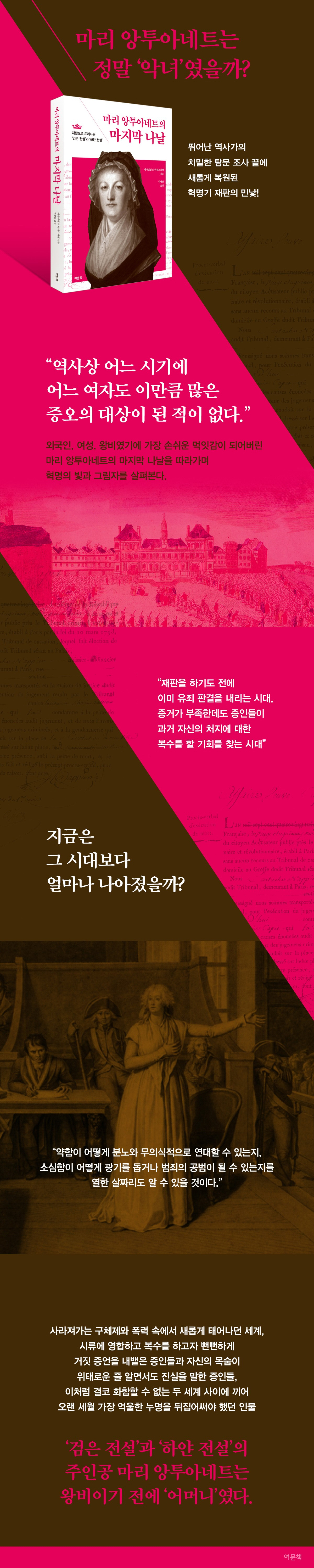 ±×µéÀº ÀÌ¹Ì ³Ê¹« ³ª°¬´Ù. ³ªÁß¿¡ ±×ÀÇ ÁöÁöÀÚ¿Í ¹Ý´ëÀÚ°¡ ¸ðµÎ ±×ÀÇ ÀçÆÇÀ» ´Ù½Ã ±×·Áº¼ ¶§ »óȲÀº ´õ¿í ³ªºüÁú °ÍÀÌ´Ù. ÁöÁöÀÚ´Â ±×°¡ Èñ»ý´çÇÑ »óóÀÇ ÈçÀûÀ» ºÐ¸íÈ÷ º¸¿©ÁÖ°íÀÚ Çß´Ù. ¹Ý¸é, ÀüÇô ´Ù¸¥ ÀÌÀ¯·Î ¹Ý´ëÀÚ´Â ±×¸¦ ´õ´Â ³Ê±×·´°Ô ´ëÇÏÁö ¾ÊÀ¸·Á°í Çß´Ù. ±×µéÀº ¿Â ÈûÀ» ´ÙÇØ °¡¸éÀ̳ª ÈÀåµµ ¾øÀÌ ÀÏÂï ´Ä¾î¼ ÈäÃøÇÏ°Ô º¯ÇÑ ±×ÀÇ ¸ð½ÀÀ» °Á¶Çϸé¼, ±×ÀÇ ¾îµÎ¿î ¿µÈ¥À» ¼¼»ó¿¡ ¾Ë¸®·Á°í ³ë·ÂÇß´Ù. Çõ¸í°¡µéÀÇ ½Ã°¢¿¡¼ º¼ ¶§, ¸¶¸® ¾ÓÅõ¾Æ³×Æ®ÀÇ À°Ã¼Àû ¸ô¶ôÀº ¿©¼º º»¼ºÀÇ ¾Ç´öÀÌ °©Àڱ⠵巯³ °Í°ú °°¾Ò´Ù. ´Ù½Ã ¸»ÇØ ÀÌ ÀçÆÇÀº ¹«¾ùº¸´Ùµµ »ó»ó·ÂÀÇ ÀçÆÇÀ̾ú´Ù. ¹Ù·Î À̰ÍÀÌ ÀÌ µå¶ó¸¶ÀÇ ÇÙ½ÉÀÌ´Ù. (66ÂÊ) °ú°ÅÀÇ ¿Õºñ°¡ °ÅÀÇ ½Å°ú °°Àº Á¸Àç¿´´ø ¸¸Å, ÆòµîÀÇ °¨Á¤ÀÌ ÀÌÁ¦´Â °£¼öµé¿¡°Ô ´Ü¼øÇÑ ±Ç¸®¸¦ ³Ñ¾î ÀÏÁ¾ÀÇ º¹¼öÀÏ »Ó¸¸ ¾Æ´Ï¶ó ¾î¼¸é ÀڽŵéÀÌ ´©±¸ÀÎÁö ÀØ°Ô ¸¸µå´Â Äè¶ôÀÌ µÇ¾ú´Ù. ¡®ºÒ¿îÇÑ Æ÷·Î¡¯ÀÇ ÁöÁöÀÚ¿¡°Ô ´ç¿¬È÷ ±×°ÍÀº ¡®ºÒÇàÀ» ¸ð¿åÇÏ´Â ÇàÀ§¡¯¿´´Ù. (86ÂÊ) ±×´Â ´Ü¼øÈ÷ ¿Õºñ°¡ µÇ´Â µ¥ ±×Ä¡Áö ¾Ê°í, [¾Æ±â¸¦ ³º´Â] ¹è, ¼¾à¼¿Í ´ãº¸, ±×¸®°í °¡Â÷ ¾øÀÌ »ý°Ü³ À¯·´ÀÇ »õ·Î¿î ¹®Á¦ÀÇ ÇÙ½É Á¶°¢ÀÌ µÉ ¿î¸íÀ̾ú´Ù. ±×´Â ÀÌ¹Ì Àû´ëÀûÀÎ ¼¼·Âµé »çÀÌ¿¡¼ ¡®±â±«ÇÑ µ¿¸Í¡¯À̶ó°í ºÒ¸®´ø °ÍÀÇ »ì¾Æ Àִ ȽÅÀ̾ú´Ù. ÀÌ ¸ðµç °ÍÀº ÇÔÁ¤ °°¾Ò´Ù. ¸¶¸® ¾ÓÅõ¾Æ³×Æ®´Â Çõ¸íÀÇ ÀÎÁúÀÌ µÇ±â ÈξÀ ÀüÀÎ 1770³â¿¡ ÀÌ¹Ì °¡¹®ÀÇ ÀÌÀͰú À¯·´ Á¤Ä¡ÀÇ Èñ»ý¾çÀ̾ú´Ù. (114ÂÊ) 10¿ù 14ÀÏ ¹è½É¿øÀÇ ¹ÙÅÁÀº ¸í¹éÈ÷ ±¸¹ÎȸÀÇÀÇ È°µ¿ÀûÀ̰í Çõ¸íÀûÀÎ »óÄþ·ÎÆ®¿´´Ù. »óÄþ·ÎÆ®°¡ ¹ÎÁßÀ» ÀǹÌÇÏ´Â ¸»À̱ä ÇØµµ, ½ÇÁ¦·Î ±×µéÀº Àý¹Ý¸¸ ¹ÎÁß¿¡ ¼ÓÇß°í, 1789³â ÇÁ¶û½º Àα¸ 2,600¸¸ ¸í °¡¿îµ¥ ¾à 5ÆÛ¼¾Æ®¿¡ ÇØ´çÇÏ´Â ¼Ò¼ö¿¡ Áö³ªÁö ¾Ê¾Ò´Ù. ¸¸¾à ±×µéÀÌ ¾î¶² °ÍÀ» »ó¡ÇÑ´Ù¸é, ±×°ÍÀº ¹Ù·Î ±× ÀÚ½ÅÀÏ »ÓÀÌ´Ù. ¾Õ¼ º¸¾ÒµíÀÌ, ¹è½É¿øµéÀº ÀçÆÇ Àü¿¡ °ø¼ÒÀÎÀÌ ¾ö¼±ÇÑ »ç¶÷µéÀ̾ú´Ù. ´ë´Ù¼ö´Â ÇÏÃþ ºÎ¸£ÁÖ¾Æ °èÃþÀÇ ÀåÀÎ, Á÷¾÷ Á¾»çÀÚ, ÆÄ¸®ÀÇ Á÷´É´Üü Ãâ½ÅÀ̾ú´Ù. ¸î¸îÀº ÆÄ¸®¿¡¼ žÁö¸¸, ´ëºÎºÐÀº 1789³â Á÷Àü ÆÄ¸®¿¡ Á¤ÂøÇß´Ù. ÀÌ¿Í °°Àº »çȸÀû ´Ù¿øÈ, 18¼¼±â ÈÄ¹Ý ÆÄ¸®ÀÇ Á÷¾÷ ±³Ã¼¿Í ÀçÆíÀÌ ºÎºÐÀûÀ¸·Î Çõ¸íÀÇ »Ñ¸®°¡ µÇ¾ú´Ù°í º¼ ¼ö ÀÖ´Ù. (158~159ÂÊ) °á·ÐÀûÀ¸·Î ¸¶¸® ¾ÓÅõ¾Æ³×Æ®¿¡°Ô ³²ÆíÀº Áö·çÇÑ Á¸Àç¿´´Ù. ±×ÀÇ ·ºÅð¸£lecteur[Ã¥ ÀоîÁÖ´Â »ç¶÷]ÀÎ ÃæÁ÷ÇÑ ½ÅºÎ º£¸£¸ùVermondÀº ±×°¡ ³²ÆíÀ» »ç¶ûÇÏÁö ¾Ê¾ÒÀ¸¸ç, ¿ÕÀÇ µÊµÊÀ̸¦ ¾Ë¸é ´Þ¸® ÇൿÇϱ⠾î·Á¿üÀ» °ÍÀ̶ó°í ¼ÖÁ÷È÷ ¸»Çß´Ù. (196~197ÂÊ) ¸¶¸® ¾ÓÅõ¾Æ³×Æ®´Â ¡®¿©¼ºÀÇ ¼¼°èmundus muliebris¡¯ÀÇ ¿©¿ÕÀÌ µÇ¾ú´Ù. ÀÌ ¡®¿©¼ºÀÇ ¼¼°è¡¯¶ó´Â Çdzó¿¡¼´Â ÇüÅÂ¿Í ½ºÅ¸ÀÏ, Æ®¸®¾Æ³óÀÇ ±¤±â¿Í ¶ûºÎÀÌ¿¹ ³«³óÀå, ÆøÆ÷¿Í µ¿±¼, ¼ø¼öÇÔ, ¿ì¾ÆÇÔ, ³î¶ó¿ò, ÀÚ¿¬, À¯ÀûÀÇ ±â¾ïÀÌ Åº»ýÇß´Ù. ÀÌ ¸ðµÎ°¡ ¿©¼ºÀÇ ¿å¸ÁÀ̾ú°í, ´ç½Ã öÇÐÀÚ¿Í µ¶½ÇÇÑ ½ÅÀÚ¸¦ ºñ·ÔÇØ ±× ½ÃÀý¿¡ ³²¼ºÀÇ ´ö¸ñÀ» ÁÖÀåÇÏ¸ç ¾ÆÅ׳׺¸´Ù ·Î¸¶³ª ½ºÆÄ¸£Å¸¸¦ ¼±È£ÇÏ´ø À̵éÀÇ Å« Ãæ°Ý°ú ºÐ³ë¸¦ ºÒ·¯ÀÏÀ¸Ä×´Ù. (Áß·«) ¿ª¼³ÀûÀÎ Á¡Àº, ÀÌ ¸ðµç °Í¿¡¼ ¡®¿À½ºÆ®¸®¾Æ ¿©ÀΡ¯ÀÌ ¾î´À ¶§º¸´Ù ´õ ÇÁ¶û½º ¿©¼º´ä´Ù´Â °ÍÀ̾ú´Ù. (Áß·«) °á±¹, ¿À´Ã³¯ ¿ì¸®°¡ ¡®ÇÁ¶û½º½Ä ÃëÇ⡯À̶ó°í ºÎ¸£´Â °ÍÀº ¹Ù·Î ¸¶¸® ¾ÓÅõ¾Æ³×Æ®¿´´Ù. (200~201ÂÊ) ǪŰ¿¡ ÅʺôÀÌ ¸¶Áö¸øÇØ ¼±ÅÃÇÑ º¯È£»çµéµµ Çõ¸í¹ý¿øÀÌ Ã¢¼³µÇ¾úÀ» ¶§ºÎÅÍ ¹è¼ÓµÈ »ç¶÷µé·Î¼, º¯·ÐÇÒ ¶§ ¸¶ÁÖÇÏ´Â ÆÇ»çµé°ú º»ÁúÀûÀ¸·Î °°Àº »çȸ °èÃþ¿¡ ¼ÓÇØ ÀÖ¾ú´Ù. 1789³âÀÇ ÀÌ»óÀ» ÁöÁöÇÏ´Â °ÍÀº ¾î´À ƯÁ¤ Áö¿ªÀ̳ª °èÃþÀÇ ¹®Á¦°¡ ¾Æ´Ï¾úÀ¸¸ç, ¶ÇÇÑ Á¦3½ÅºÐÀÎÁö Ư±Ç °èÃþÀÎÁö ÇÏ´Â »çȸÀû ¼º°Ý¿¡ µû¶ó °áÁ¤µÈ ¹®Á¦µµ ¾Æ´Ï¾ú´Ù. Çõ¸íÀº °¡Àå º¸À߰;ø´Â »ç¶÷ºÎÅÍ °¡Àå ³ôÀº °è±Þ±îÁö, ¸ðµç »çȸ °èÃþÀÇ »î¿¡ ±í¼÷ÀÌ ½º¸çµé¾úÀ¸¸ç, ½ÉÁö¾î °¡Á· ³»ºÎ¿¡¼µµ ±×·¯Çß´Ù. ÀÌ·¯ÇÑ Çö»óÀº 1815³â, 1940³â, 1945³âÀÇ ´ëÀ§±â¿¡¼µµ ¹Ýº¹µÇ¾ú´Ù. (262~263ÂÊ) ¼îº¸ ¶ó°¡¸£µåÀÇ º¯·Ð Áß ³²¾Æ ÀÖ´Â ´ÜÆíµéÀ» Àо¸é, ¶Ù¾î³ Çü»ç º¯È£»çÀÎ ±×°¡ ±â¼ÒÀÎ ÃøÀÇ Áõ°Å°¡ ¸÷½Ã ºÎ½ÇÇÏ´Ù´Â »ç½ÇÀ» ³¯Ä«·Ó°Ô ÁöÀûÇßÀ½À» ¾Ë ¼ö ÀÖ´Ù. ±×´Â ÀÌ·¸°Ô Æ÷¹®À» ¿¾ú´Ù. ¡°±â¼Ò°¡ ºÐ¸íÈ÷ ¾öÁßÇÏ°Ô º¸ÀÔ´Ï´Ù¸¸, Áõ°ÅÀÇ È¿·ÂÀÌ ¸÷½Ã Àǽɽ