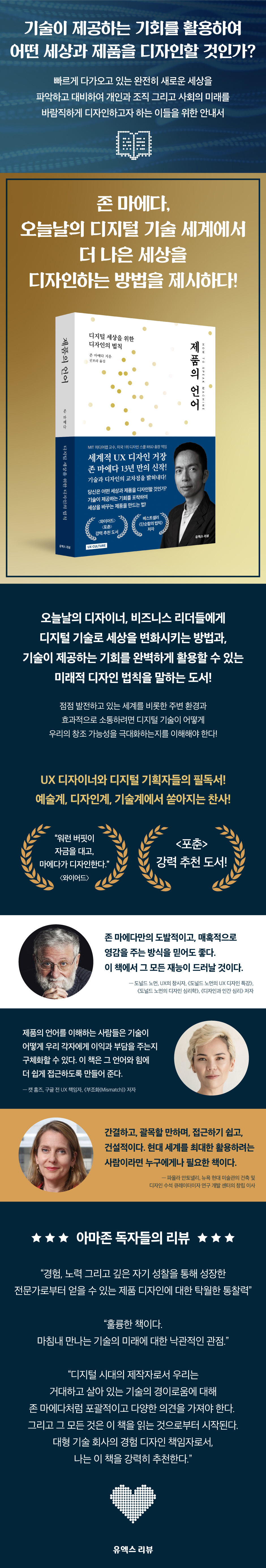 Ã¥¼Ò°³¼¼°èÀû µðÀÚÀÎ ¸®´õÀÌÀÚ UXÀÇ ¼±±¸ÀÚ Á¸ ¸¶¿¡´Ù°¡ 13³â ¸¸¿¡ ³»³õÀº ½ÅÀÛÀ¸·Î, UXÀÇ Ã¢½ÃÀÚ·Î ¾Ë·ÁÁø µµ³Îµå ³ë¸ÕÀÌ ¹Ì·¡¸¦ ´ëºñÇÏ´Â µðÀÚÀÌ³Ê¿Í °³¹ßÀڵ鿡°Ô °·Â ÃßõÇÑ Ã¥ÀÌ´Ù. ¹Ì±¹ 1À§ µðÀÚÀÎ ´ëÇÐ ·Îµå¾ÆÀÏ·£µå µðÀÚÀνºÄð ÃÑÀå°ú MIT ¹Ìµð¾î·¦ ±³¼ö¸¦ ¿ªÀÓÇÑ ¼¼°èÀû UX µðÀÚÀ̳ʷΠÇаè¿Í ºñÁî´Ï½º¸¦ µÎ·ç °æÇèÇØ¿Â Á¸ ¸¶¿¡´Ù°¡ ±â¼ú, ¿¹¼ú, µðÀÚÀÎÀÇ ±³Â÷Á¡¿¡¼ ½Ã´ë¸¦ ¾Õ¼´Â ¹æÇâÀ» Á¦½ÃÇÑ´Ù. ±×´Â ÀÌ Ã¥¿¡¼ µðÁöÅÐ ½Ã´ë¿¡ ÇÊ¿äÇÑ µðÀÚÀÎÀÇ ¹ýÄ¢À» ¹àÈ÷°í ÀÖÀ¸¸ç ¹Ì·¡Àû µðÀÚÀÎÀ» À§ÇÑ ¡°ÄÄÇ»ÆÃ »ç°í¡±¸¦ ½±°Ô ÀÌÇØ½ÃÄÑ ÁØ´Ù. ¶Ç ¼¼°è¸¦ ¼±µµÇÏ´Â ±â¾÷µé¿¡¼ µðÀÚÀÎ °æ¿µÀÚ·Î ÀÏÇÏ¸ç ±ú´ÞÀº À¶ÇÕÀû »ç°íÀÇ º»ÁúÀ» ´Ù¾çÇÑ »ç·Ê¿Í ÇÔ²² ¼³¸íÇÏ¸ç ±â¼ú°ú µðÀÚÀÎÀÇ ¿¬°á°í¸®ÀÎ ¡°Á¦Ç°ÀÇ ¾ð¾î¡±°¡ ¿Ö Áß¿äÇÑÁö ±ú´Ý°Ô ÇØÁØ´Ù. ¹Ì·¡ ÀÎÀçÀÇ ÇÙ½É Á¶°ÇÀÎ ¡°µðÁöÅÐ ¹®Çط¡±ÀÇ ÀÔ¹®¼¶ó ÇÒ ¼ö ÀÖ´Â ÀÌ Ã¥Àº Á¡Á¡ ½º¸¶Æ®ÇØÁö´Â Á¦Ç°µé°ú ¼ÒÅëÇÏ°í ±×·± Á¦Ç°µéÀ» µðÀÚÀÎÇϱâ À§ÇÑ ¿ø¸®µéÀ» °¡¸£ÃÄÁÖ¸ç, µðÁöÅÐ ½Ã´ë¿¡ ´ëÇÑ ±íÀº ÀÌÇØ¸¦ ÅëÇØ ¿µ°¨°ú ¾ÆÀ̵ð¾î¸¦ ÁÙ °ÍÀÌ´Ù. ±â¼ú°ú µðÀÚÀÎÀÇ ¿¬°á°í¸®ÀÎ ¡°Á¦Ç°ÀÇ ¾ð¾î¡±¸¦ âÁ¶Çؿ ¸¶¿¡´ÙÀÇ »ý°¢À» ÅëÇØ ¹Ì·¡ µðÀÚÀÎÀÌ ³ª¾Æ°¡¾ß ÇÒ ¹æÇâÀ» »ìÆìº¸ÀÚ.