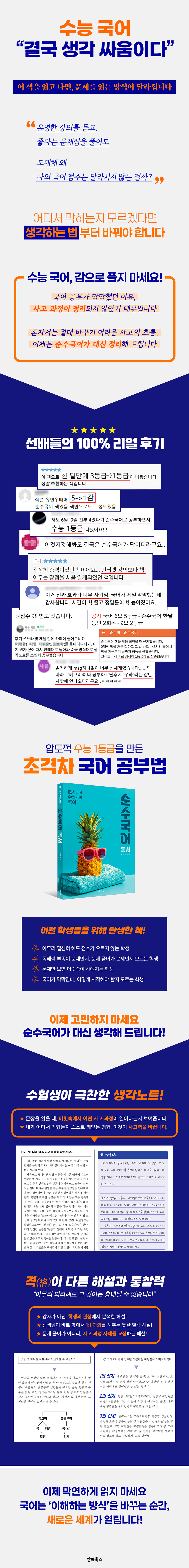 ¡º¼ø¼ö±¹¾î µ¶¼¡»´Â ³ë·Â¿¡ ºñÇØ Á¡¼ö°¡ ±â´ë¸¸Å ¿À¸£Áö ¾Ê¾Æ ´ä´äÇß´ø ¼öÇè»ýµéÀÌ ¼ø½Ä°£¿¡ ¸¸Á¡ÀÇ ±Ëµµ¿¡ ÁøÀÔÇÒ ¼ö ÀÖµµ·Ï ¼³°èµÈ Ã¥ÀÌ´Ù. ¼ö³â°£ ¼öÇè»ýµé¿¡°Ô ²ÙÁØÇÑ »ç¶ûÀ» ¹Þ¾Æ ¿Â ¡º¼ø¼ö±¹¾î¡» ½Ã¸®Áî µ¶¼ ÆíÀÇ 2026³â °³Á¤ÆÇÀ¸·Î, º¹ÀâÇÑ À̷п¡ ¸Å¸ôµÇÁö ¾Ê°í ½ÇÀü¿¡¼ Áï°¢ÀûÀ¸·Î Ȱ¿ëÇÒ ¼ö ÀÖ´Â »ç°í ü°è¸¦ ¸¸µå´Â µ¥ ÃÖÀûÈµÈ ±³Àç´Ù.