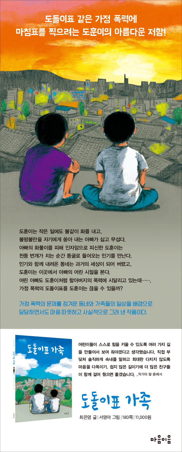 ÃÖÀº¿µ ÀÛ°¡´Â ¾ÆÀ̵éÀ» ³»Ä¡´Â Æø·ÂÀÇ ±Ù¿ø, ´ë¹°¸²µÇ´Â »Ñ¸® ±íÀº °¡Á¤Æø·ÂÀÇ Çö»óÀ»¡ºµµµ¹ÀÌÇ¥ °¡Á·¡»¿¡ ´ã¾Ò´Ù. ºÎ¸ðÀÇ ÈÇ®ÀÌ ´ë»óÀÌ µÇ´Â ¾ÆÀÌ´Â ÈûÀÌ ¾ø¾î ÀúÇ×ÇÏÁö ¸øÇÏ°í ¸¶À½¿¡ ȸ¸ °¡µæ ǰÀ¸¸ç ÀÚ¶õ´Ù. ÀÌ·¸°Ô ÀÚ¶õ ¾ÆÀÌ´Â Æø·ÂÀ» °æ¸êÇϸ鼵µ Æø·ÂÀ» Èֵθ£´Â ¾î¸¥ÀÌ µÇ±â ½±´Ù. ÇҾƹöÁö, ¾Æºü, µµÈÆÀ̱îÁö, »ï´ëÀÇ À̾߱⸦ ÅëÇØ¼ µ¶ÀÚµéÀº °¡Á¤Æø·ÂÀÇ ¹®Á¦¿Í Æø·Â¿¡ »óó¹Þ´Â °¡Á·µéÀÇ ¸ð½ÀÀ» º¸°Ô µÈ´Ù. ¹«¾ùº¸´Ù ÀÛ°¡ÀÇ ¸»¿¡¼ ´À³¥ ¼ö ÀÖµíÀÌ ÀÌ ÀÛǰÀÇ ¹Ì´öÀº °¡Á¤Æø·ÂÀ» °í¹ßÇÏ´Â µ¥ ±×Ä¡Áö ¾Ê°í, ÁÖÀΰø µµÈÆÀÌó·³ ¼öµ¿ÀûÀ̾ú´ø ¾î¸° µ¶ÀÚµéÀÌ ½º½º·Î Àڱ⸦ º¸È£ÇÒ ¼ö ÀÖ´Â ¿ë±â¸¦ ¾ò´Â °ÍÀÌ´Ù.